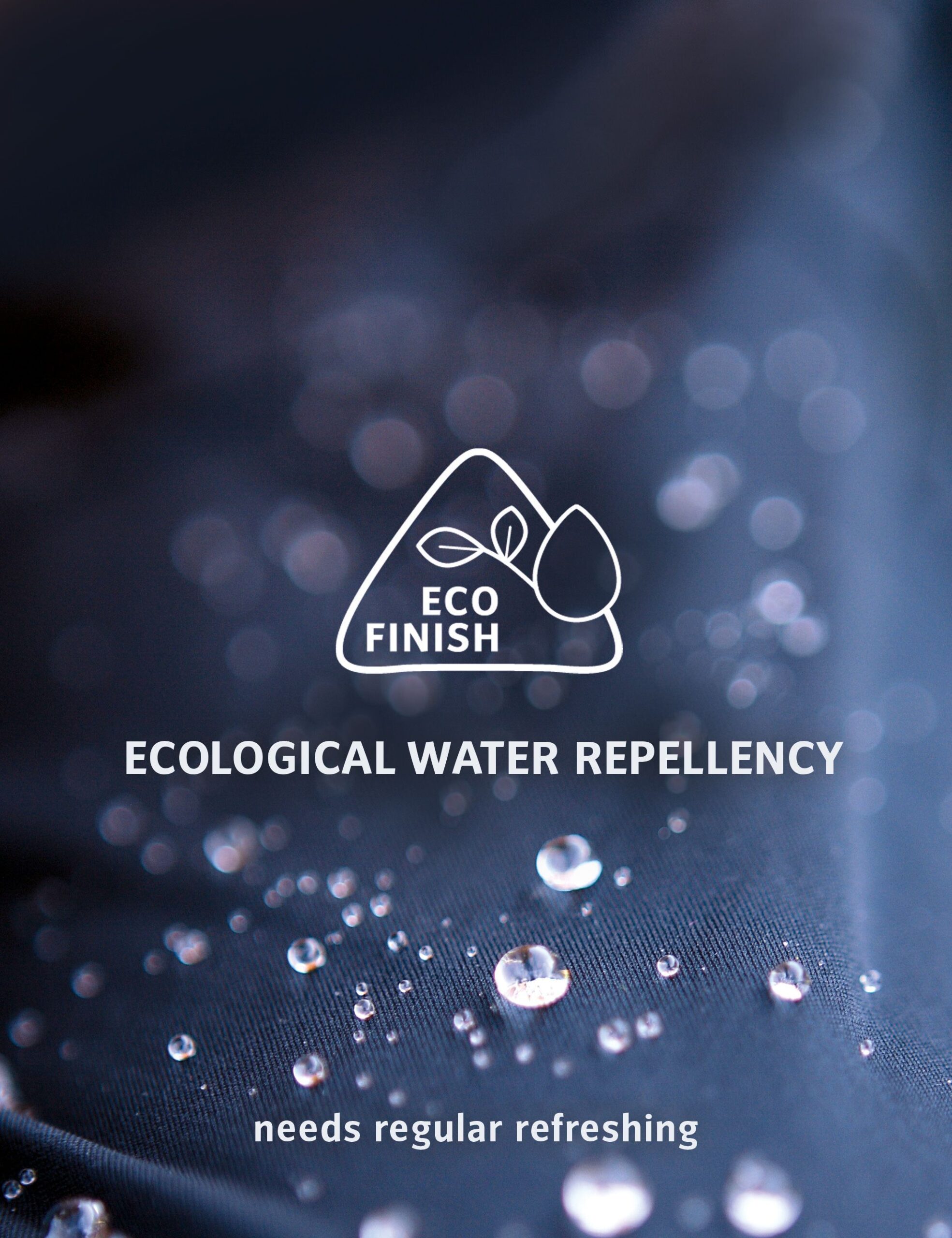 | ECO FINISH | Cette finition repousse l’eau et les salissures. Elle est déposée sur le tissu extérieur afin que l’humidité perle et ruisselle sans pénétrer (sans PFC). Cela protège de la pluie tout en préservant l’environnement. Un ré-entretien régulier est recommandé pour maintenir l’imperméabilité et la protection contre les taches. |