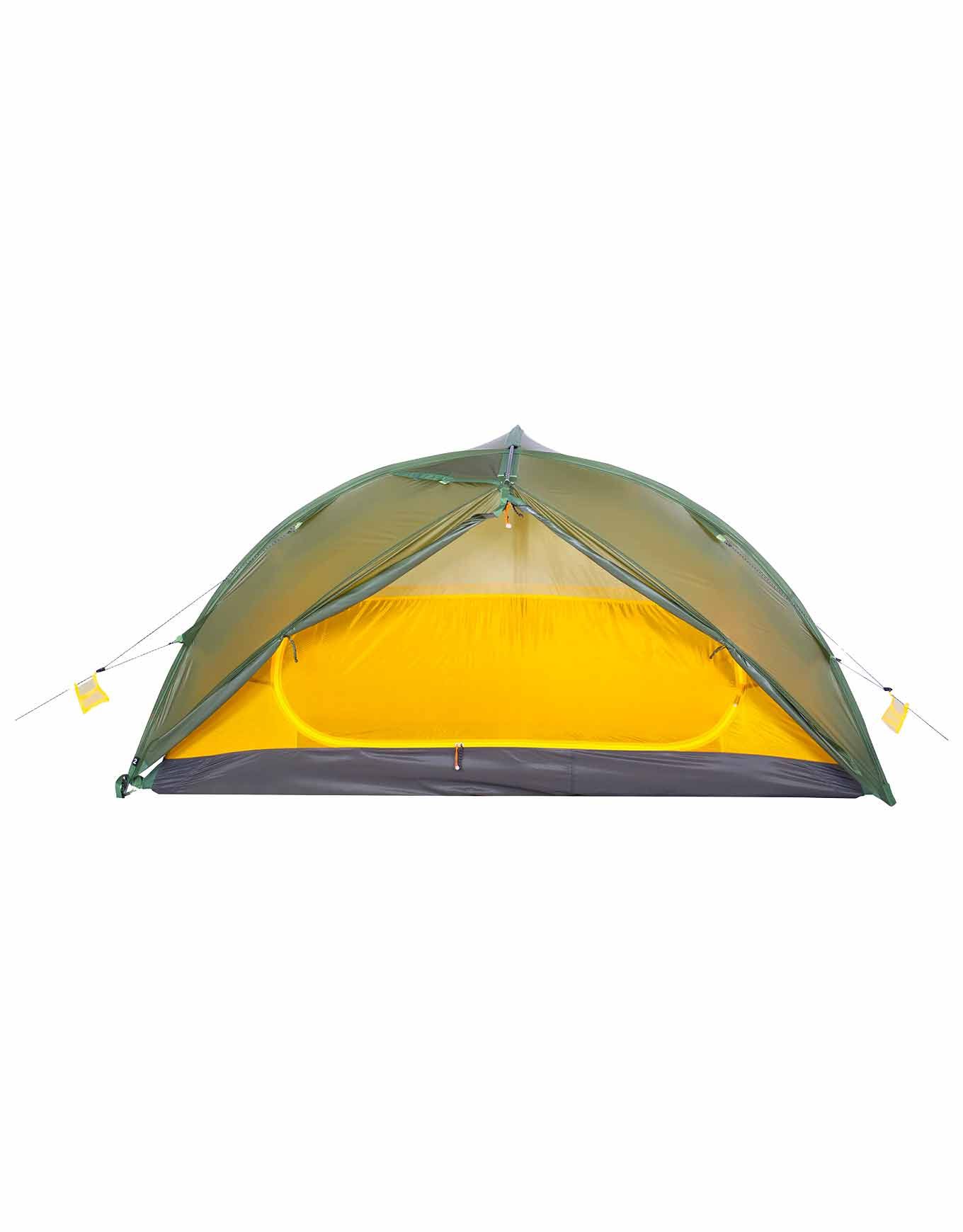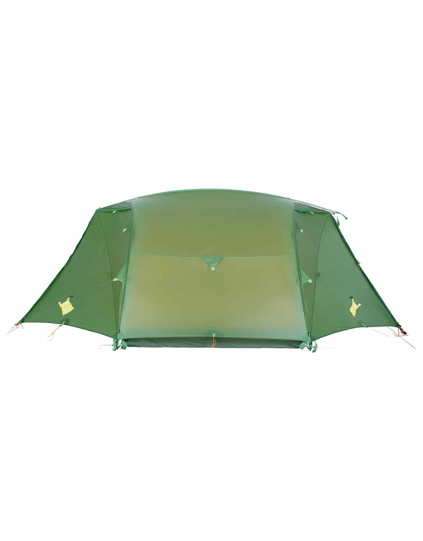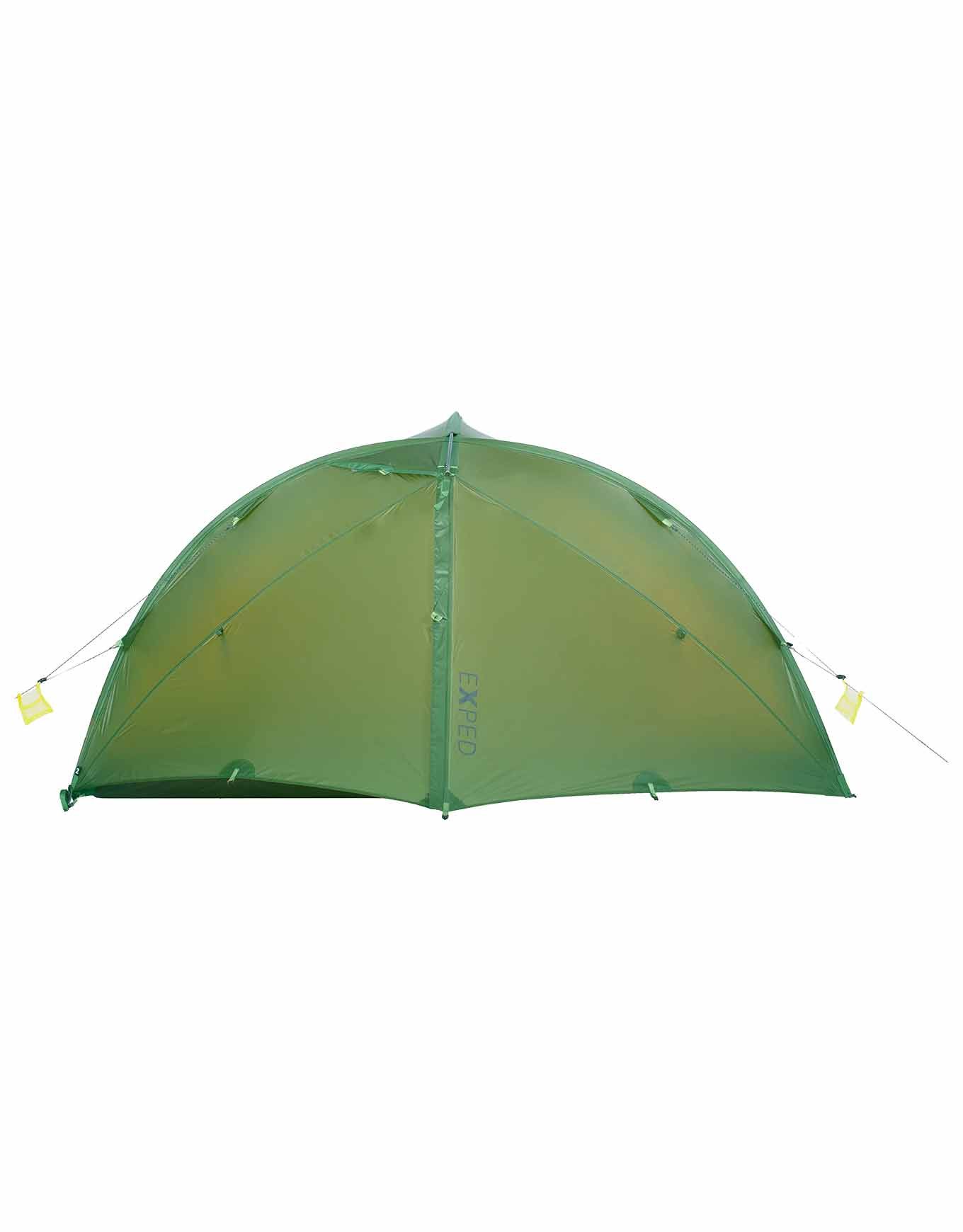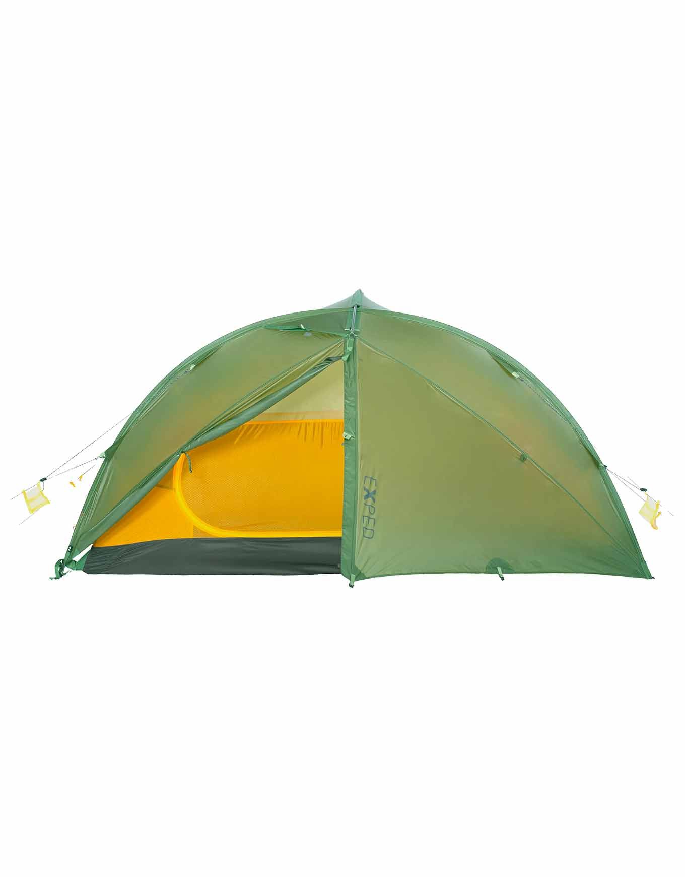 Tente de trekking 4 saisons Exped Venus II UL Moss ultra-légère en nylon ripstop 15D silicone, 2 places, 2 entrées et 2 absides spacieuses, coutures collées étanches, ventilation réglée, poche Gear Loft intégrée.