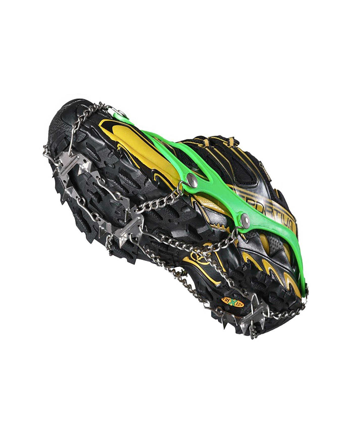 Une bande élastomère en silicium a été intégrée par Nortec pour garantir une fusion parfaite entre le crampon et la chaussure, offrant ainsi une adhérence maximale accompagnée d’un ajustement rapide et confortable. L’adhérence est optimisée grâce à une chaîne torsadée divisée en 8 segments, qui empêche la libération de l’élastomère.