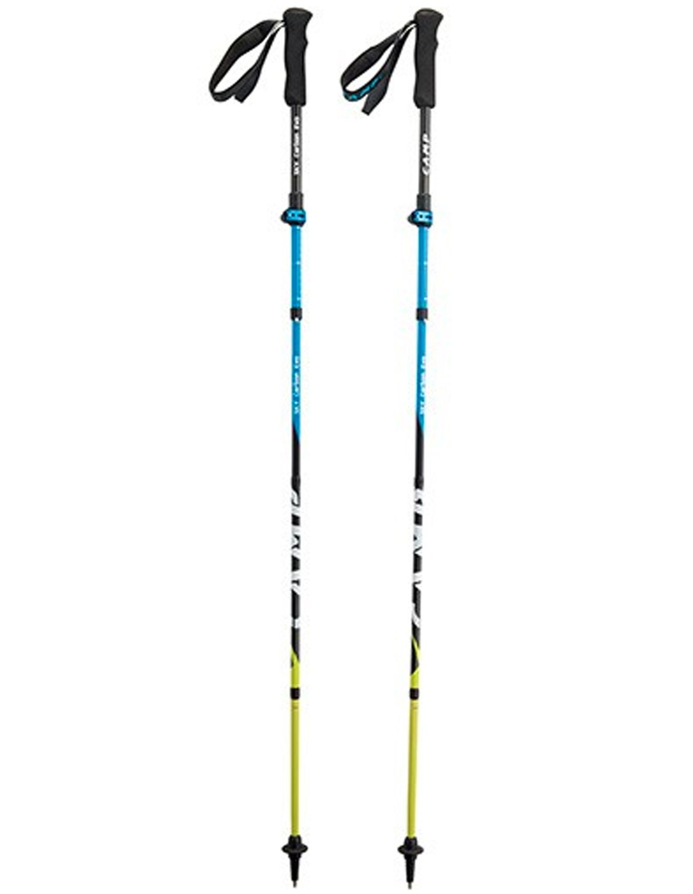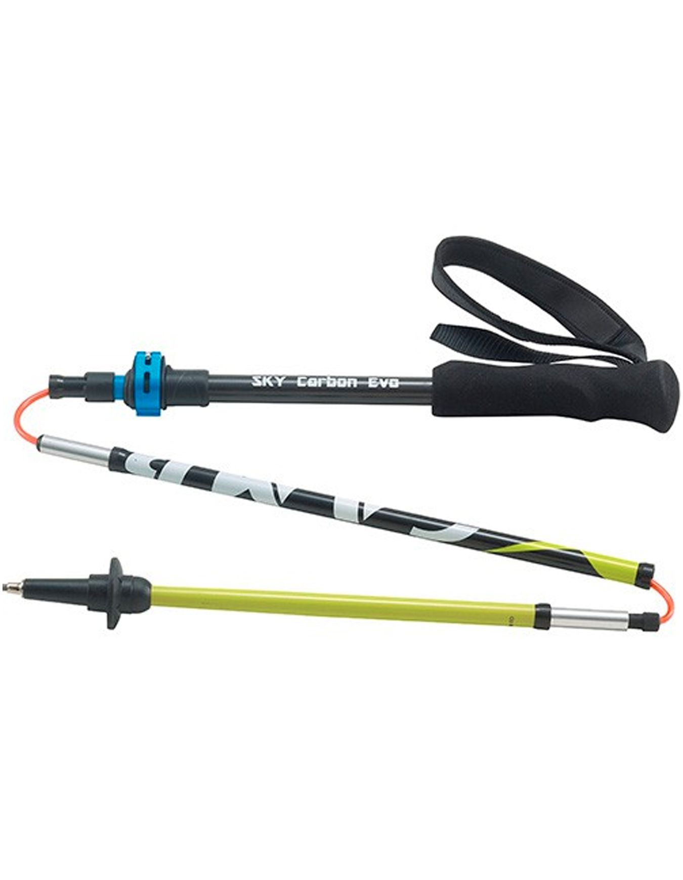 Bâton de trail Camp Sky Carbon Evo, pliable et ultra-léger en fibres de carbone et aluminium, réglable 115-135 cm par tension micrométrique interne, verrouillage rapide par clip aluminium, dragonnes asymétriques et housse incluses.