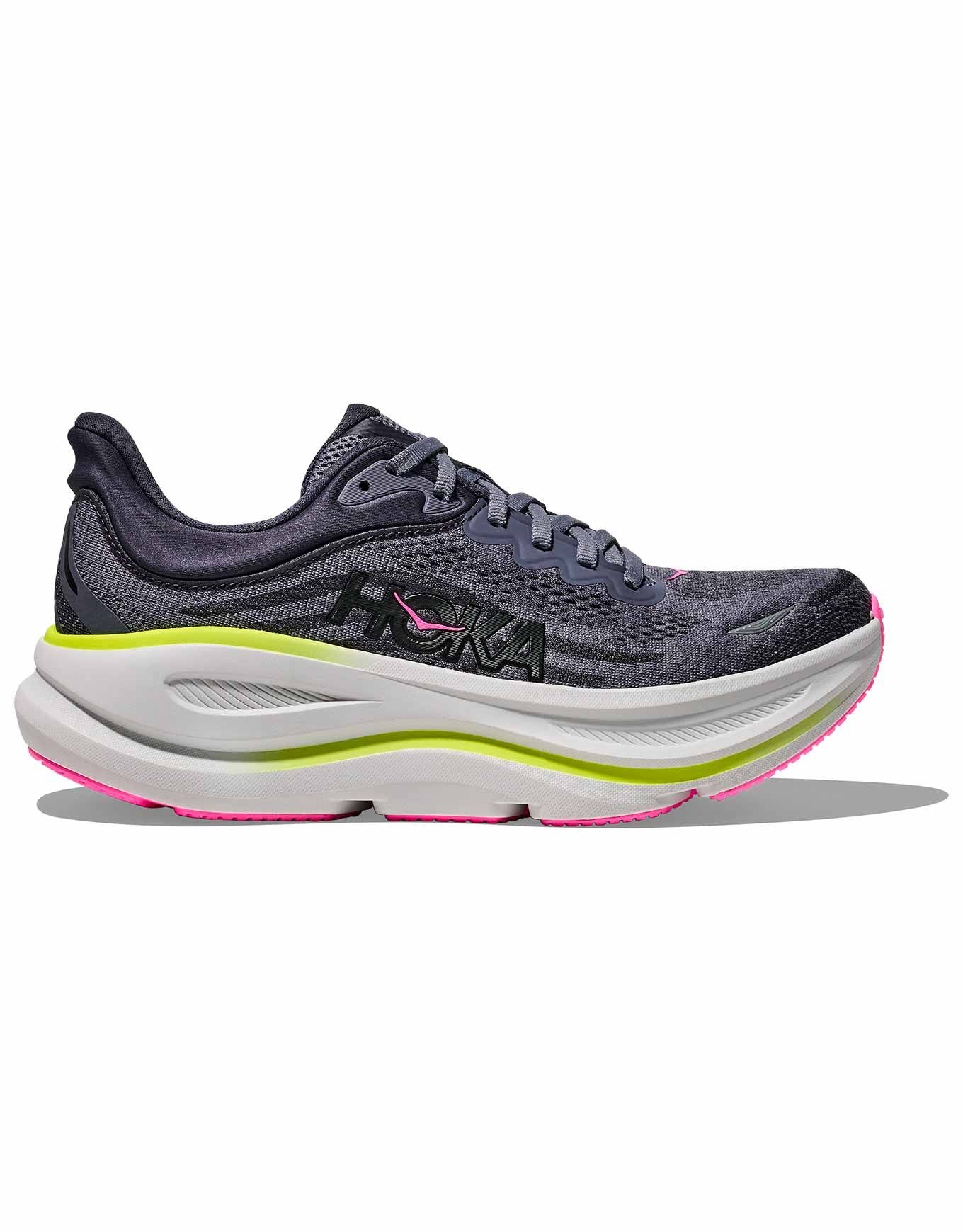 La Hoka Bondi 9 Charcoal Grey/Grey Skies est une chaussure de running femme offrant un amorti plus léger et moelleux, un talon renforcé pour une foulée fluide, une adhérence durable et une tige en mesh respirant.