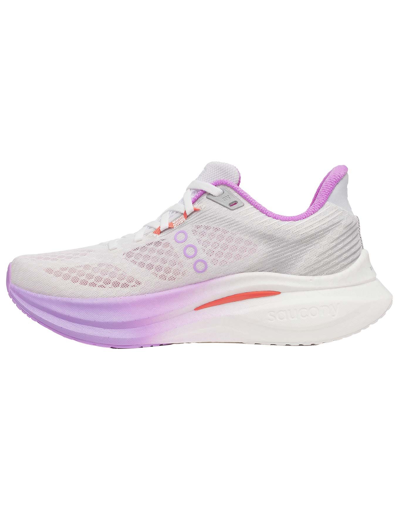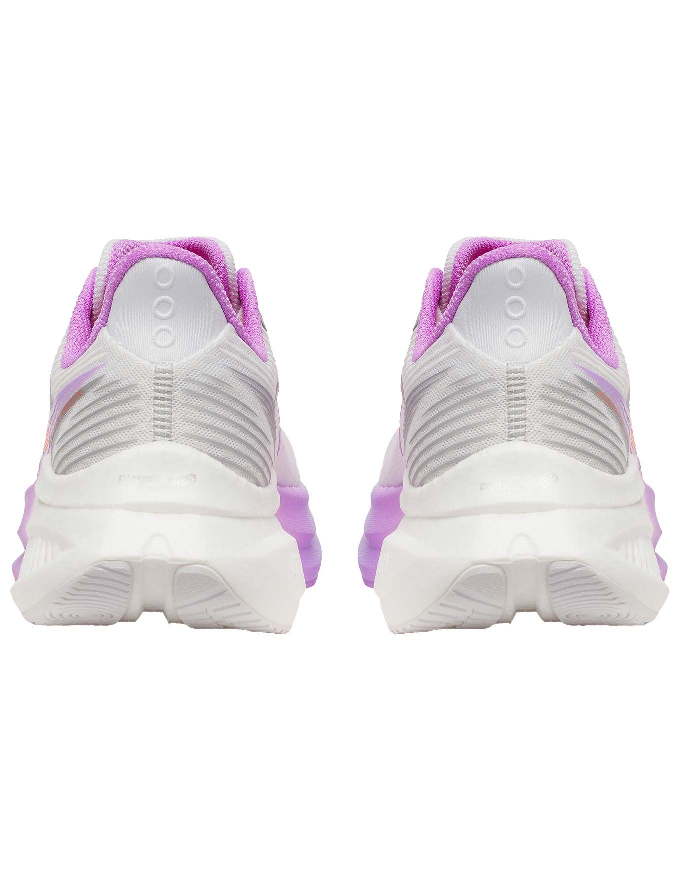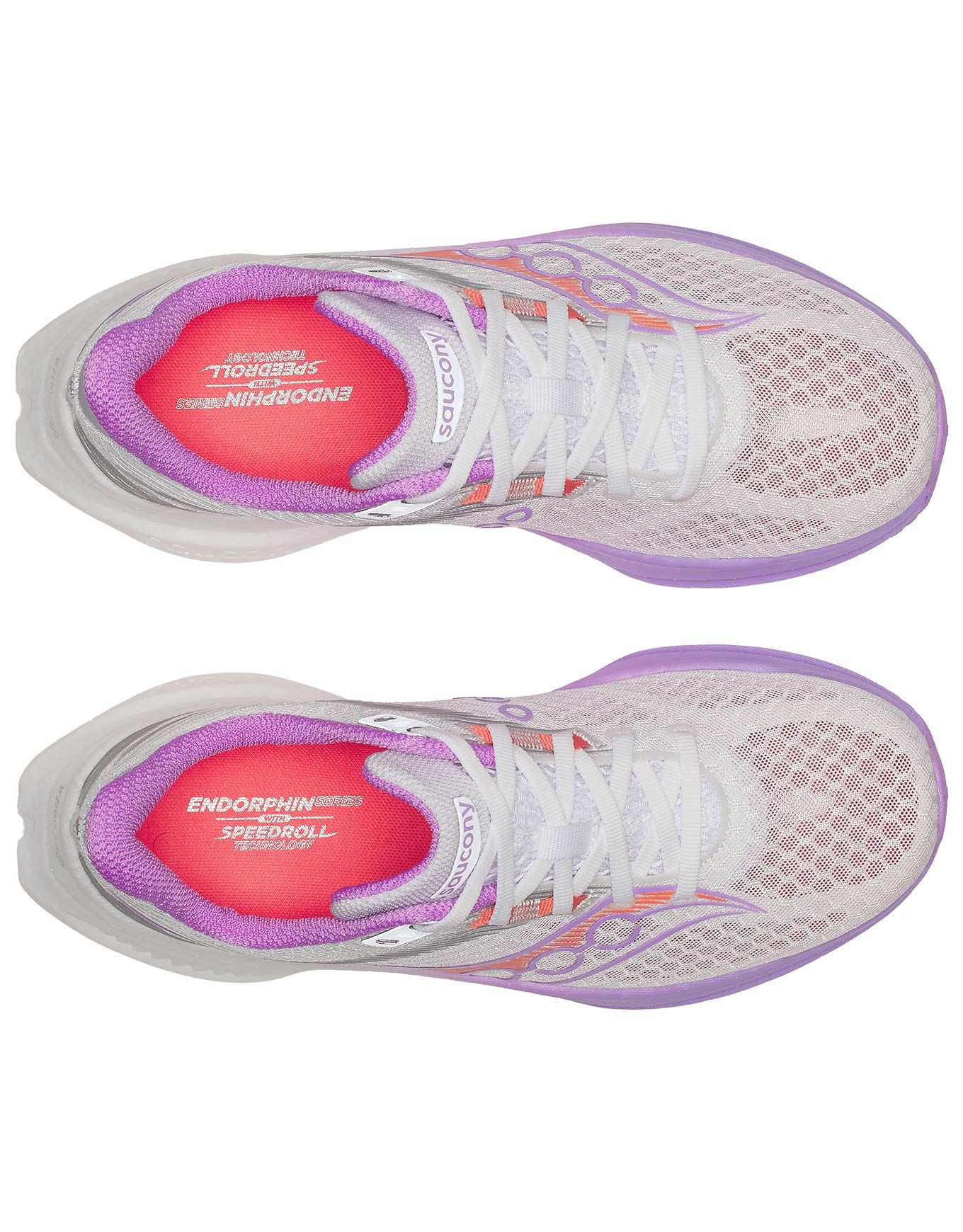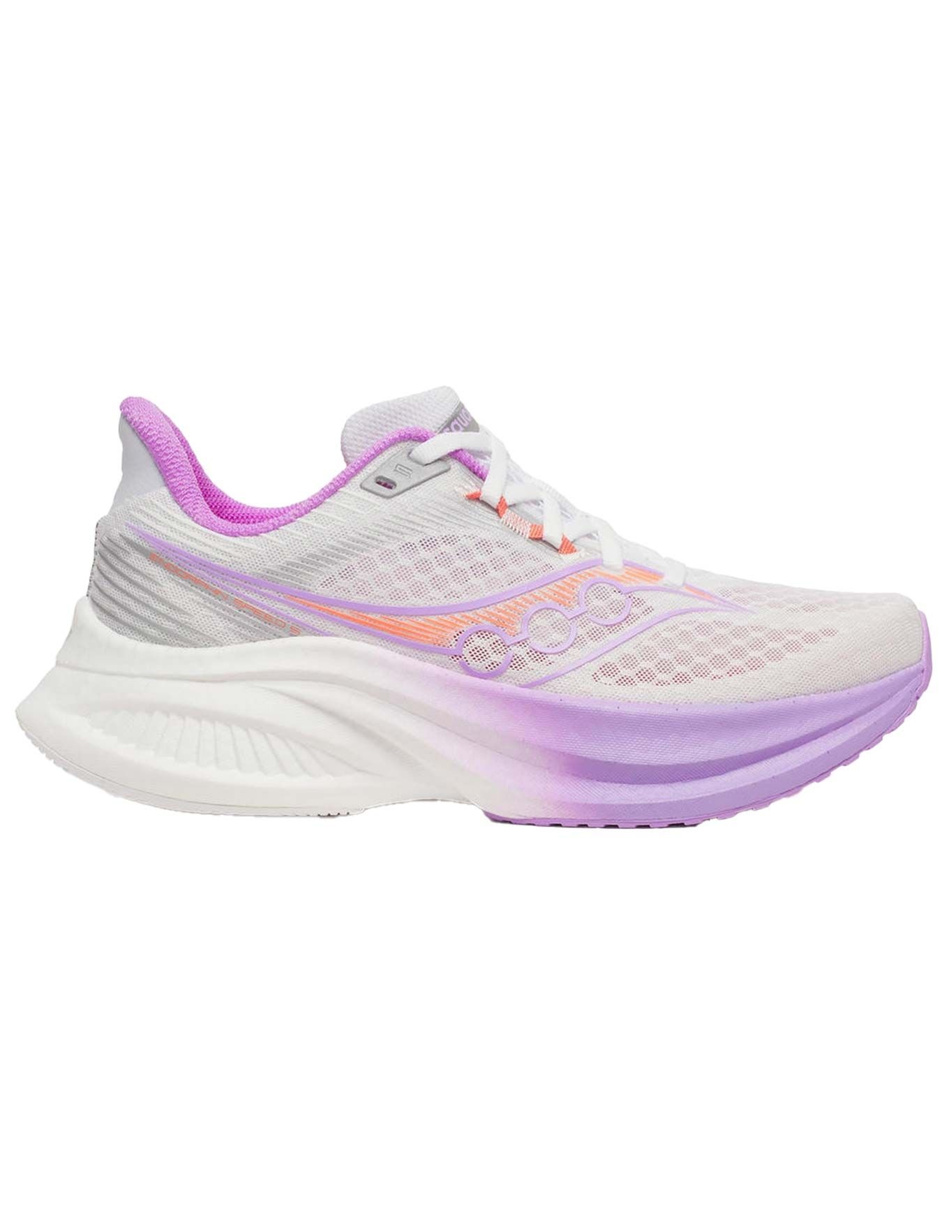 Chaussures de running femme Saucony Endorphin Speed 5 White/Crocus pour route et piste, combinant plaque nylon flexible et mousse PWRRUN PB pour amorti réactif, légèreté et propulsion Speedroll.