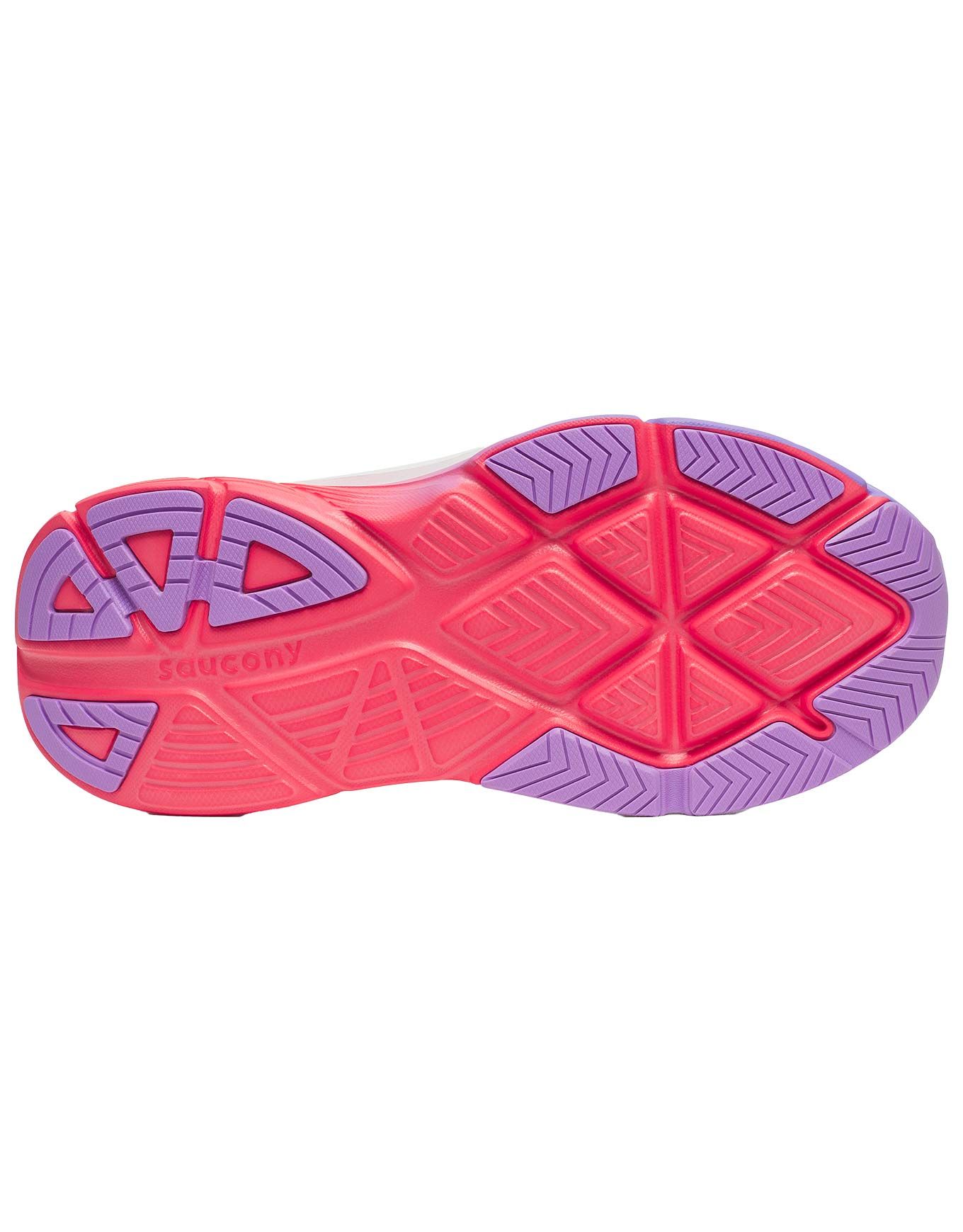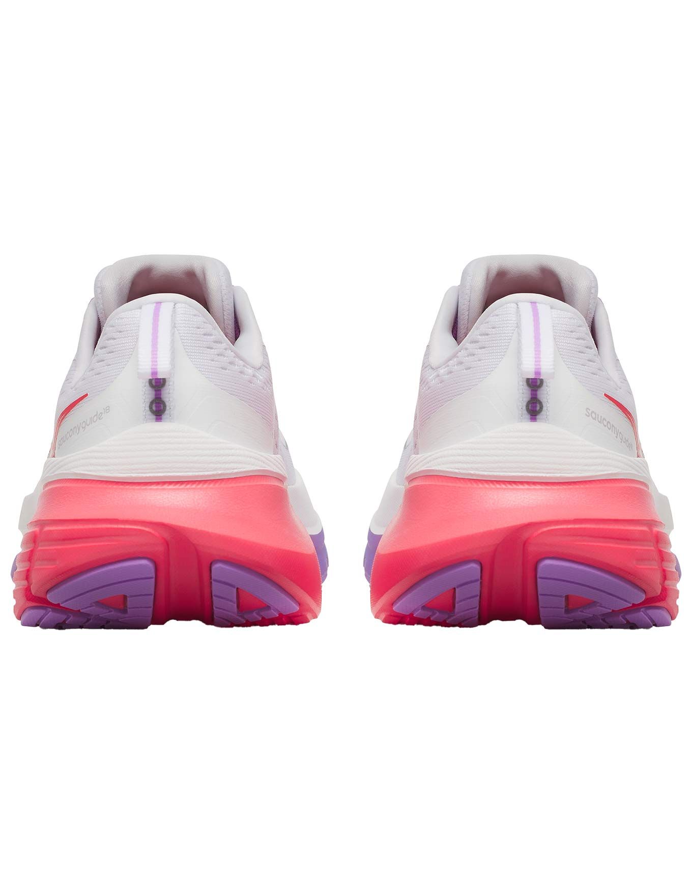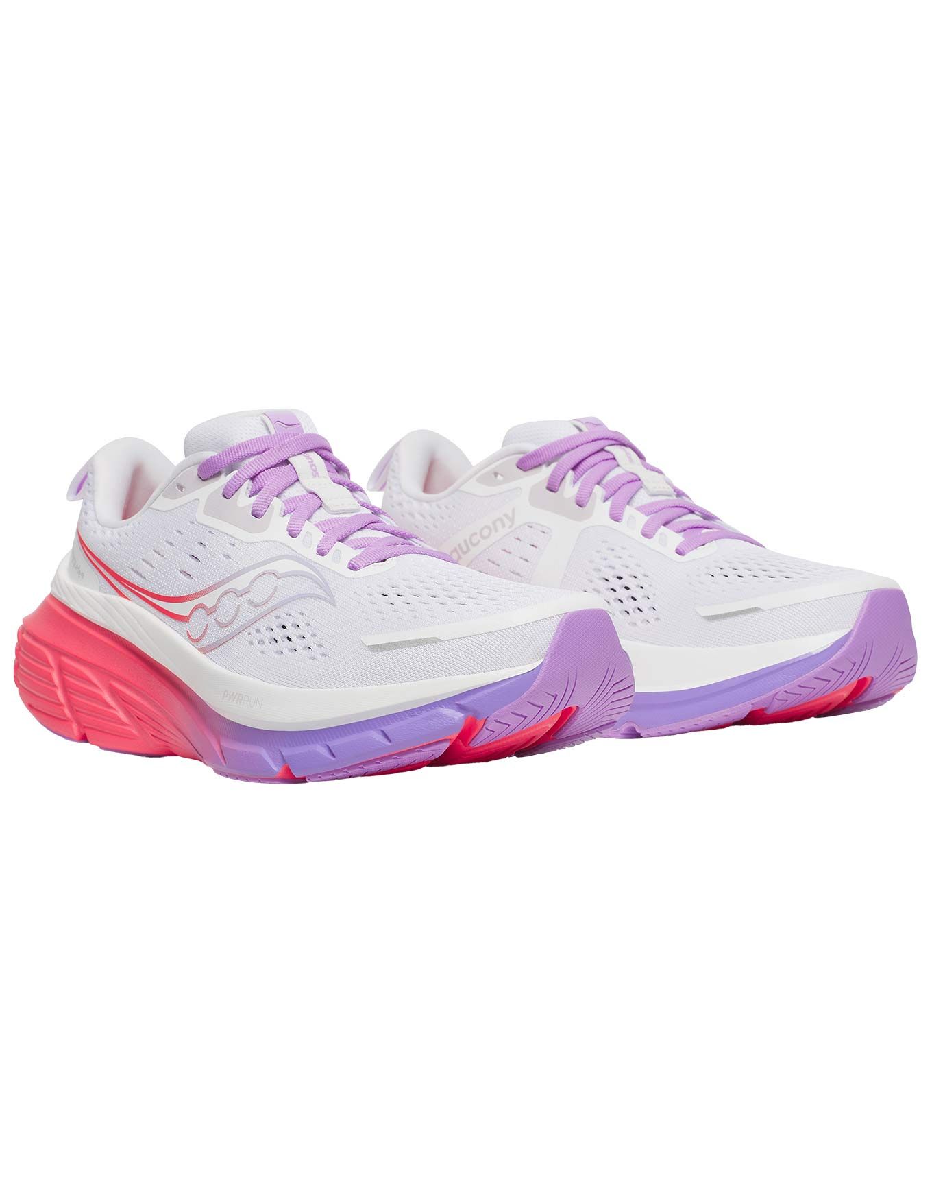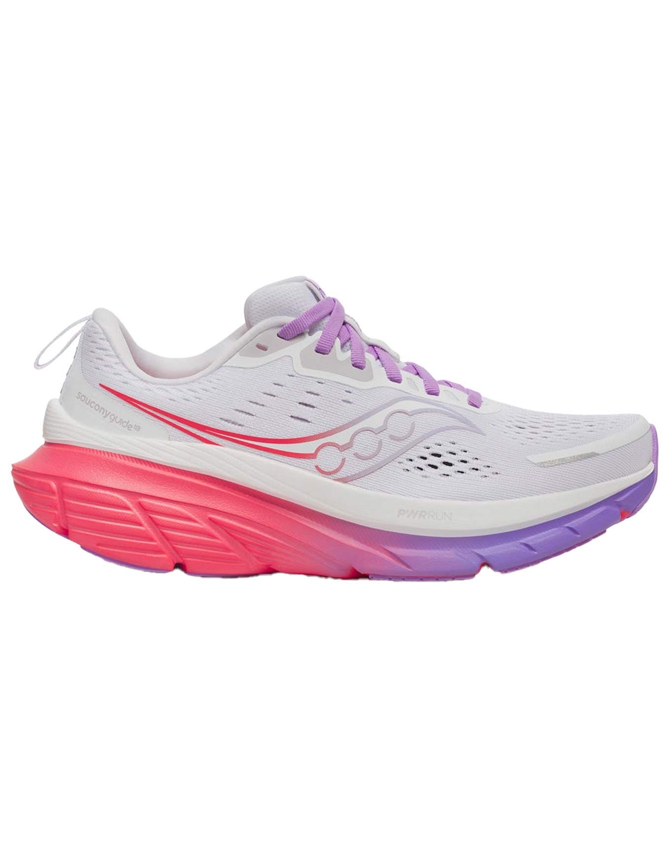 Chaussures de running Saucony Guide 18 White/Crocus femme : plateforme large, amorti PWRUN, Center Path et mesh respirant pour confort, soutien et foulée fluide sur entraînements quotidiens.