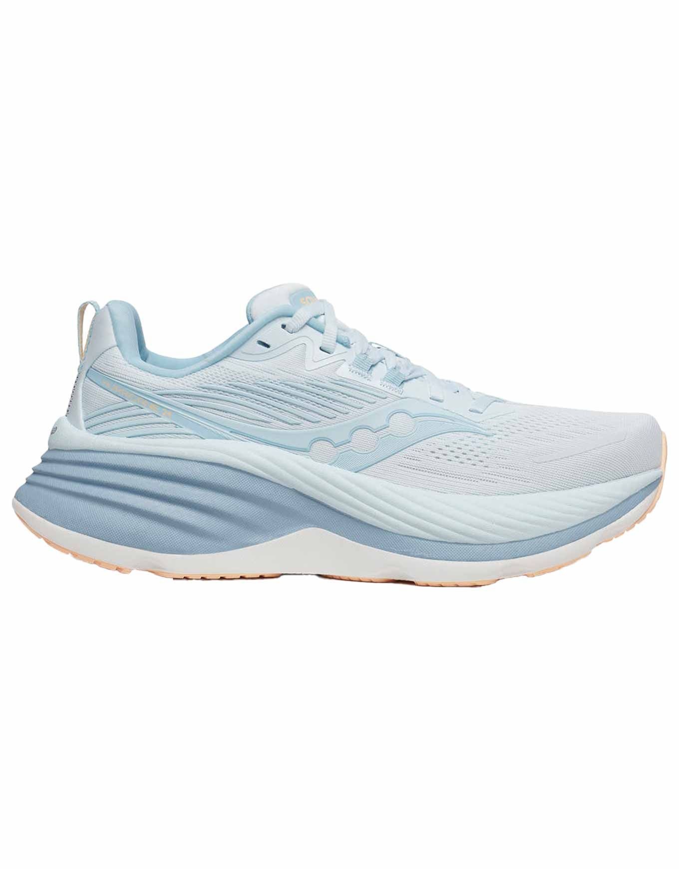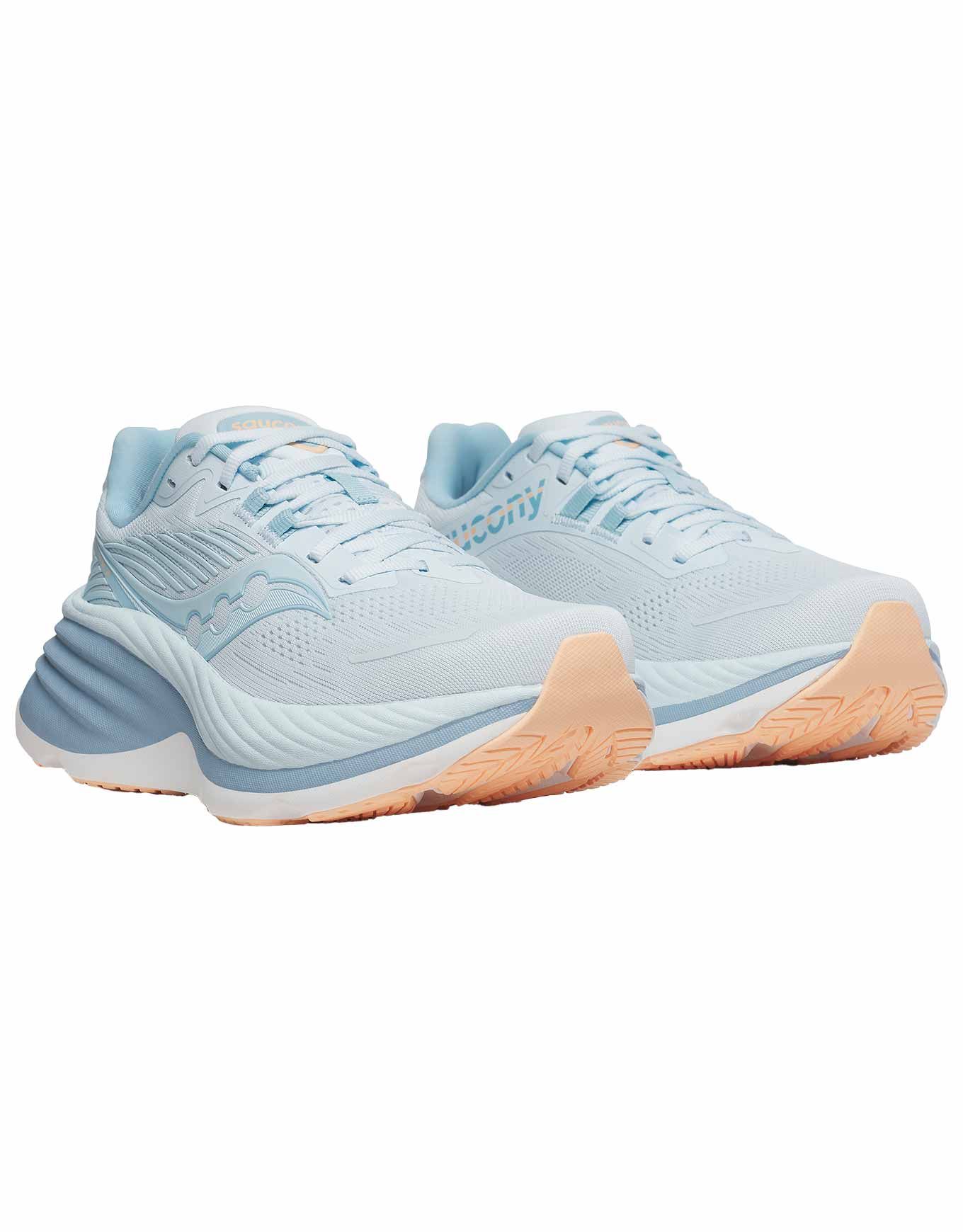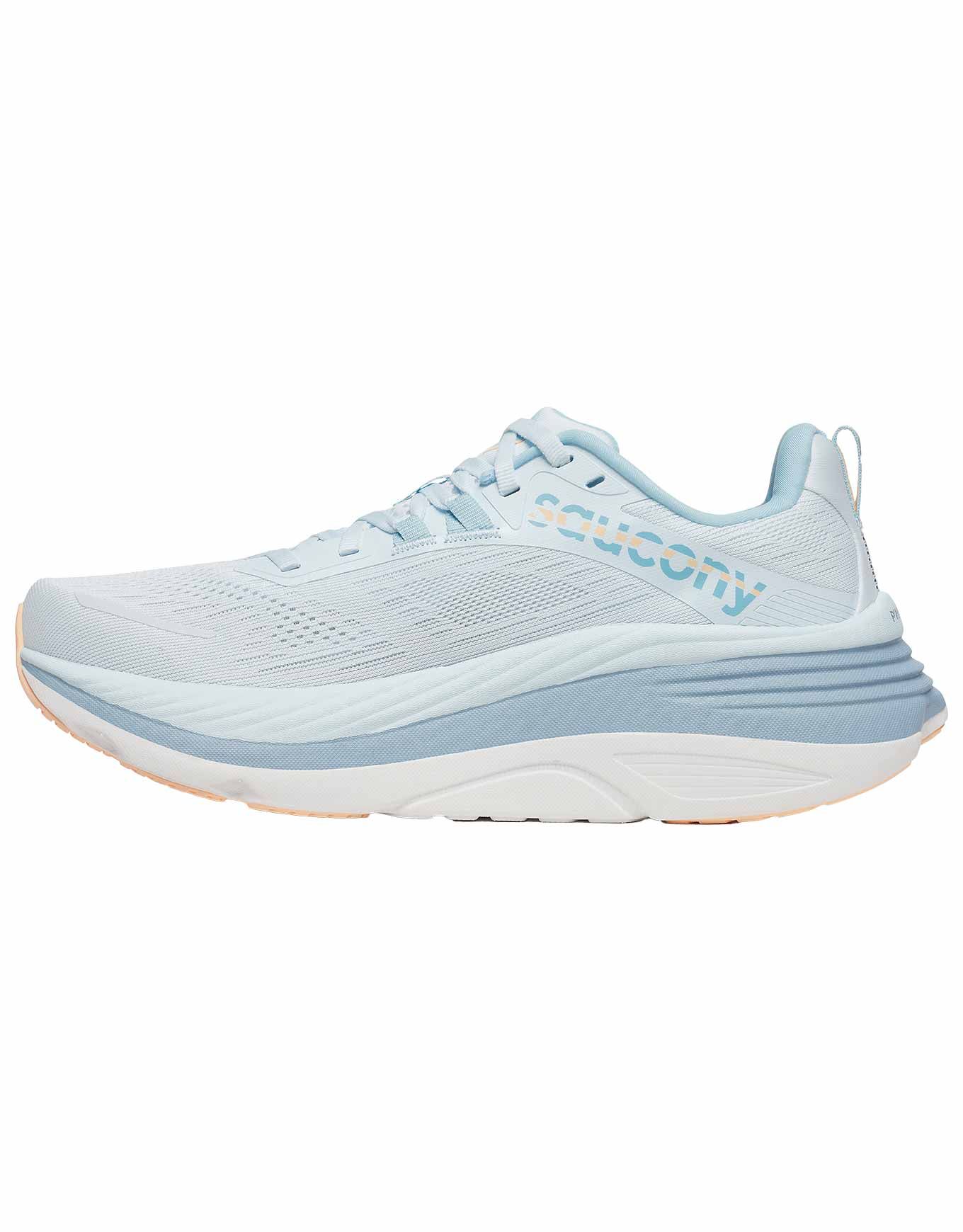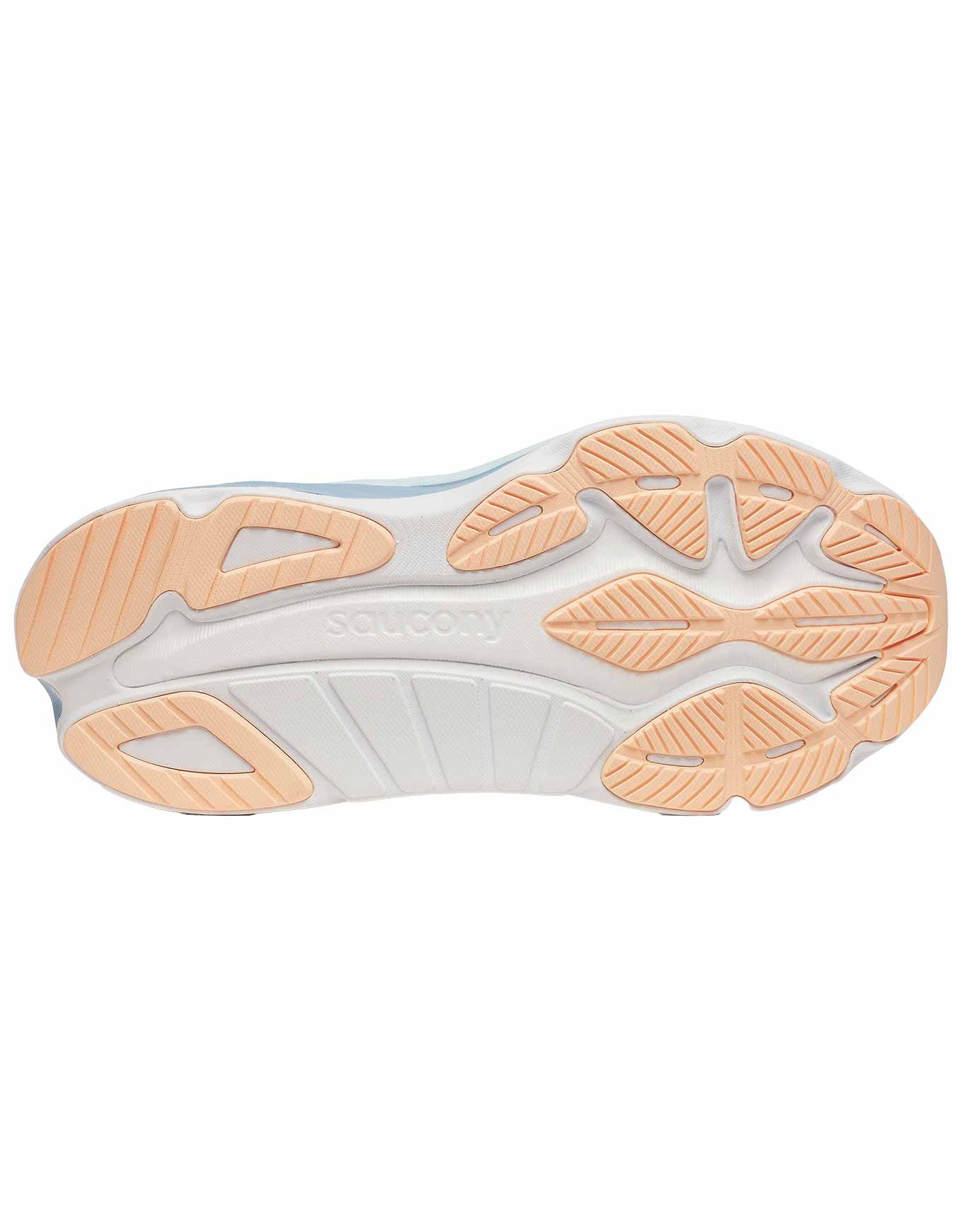 Chaussure de running femme Saucony Hurricane 24 Ice Melt offrant amorti maximal et soutien stable par la combinaison PWRRUN PB et PWRRUN FRAME, avec tige mesh respirante et talon ergonomique pour le confort sur longues distances.