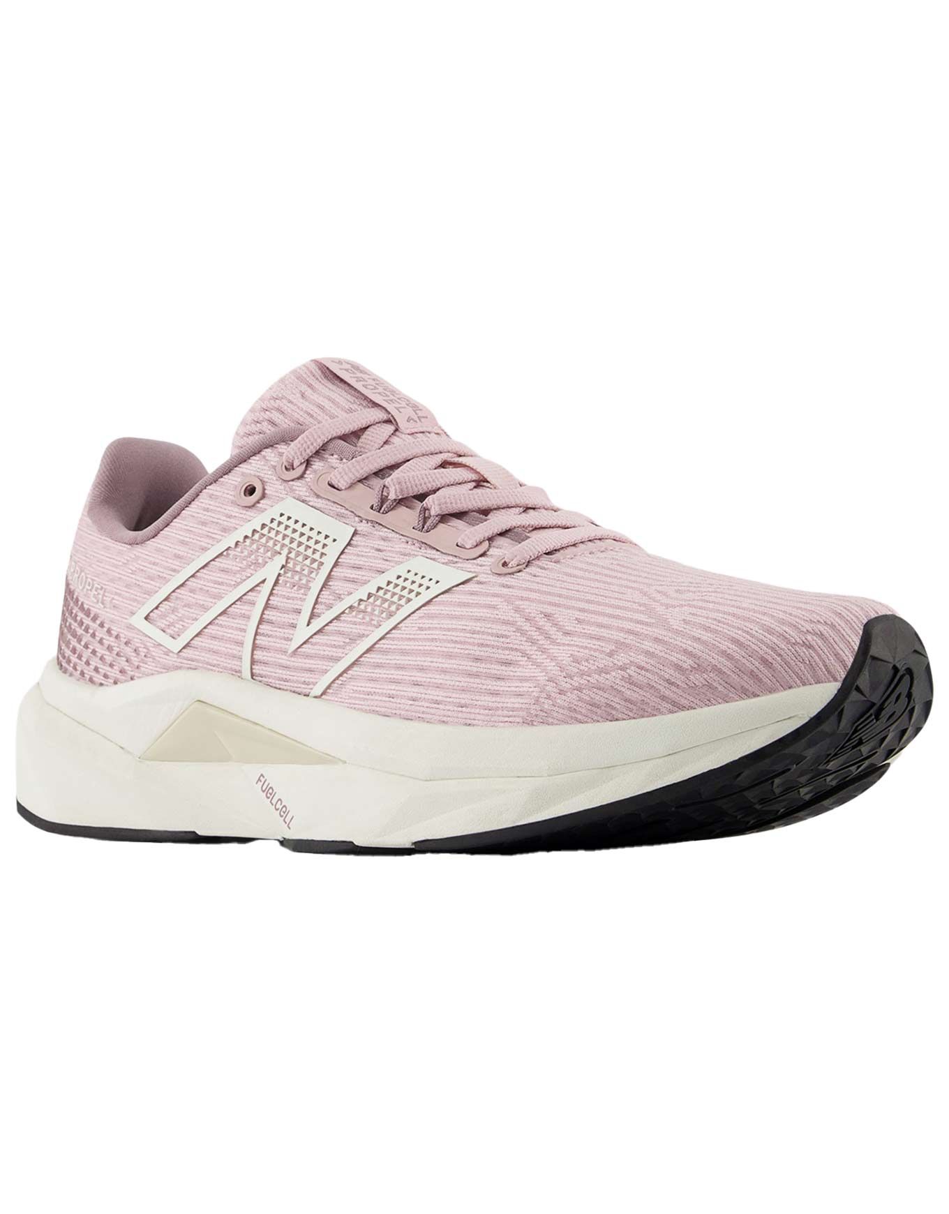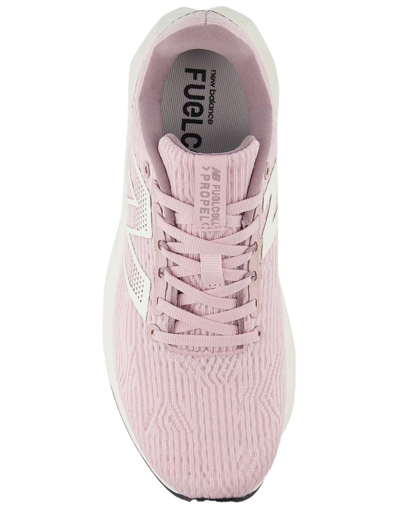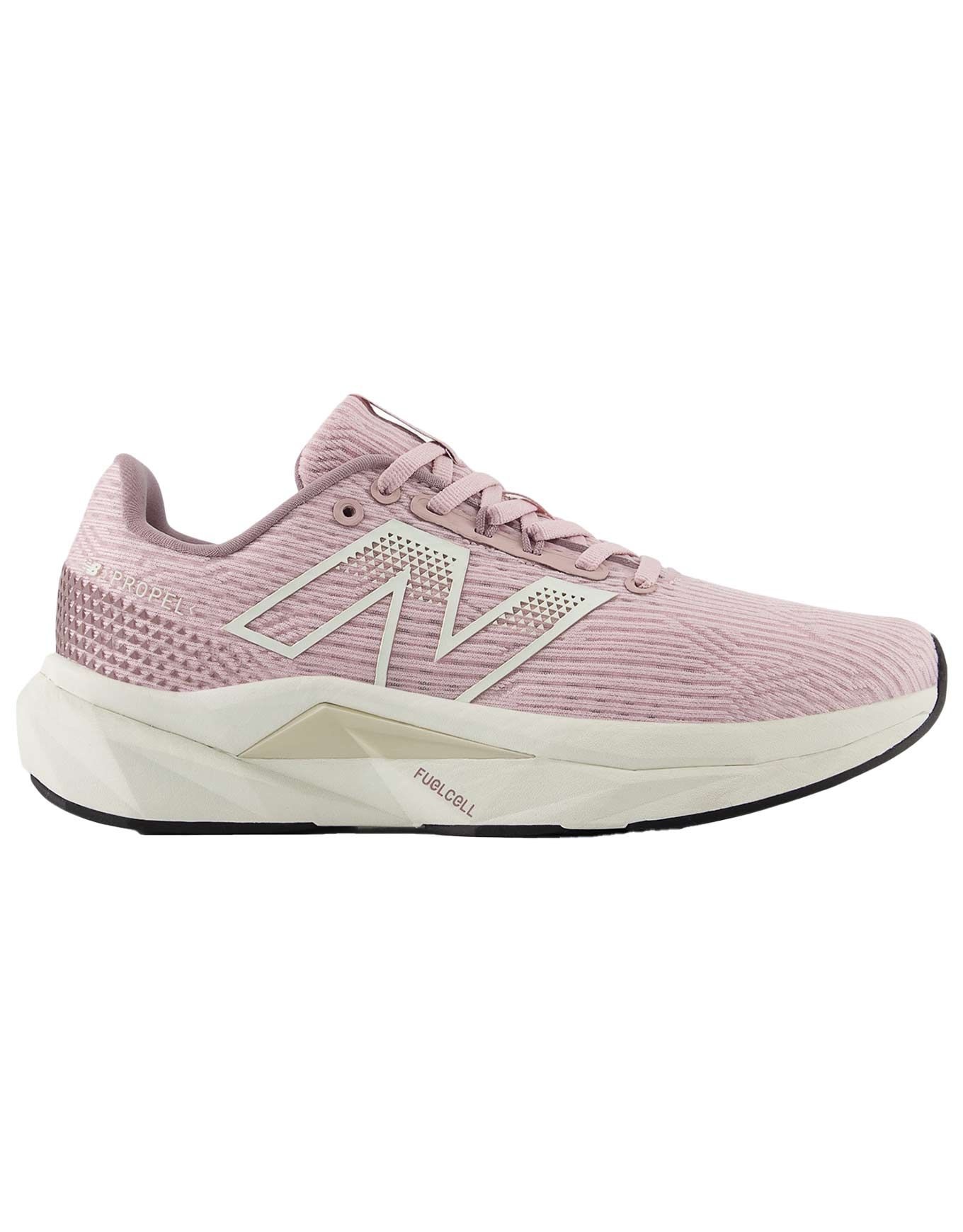 New Balance FuelCell Propel V5 Twilight Haze : chaussure de running femme 220 g, mousse FuelCell à l’azote, plaque TPU propulsive, mesh respirant et semelle extérieure stable pour sessions courtes ou longues.