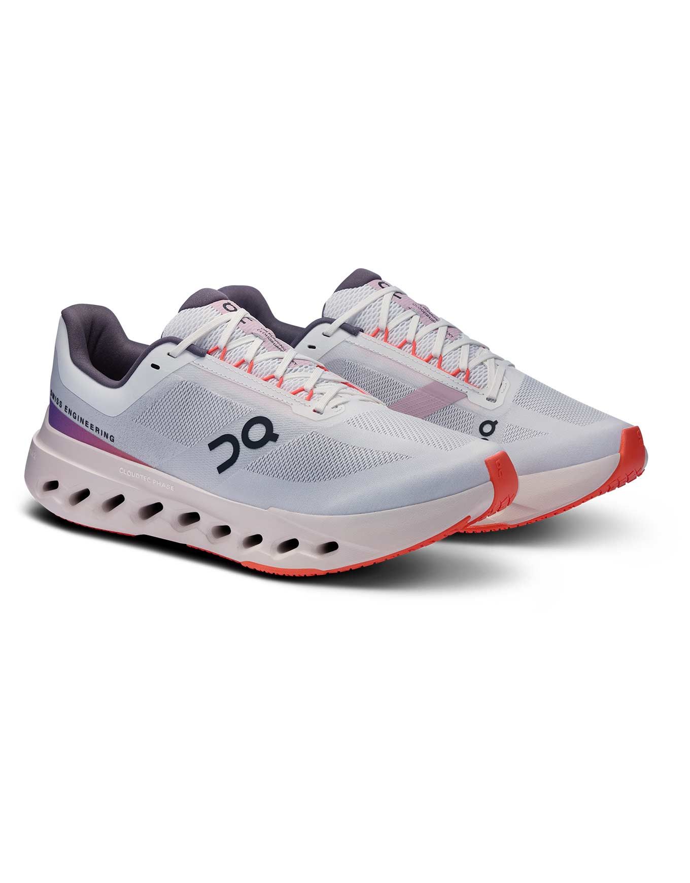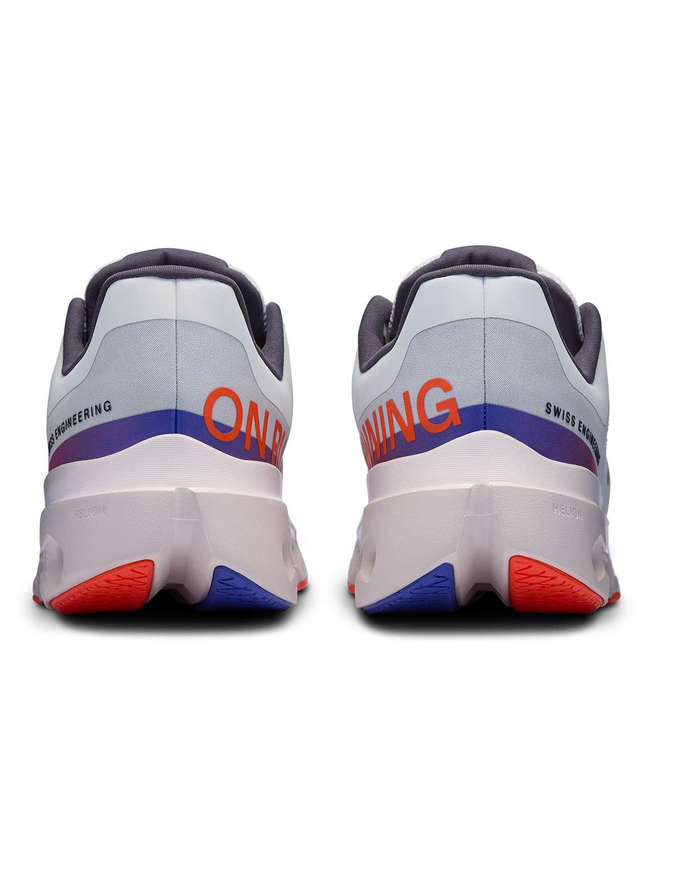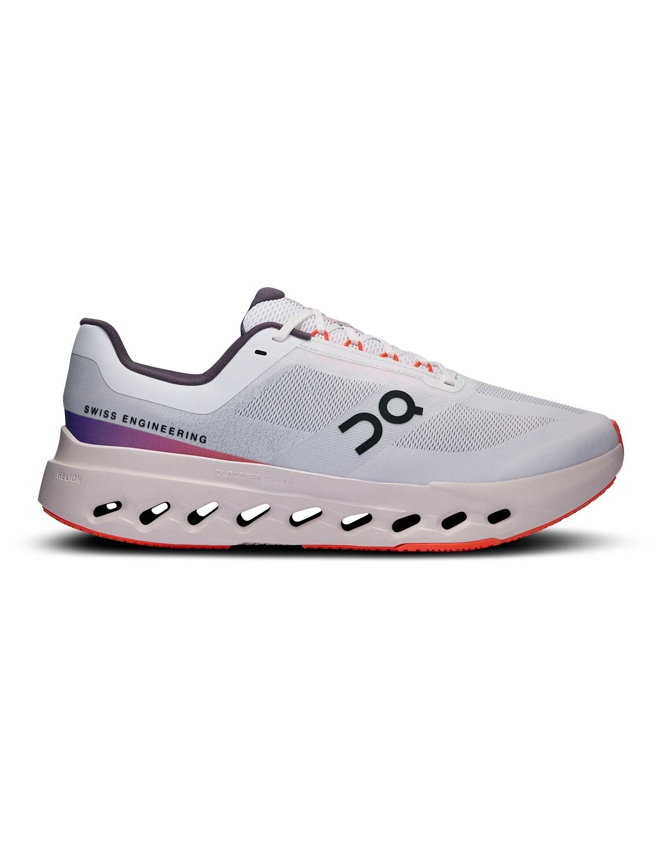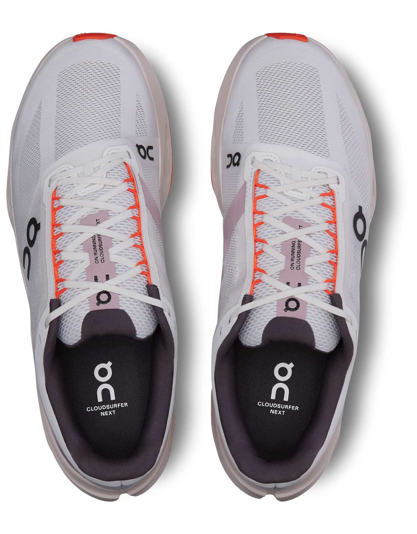Chaussure de running homme On Running Cloudsurfer Next White/Flame, conçue pour l’entraînement et la compétition, alliant amorti CloudTec Phase®, mousse Helion et mesh respirant en polyester recyclé pour une foulée fluide et dynamique.