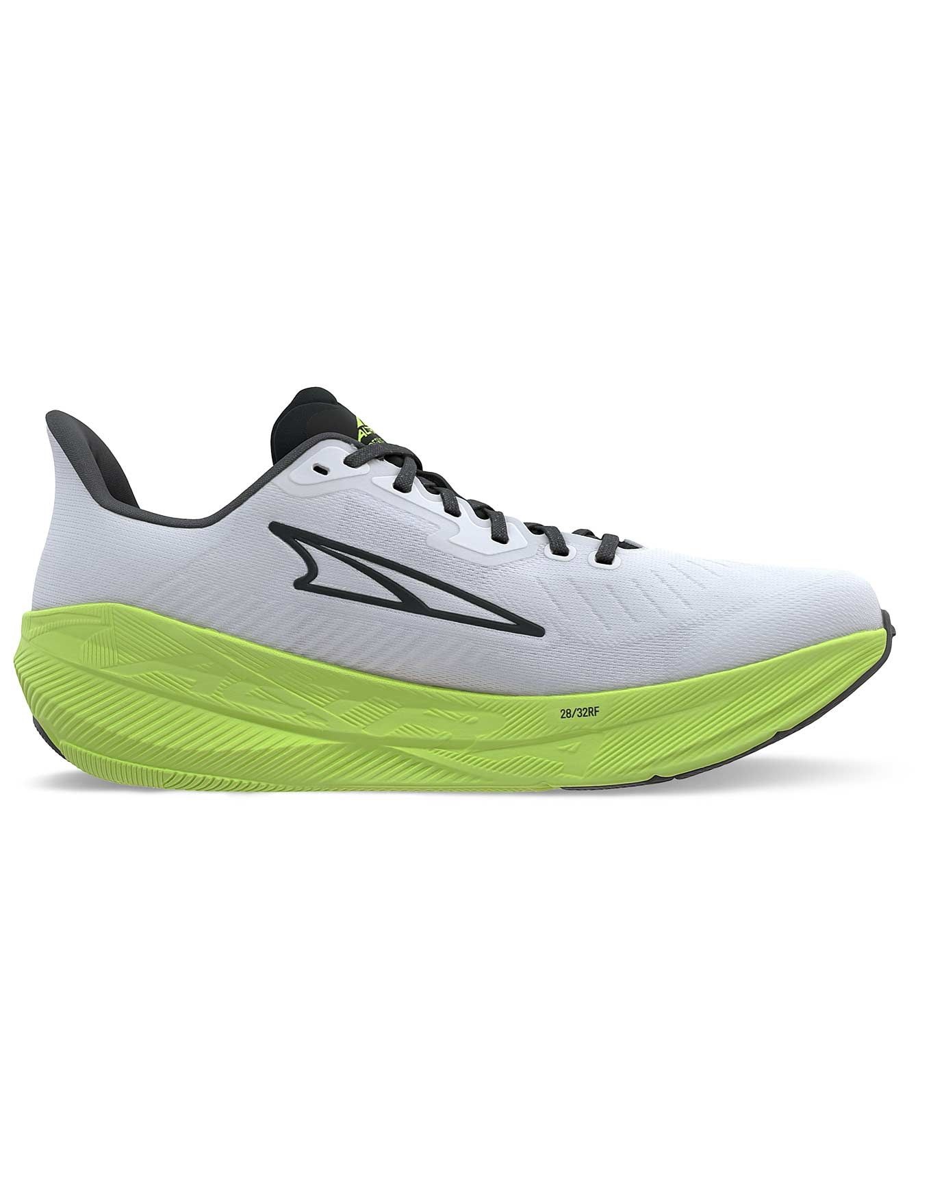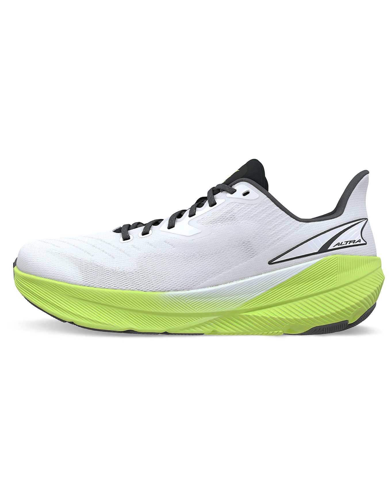 Chaussure de running homme Altra Experience Flow White/Lime, mousse EVA réactive, rocker shape et drop réduit pour une foulée fluide et propulsive, fit FootShape spacieux.