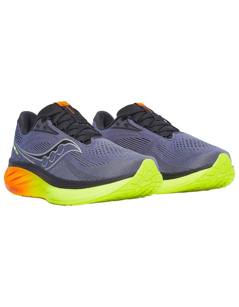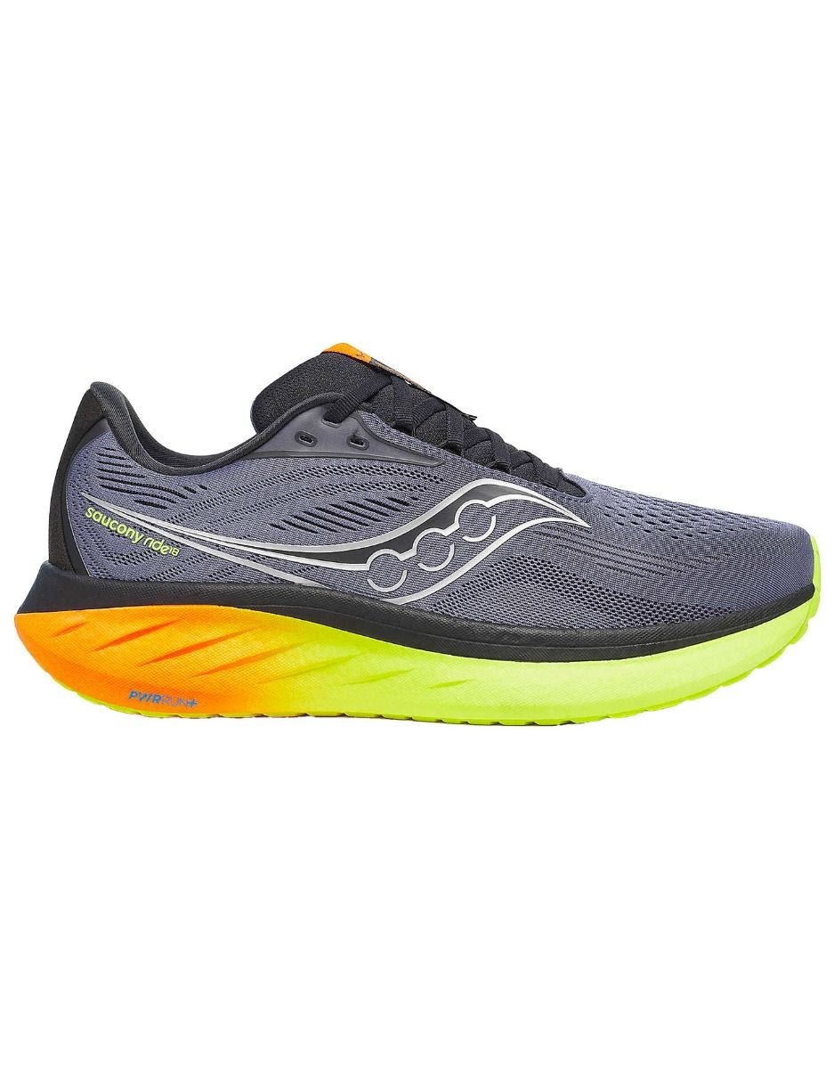 Saucony Ride 18 Shadow/Vizi, chaussure de running homme, allie mousse PWRRUN+ et semelle XT-900 pour un amorti réactif, une grande durabilité et un maintien en mesh technique au quotidien.