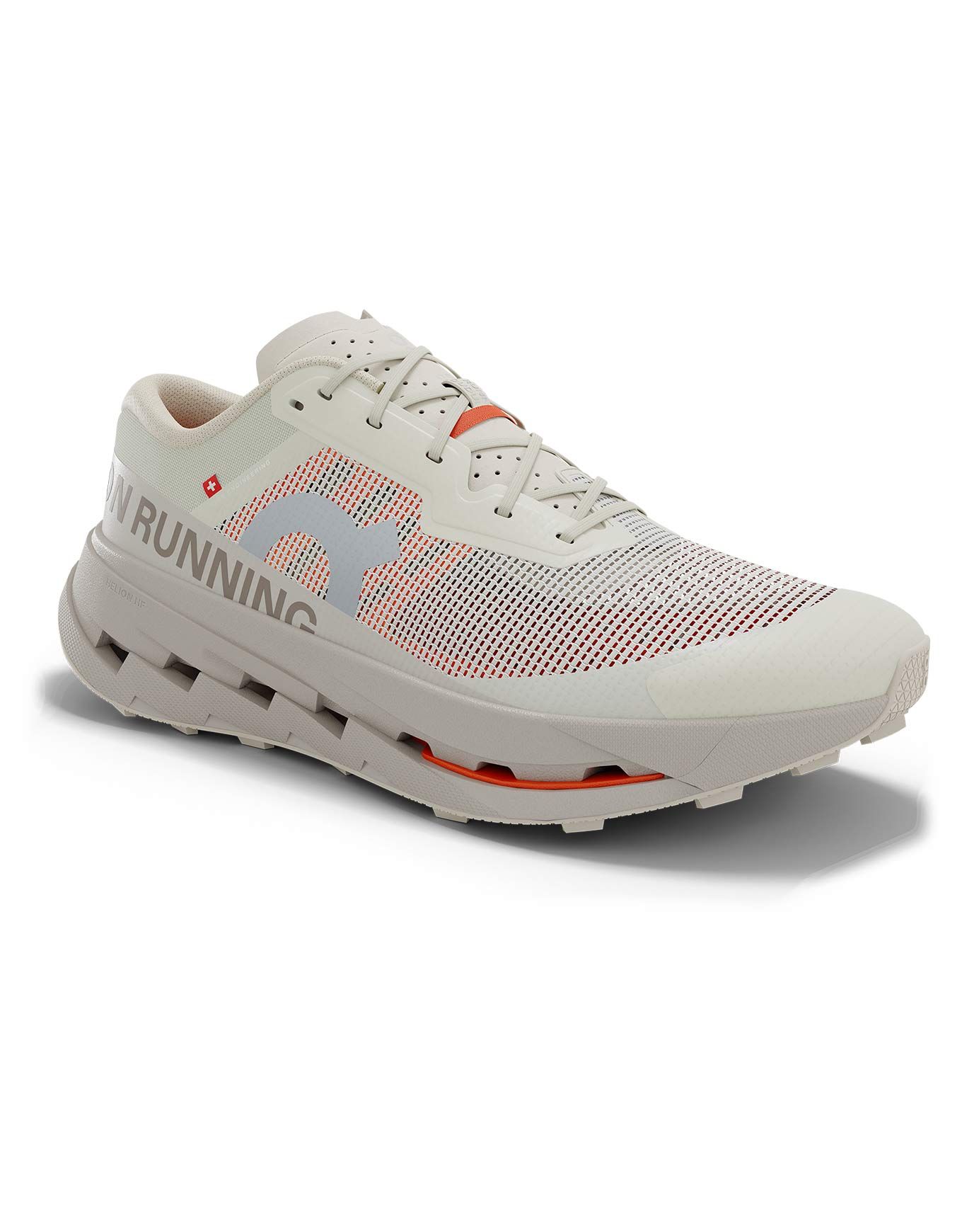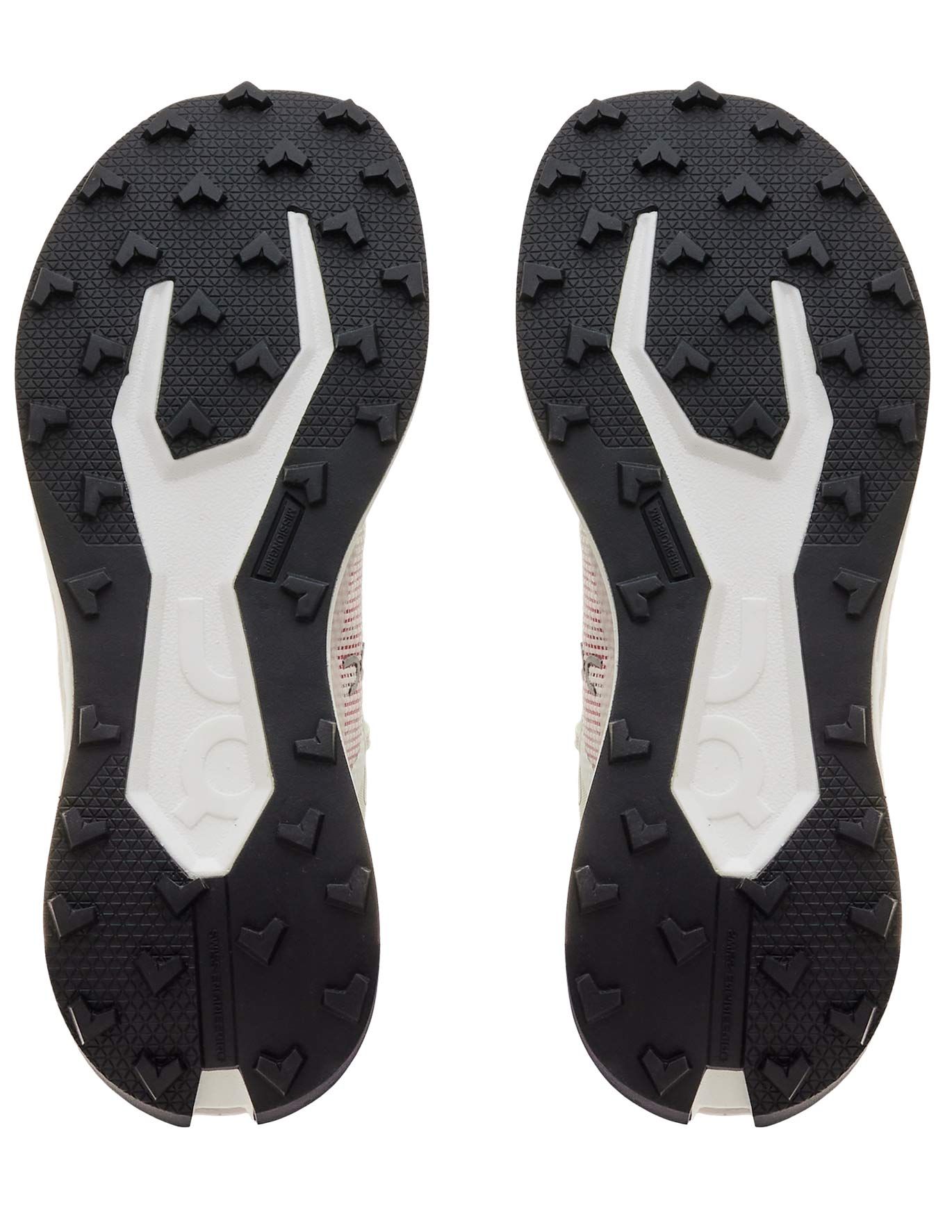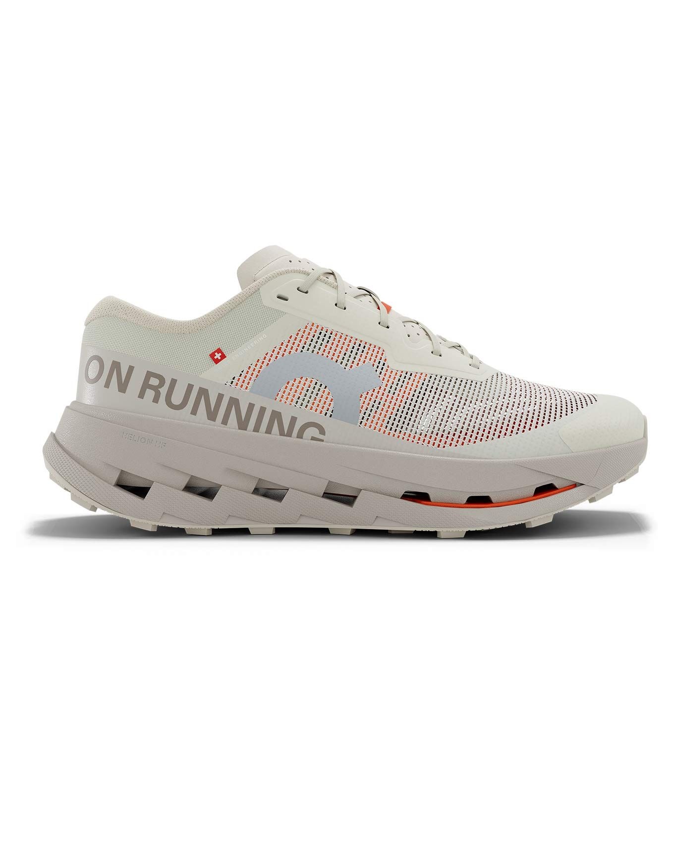 Chaussures de trail running femme On Running Cloudultra 3 Ivory Pearl, conçues pour la longue distance tout terrain avec amorti Helion, semelle Missiongrip, tige Leno respirante et système FlipRelease pour un ajustement stable.