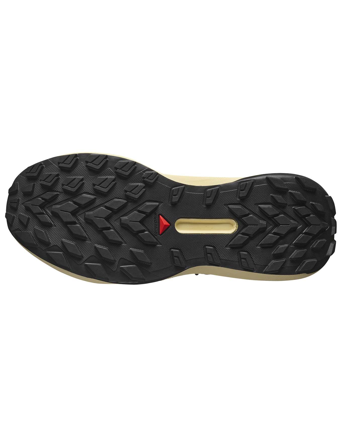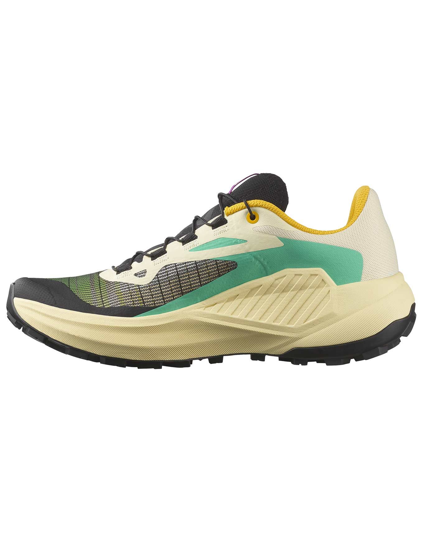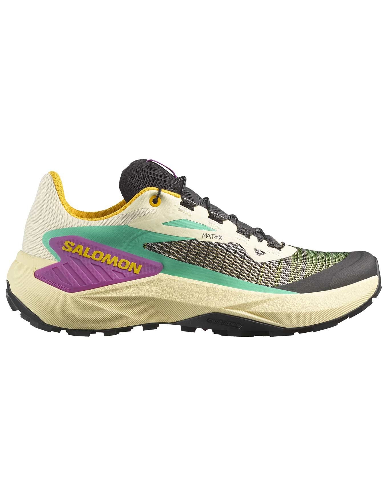 Chaussure de trail-running Salomon Genesis Transparent Yellow/Black pour femme, conçue pour les terrains techniques et gras avec semelle Contagrip®, fit EndoFit™, semelle intermédiaire Energy Foam légère et Active Chassis pour précision, confort et agilité.