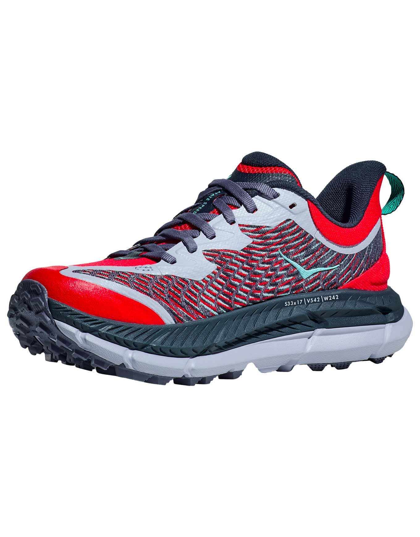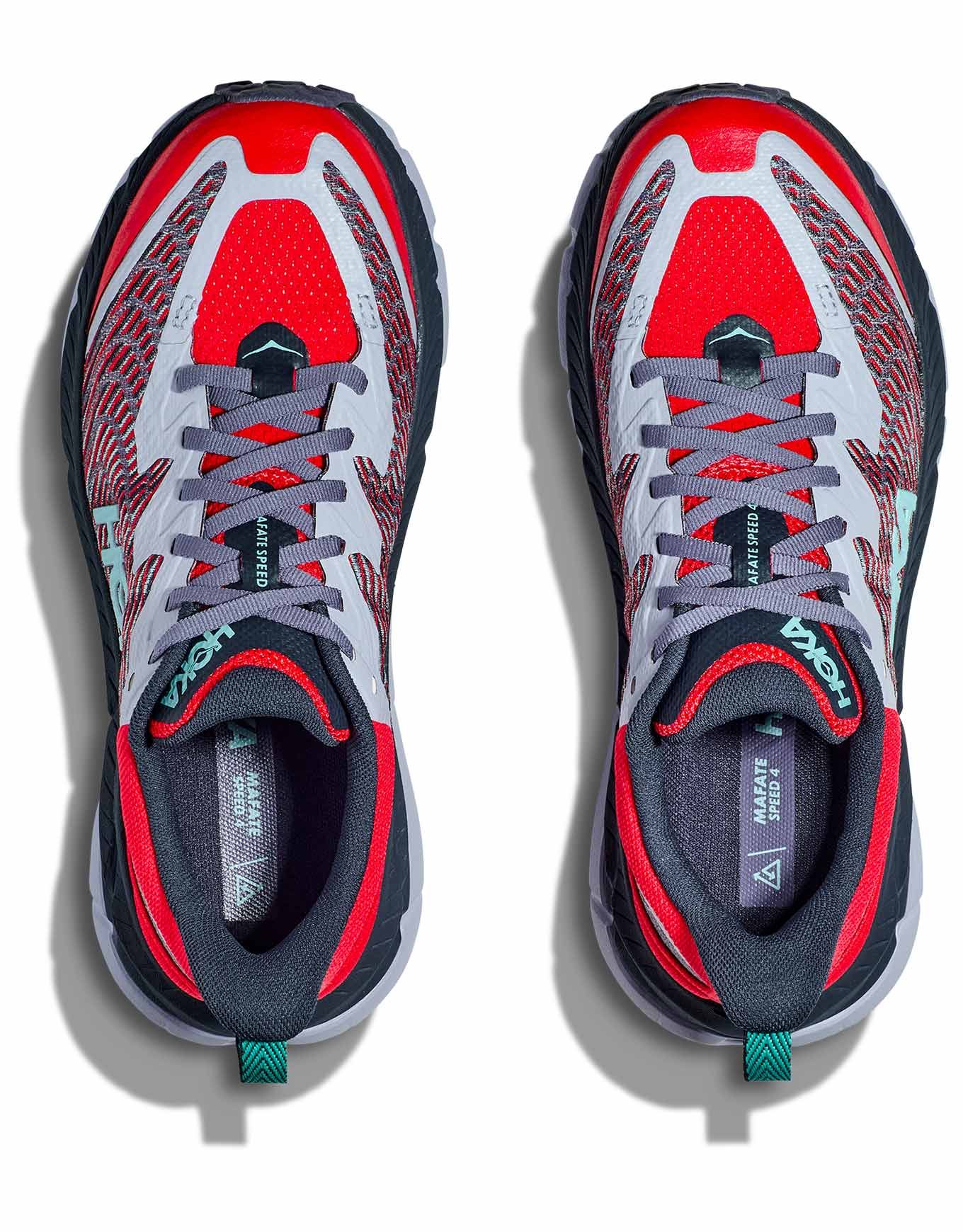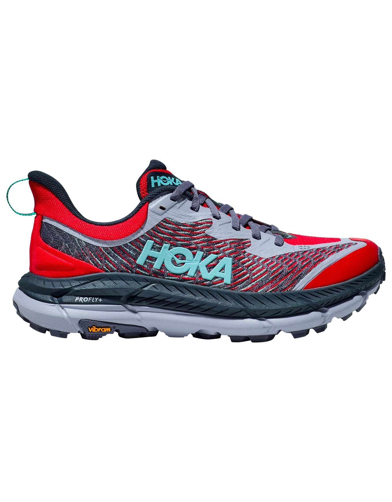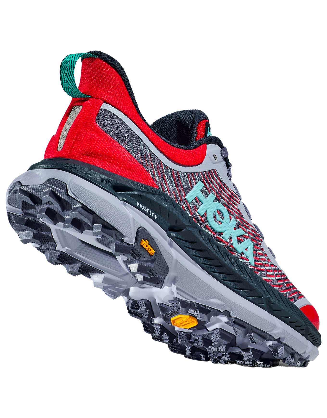 Chaussure de trail Hoka Mafate Speed 4 W Cerise/Stormy Skies : semelle Vibram® MegaGrip 5 mm, mesh jacquard durable, amorti PROFLY+ et profil incurvé pour foulée naturelle sur terrain technique.