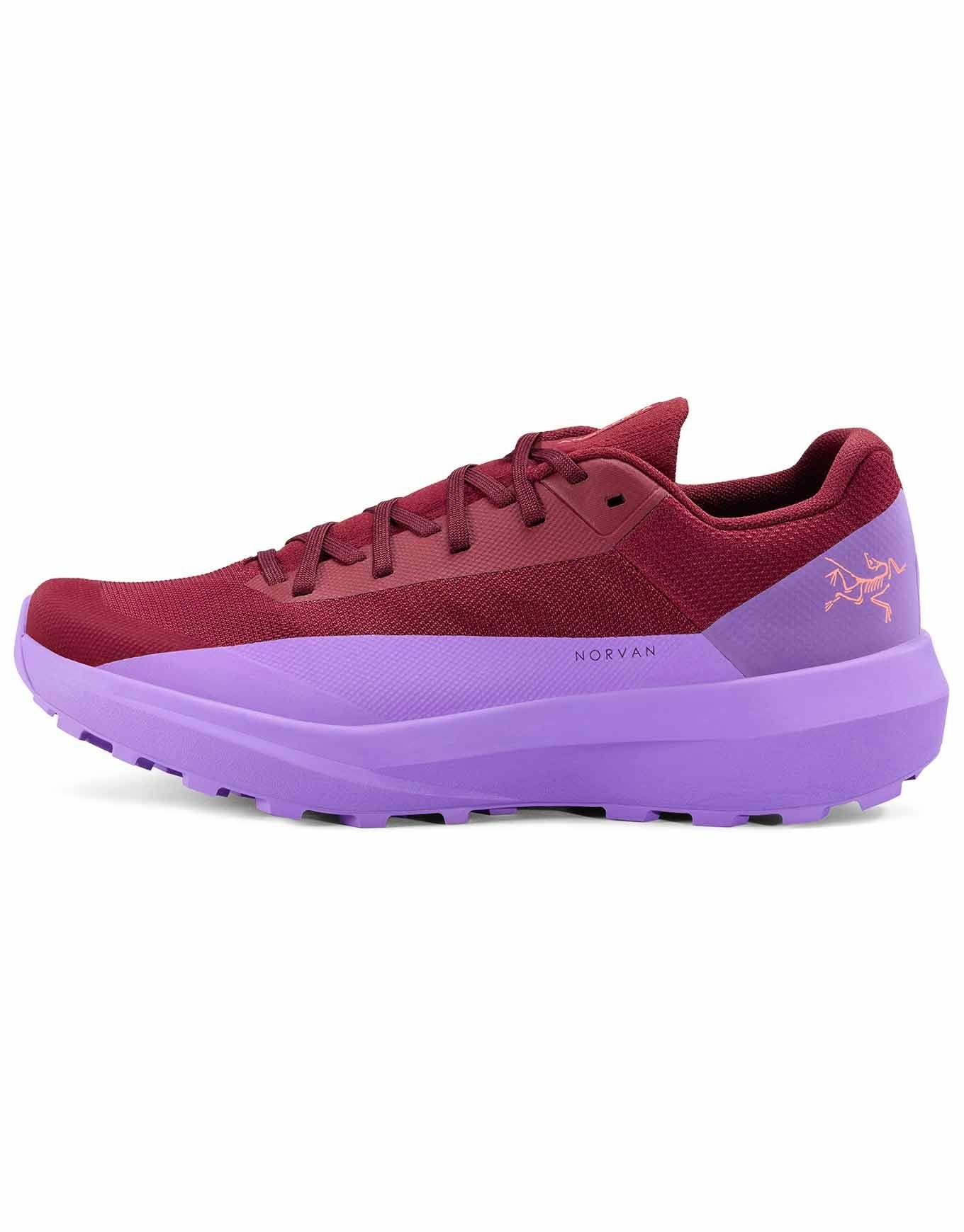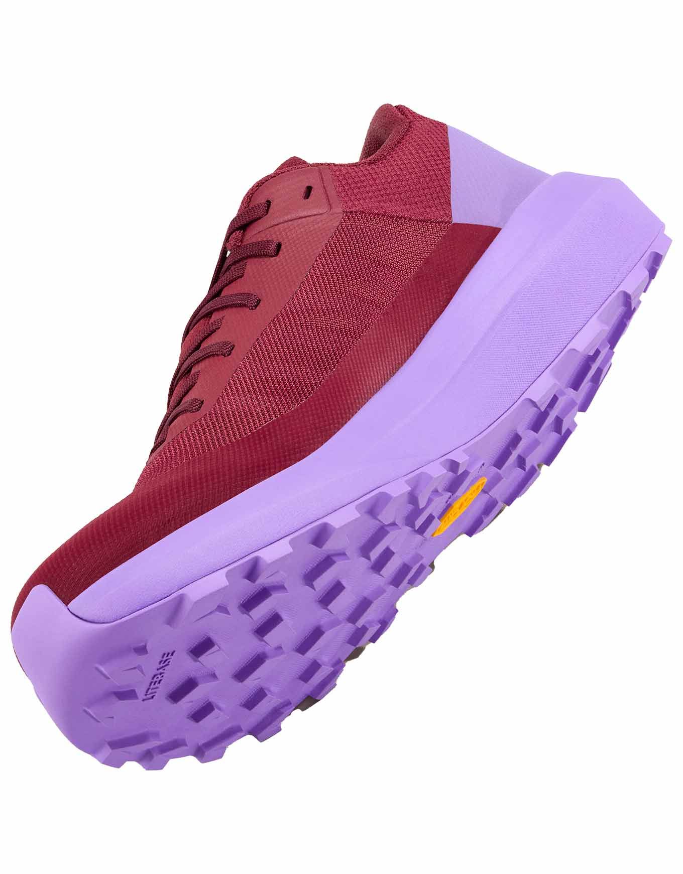 La chaussure de trail Arc’teryx Norvan LD 4 Mars/Aster femme conjugue semelle Vibram Megagrip 4 mm, tige respirante bi-matière et laçage fluide pour assurer maintien, adhérence et confort sur longues distances en terrain montagneux.