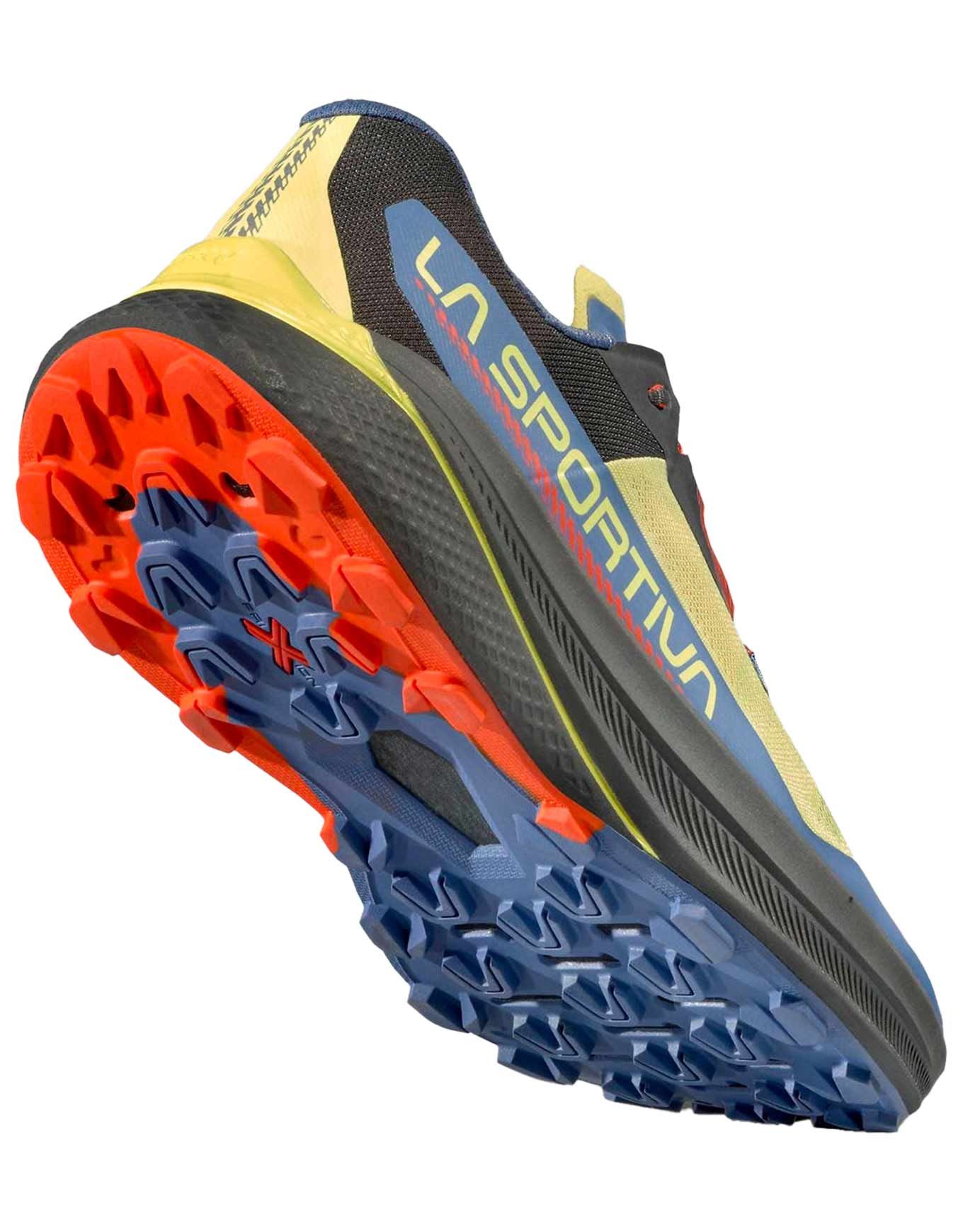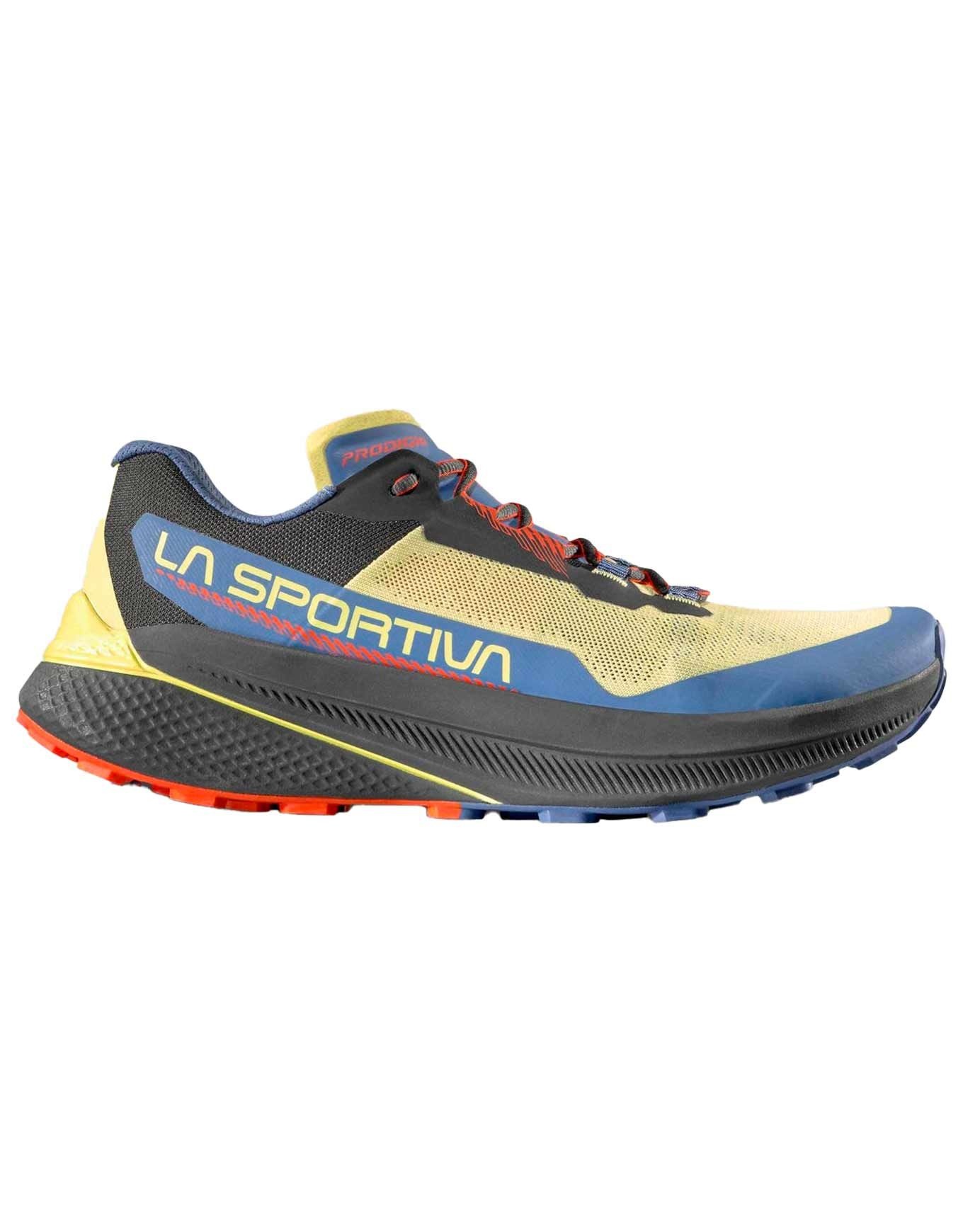 La Sportiva Prodigio Zest/Moonlight, chaussure technique de trail homme ultra-légère, conjugue tige aérée résistante, semelle FriXion® amortissante et rocker dynamique pour des kilomètres de confort sans pression sur terrain technique.