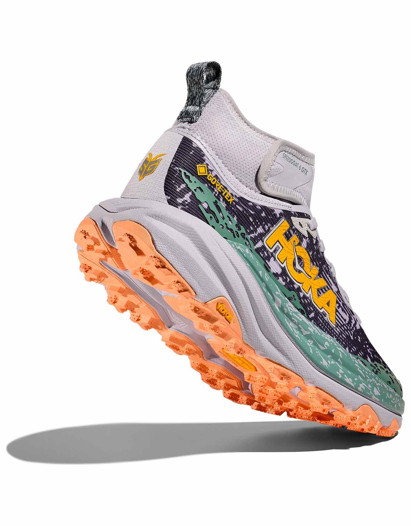 Chaussure de trail femme Hoka Speedgoat 6 Mid GTX Mountain Fog/Droplet, conçue avec Karl Meltzer : membrane GORE-TEX imperméable, semelle Vibram Megagrip 5 mm, stabilité renforcée et chaussage facile.