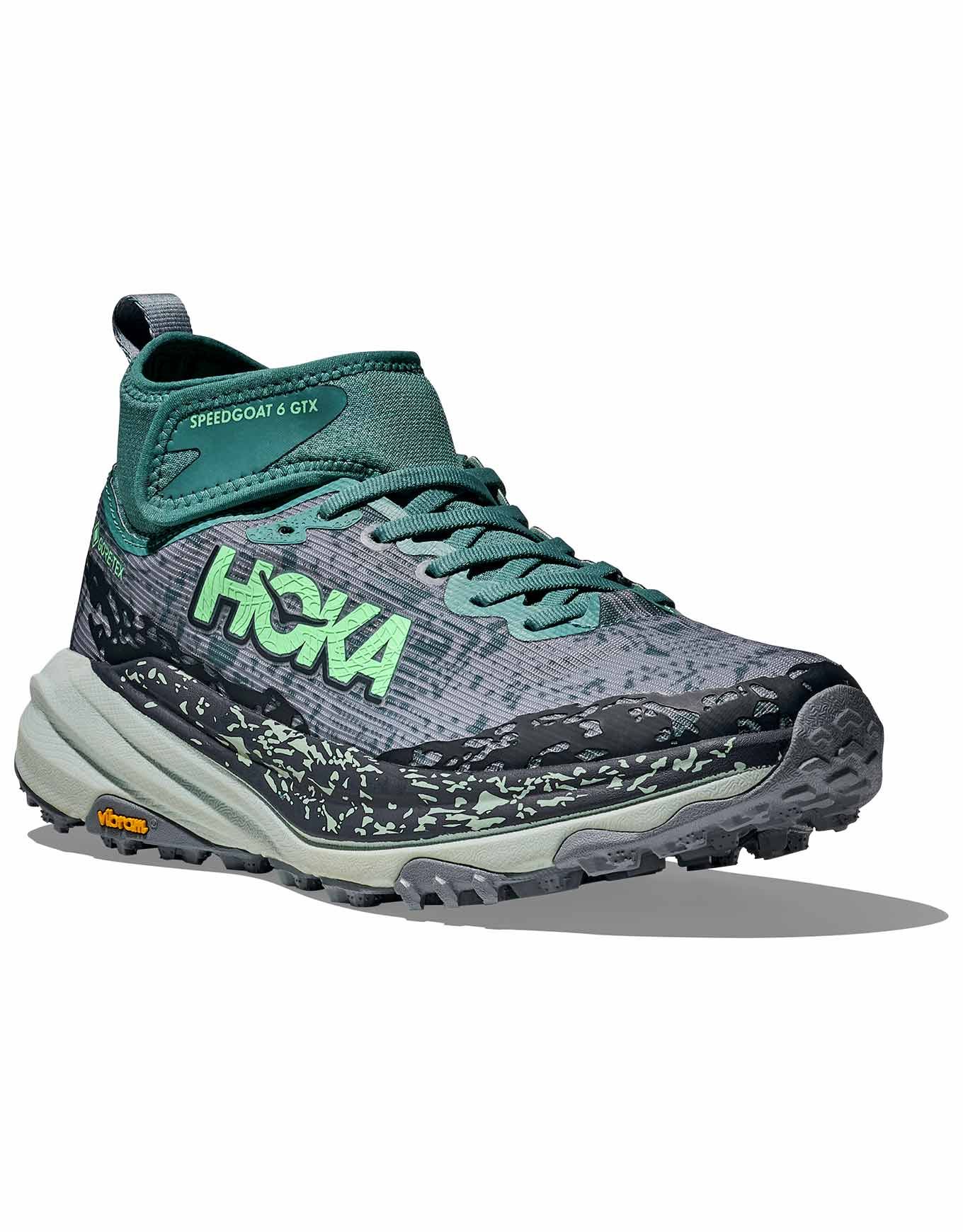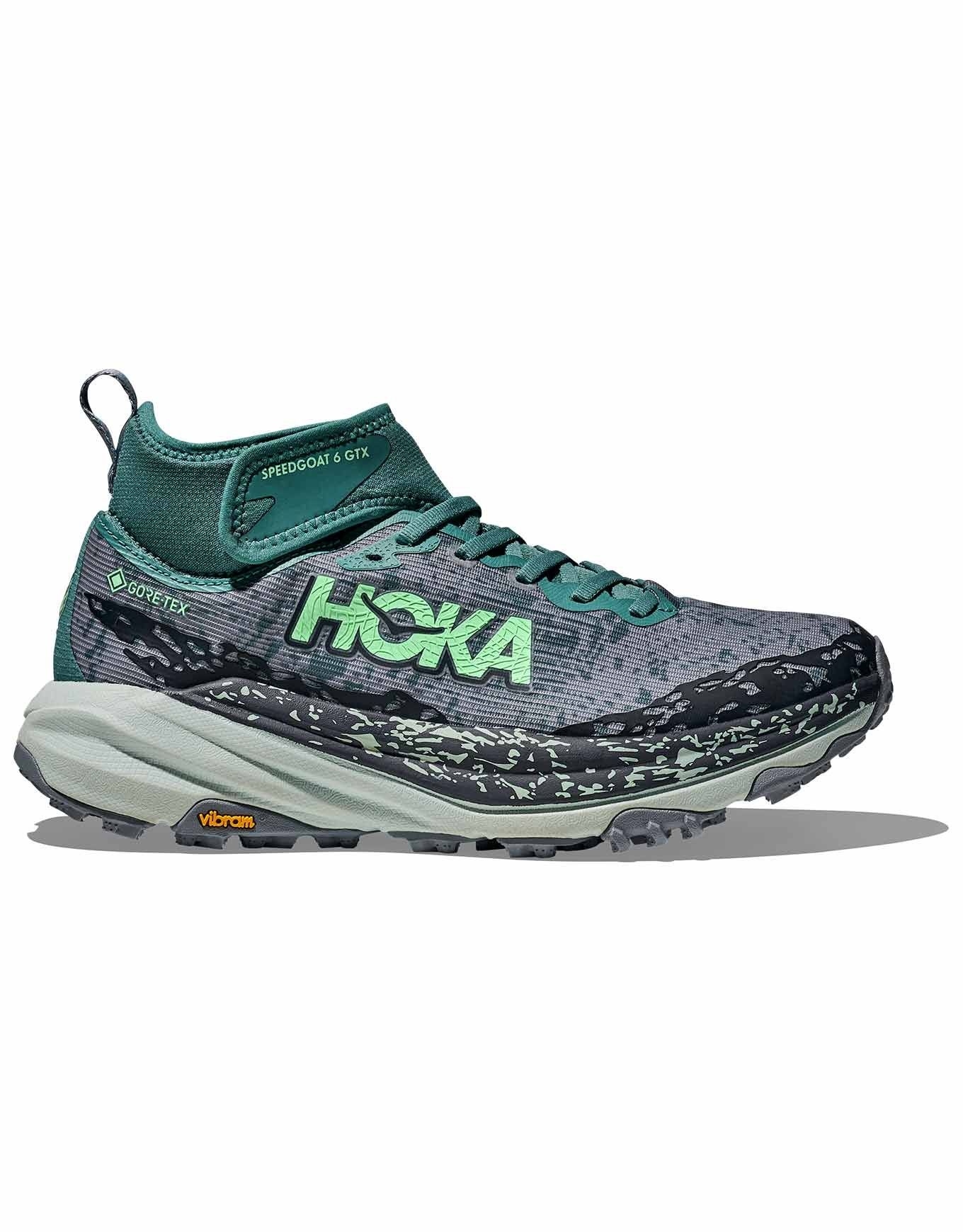 Chaussure de trail femme Hoka Speedgoat 6 Mid GTX Mountain Fog/Droplet, conçue avec Karl Meltzer : membrane GORE-TEX imperméable, semelle Vibram Megagrip 5 mm, stabilité renforcée et chaussage facile.