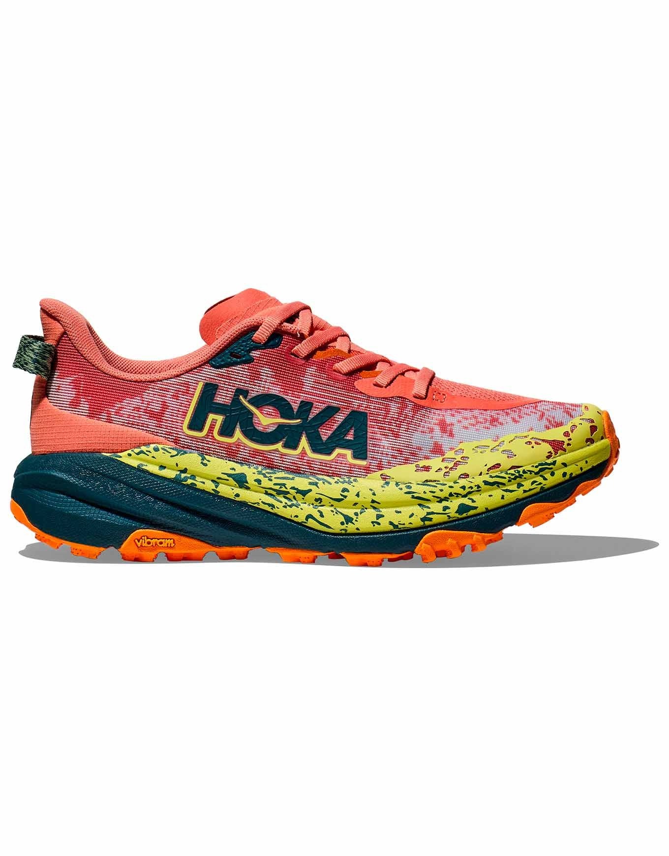 Chaussure de trail femme Hoka Speedgoat 6 Feldspar/Blue Twilight, développée avec Karl Meltzer : semelle Vibram Megagrip 5 mm, mesh double couche respirant, stabilité et amorti longue distance.