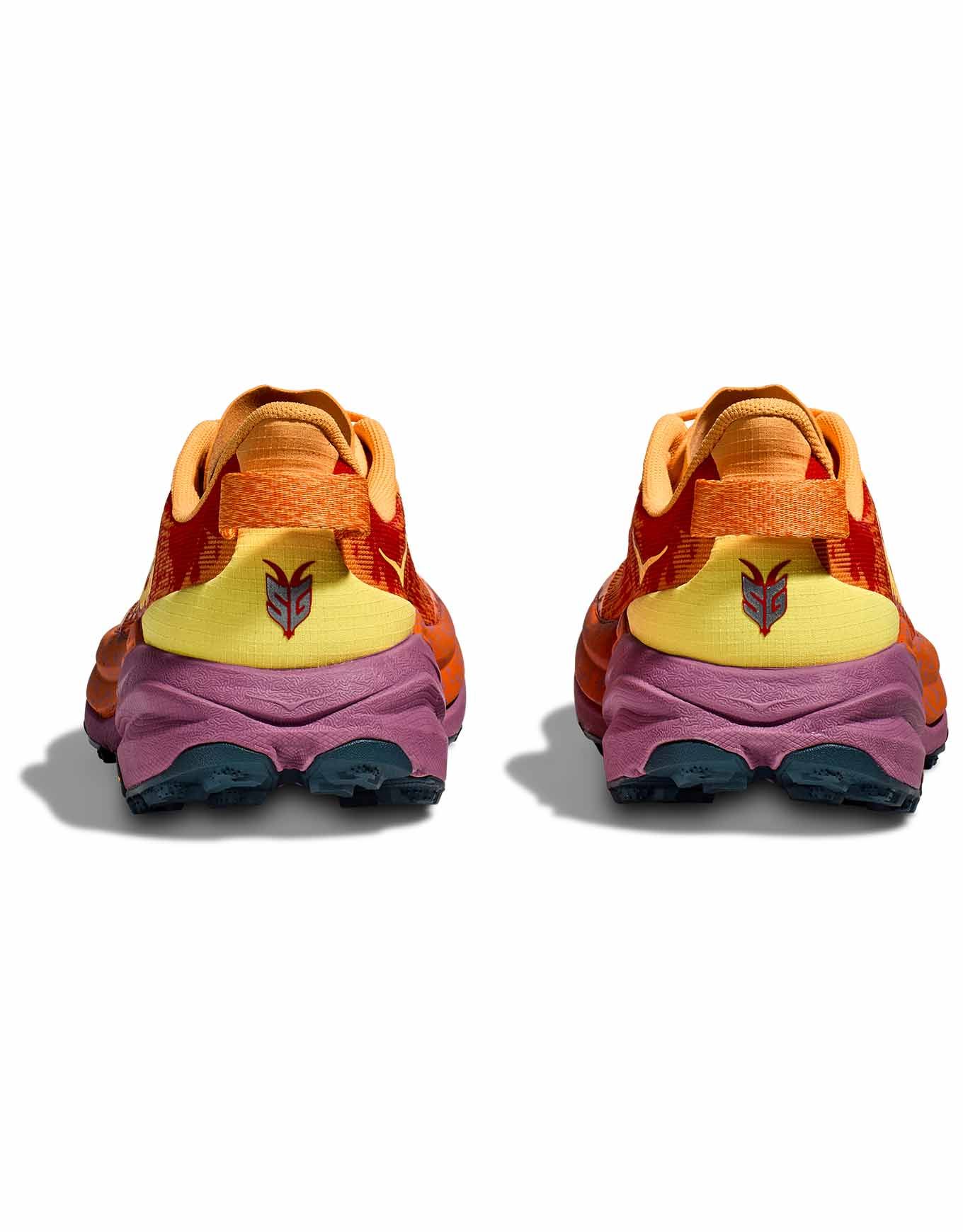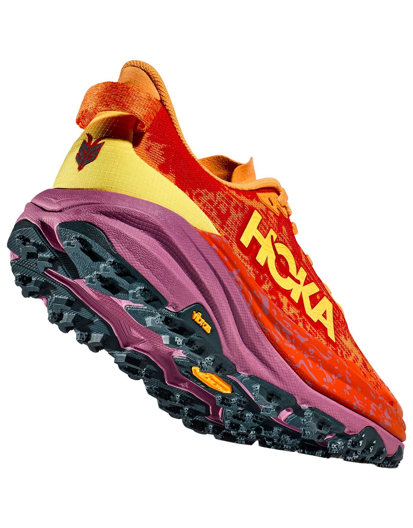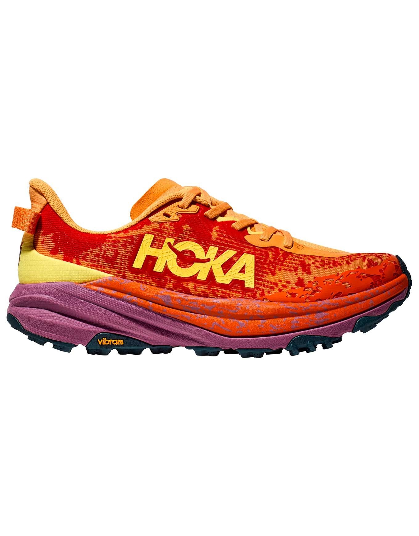 La Speedgoat 6 Sherbet/Beet Root Hoka est une chaussure de trail femme conçue avec Karl Meltzer pour offrir stabilité, protection et confort sur longues distances. Sa semelle Vibram® Megagrip à crampons de 5 mm assure traction et amorti sur tous terrains, tandis que la tige mesh double couche respirante garantit maintien et légèreté.