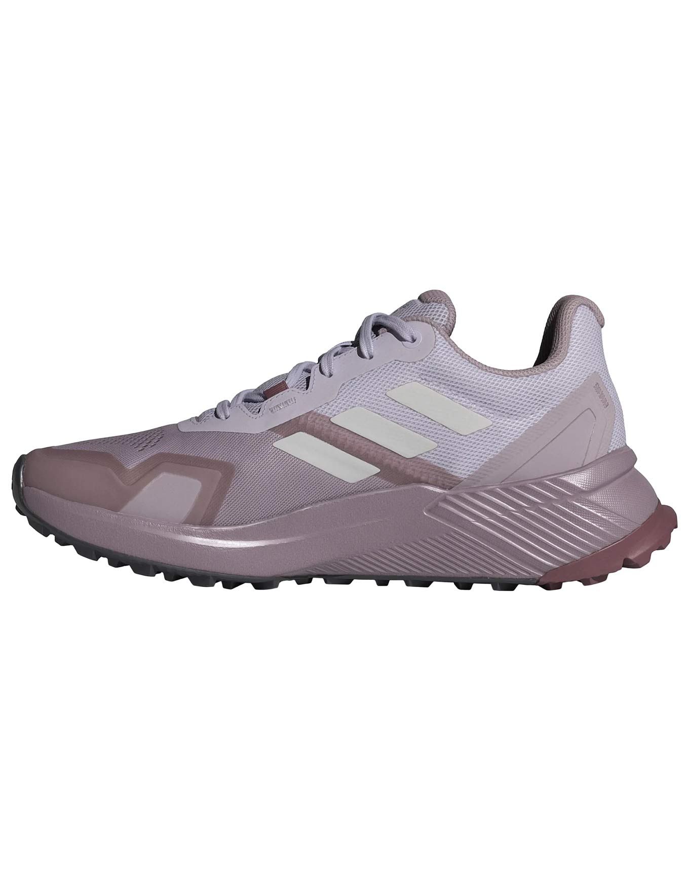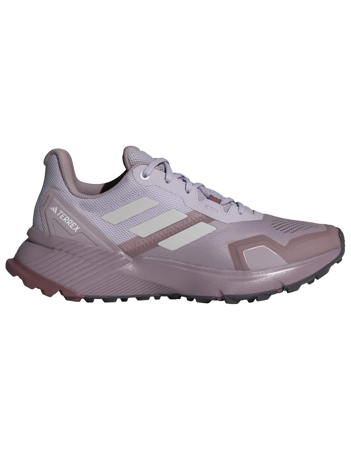 Chaussure de trail running femme Adidas Soulstride W Preloved en mesh technique, semelle Traxion et intercalaire EVA pour stabilité, amorti durable et légèreté sur tous terrains, avec plus de 50 % de matériaux recyclés.