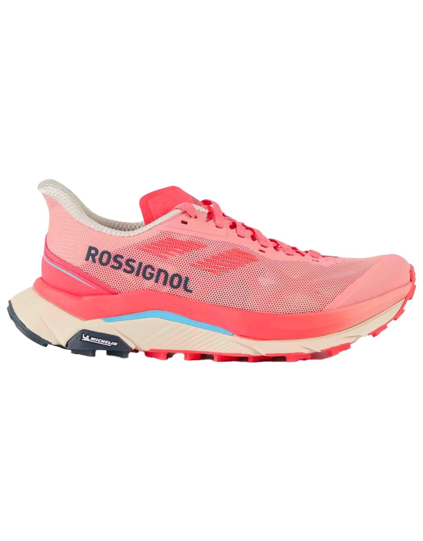 Rossignol Vezor Peach Cream, chaussure de trail femme, allie mesh respirant partiellement recyclé, semelle intermédiaire EVA avec insert Diapazon+ et semelle extérieure Michelin OCX3 pour précision, maintien et adhérence sur sentiers techniques.