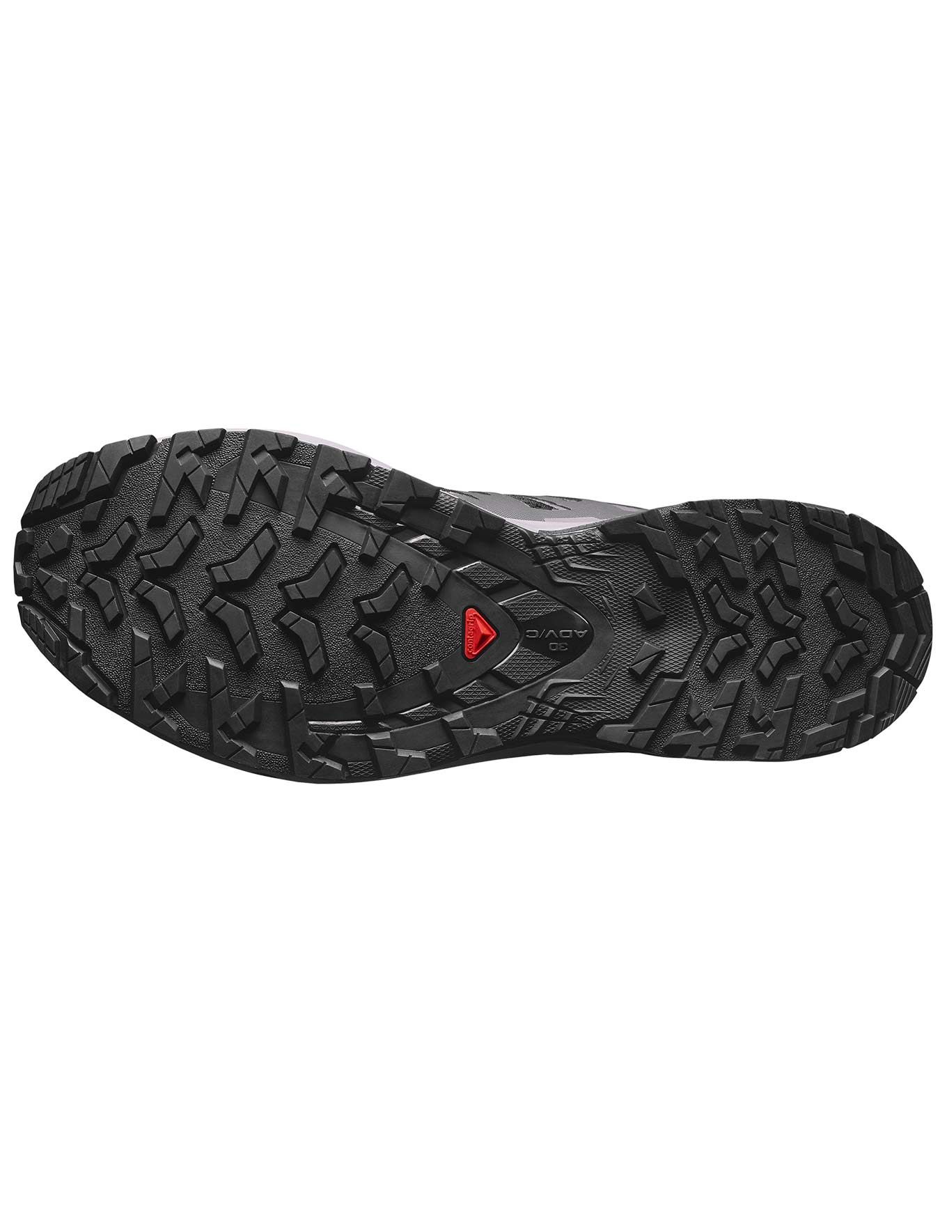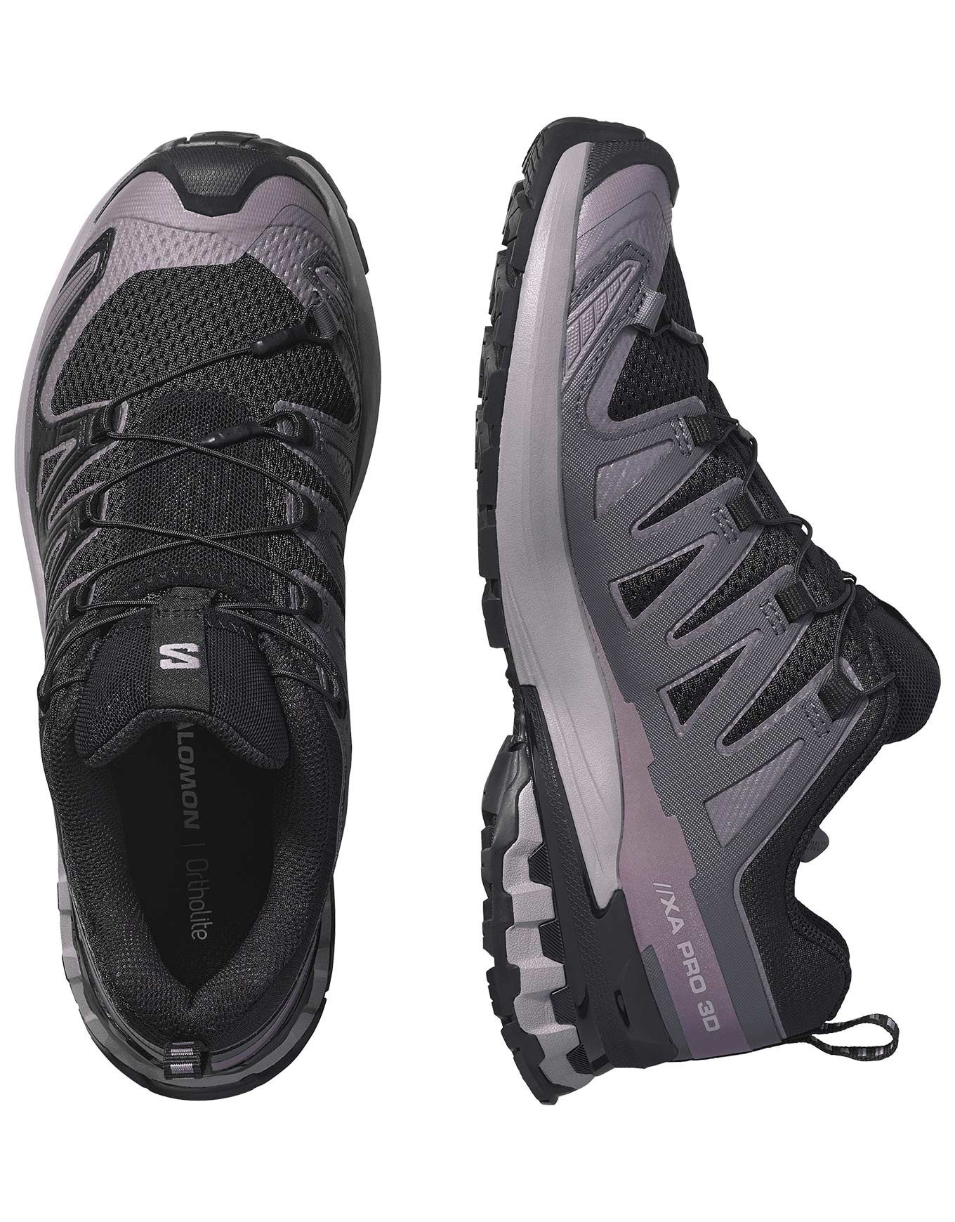 Chaussure de trail femme Salomon XA Pro 3D V9 Black/Gull, stable, amortie et grippante grâce au châssis 3D et à la semelle All Terrain Contagrip™.