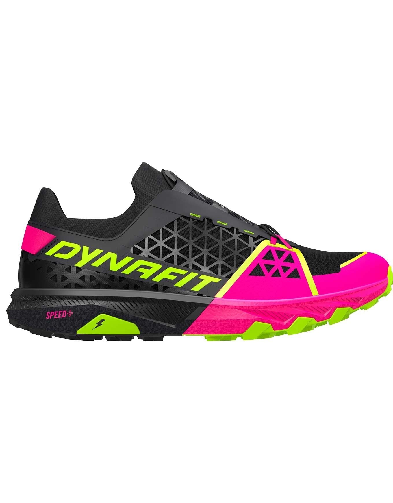 Chaussure de trail Dynafit Alpine DNA 2 Pink Glo/Black Out, 520 g, drop 6 mm, semelle Vibram® Litebase, lacing Double Speed et intercalaire SPEED+ pour réactivité et adhérence sur terrain technique.