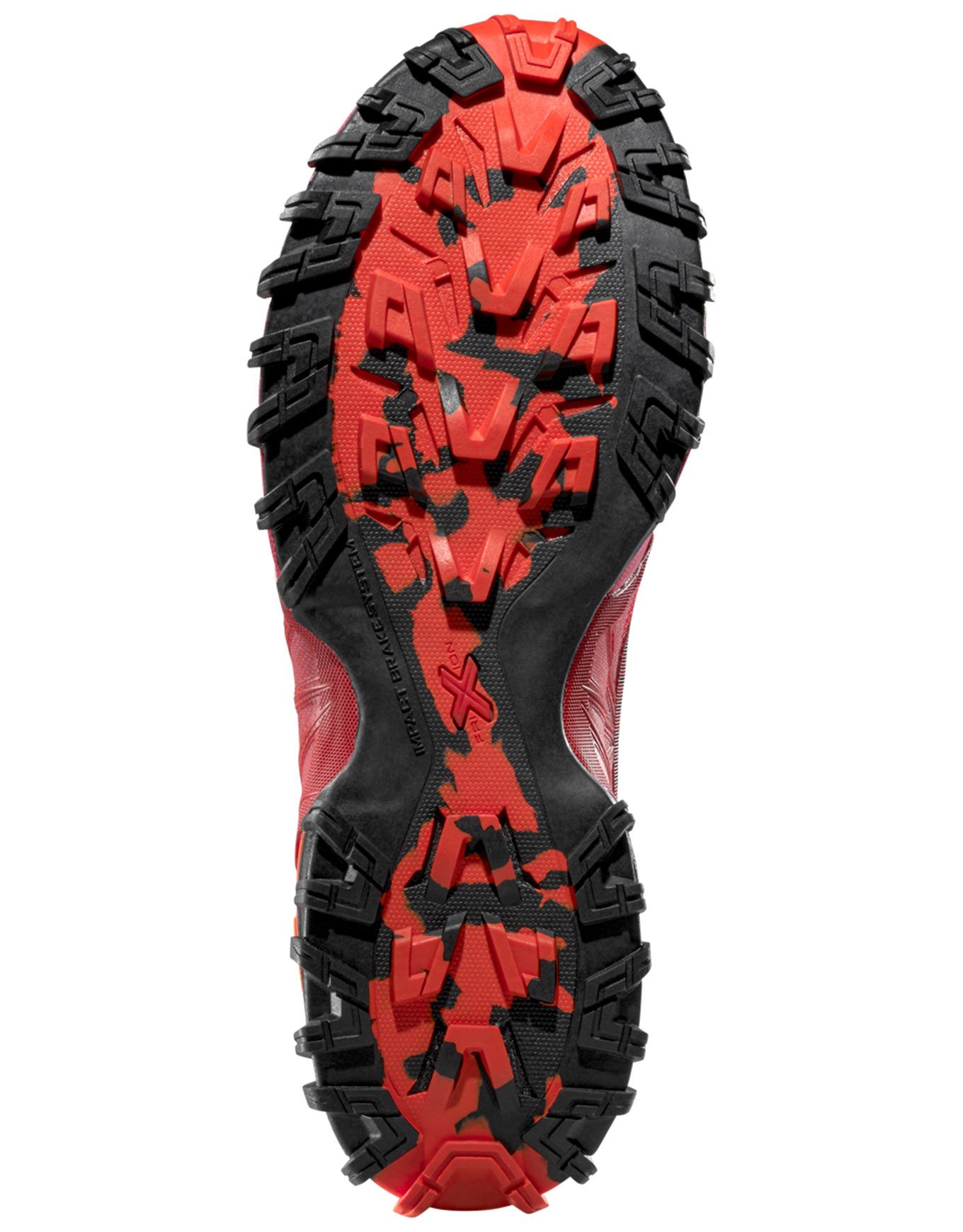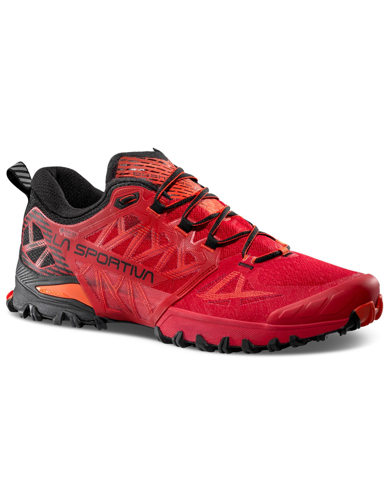 La Sportiva Bushido III GTX Tango Red/Black : chaussure de trail homme pour compétition moyenne et longue distance, imperméable GORE-TEX Invisible Fit, légère, adhérente et stable sur tout terrain.
