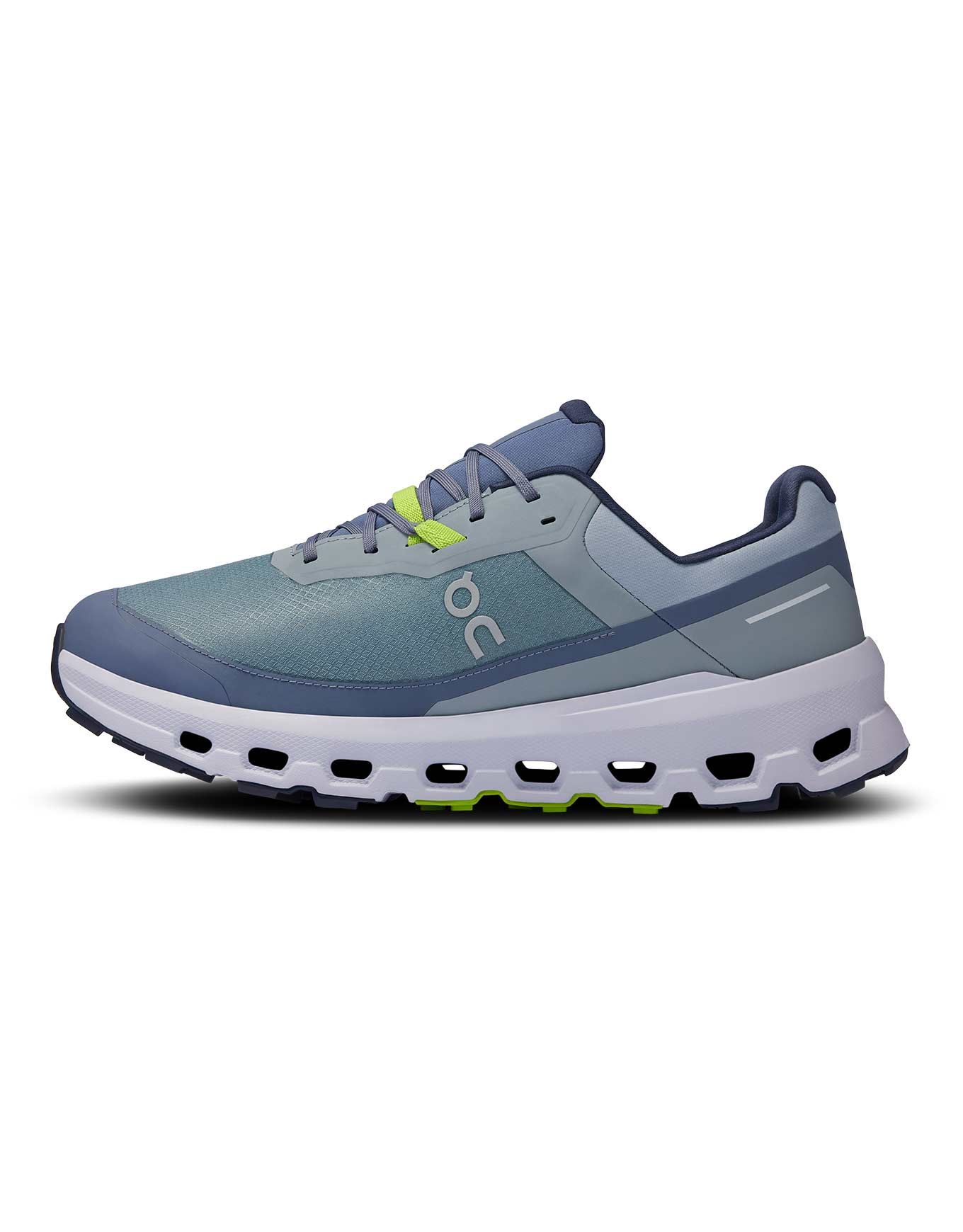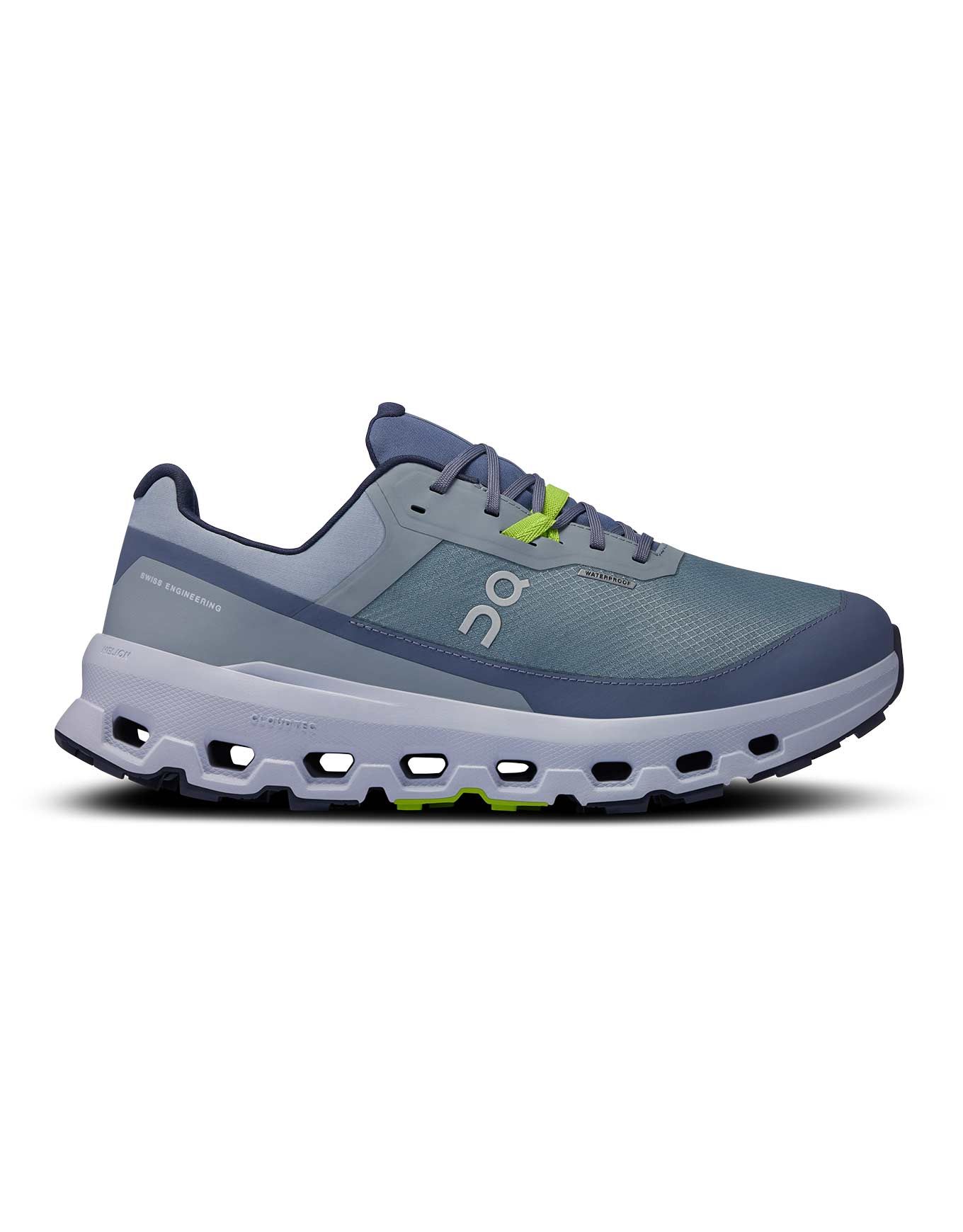 Chaussure de trail running homme On Running Cloudvista 2 Waterproof Mist/Heather, membrane imperméable 20 % recyclée, semelle Missiongrip™ multi-crampons, amorti Helion™ superfoam et CloudTec® pour confort et adhérence sur terrains variés.