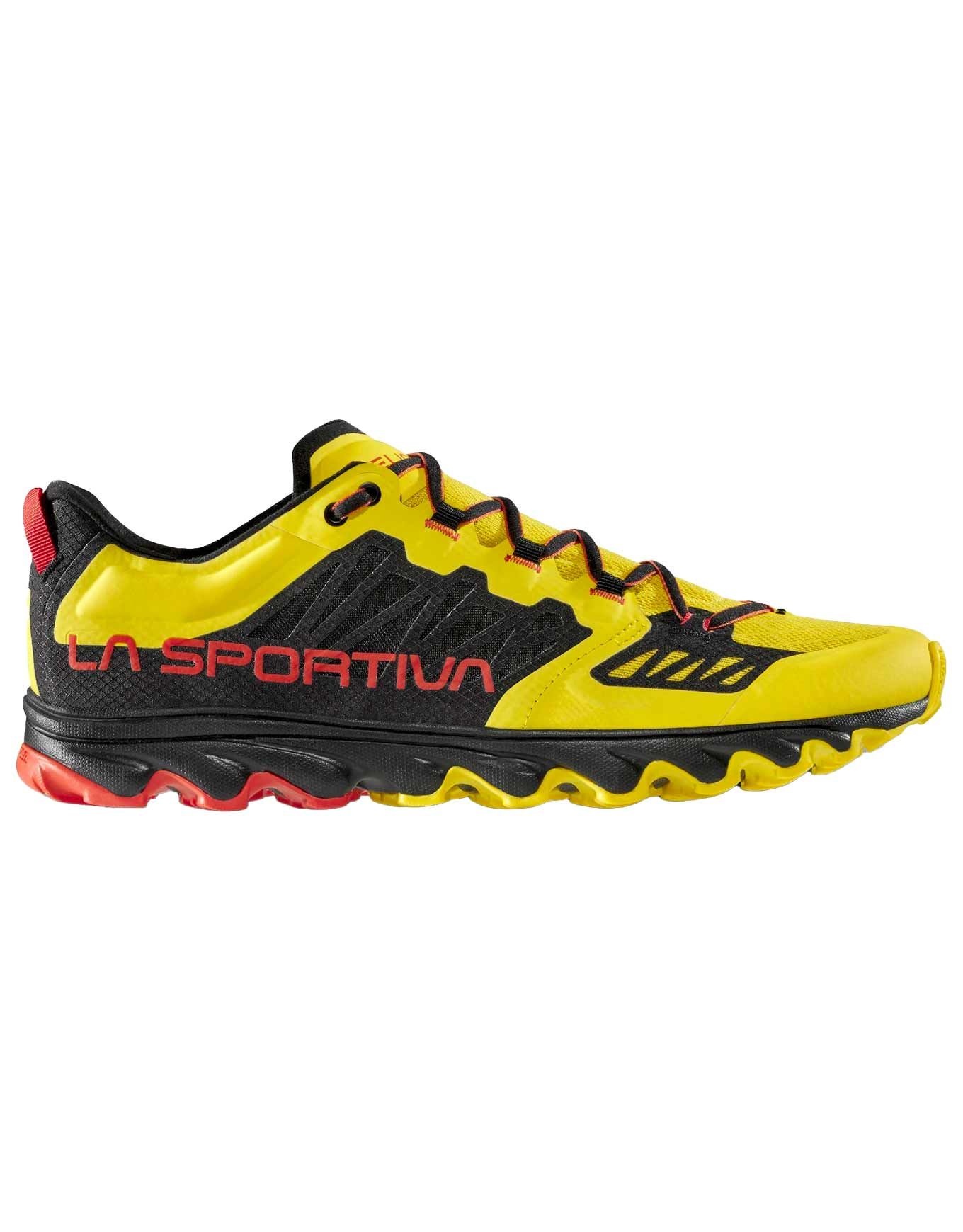 La Sportiva Helios III Yellow/Black est une chaussure de trail-running homme conçue pour les entraînements sur terrains durs, offrant légèreté, respirabilité et durabilité grâce à ses matériaux thermo-adhésifs et son tissu anti-déchirures.