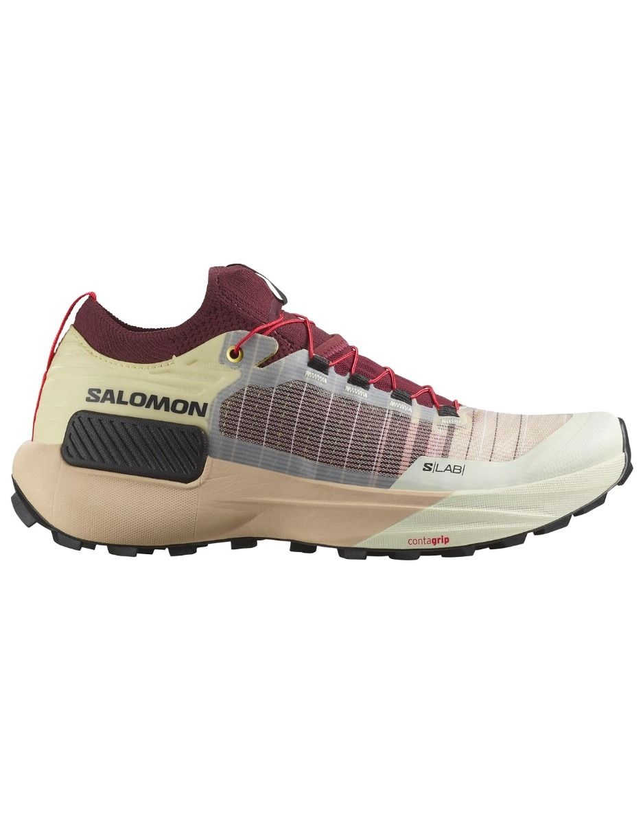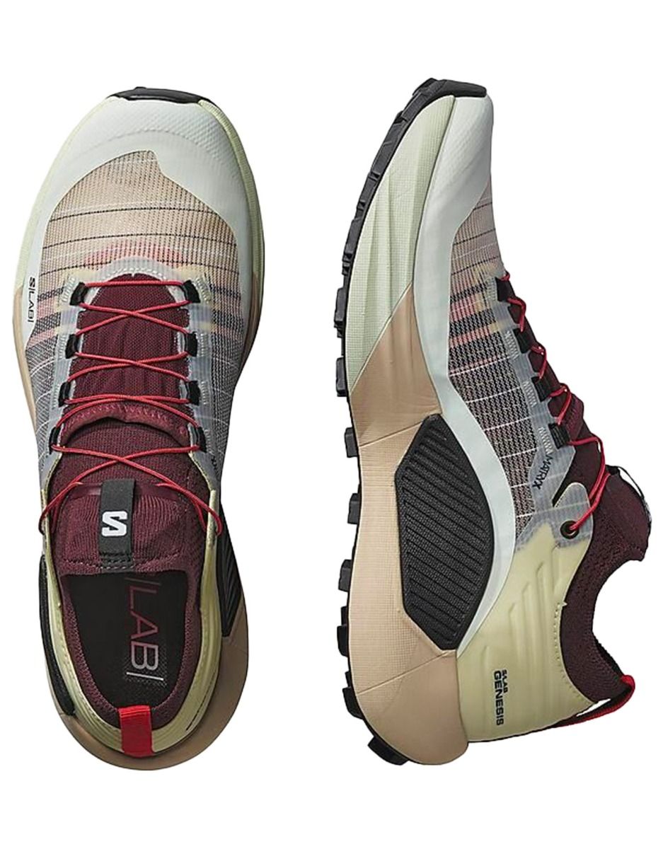 Chaussure de trail-running unisexe Salomon S/Lab Genesis Vanilla Ice/Decadent Chocolate/Black, 516 g la paire, semelle Contragrip® et Energy Foam, tissu Matryx® avec guêtres intégrées pour terrains techniques.