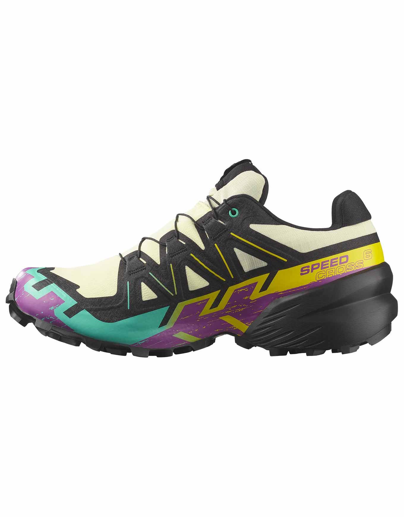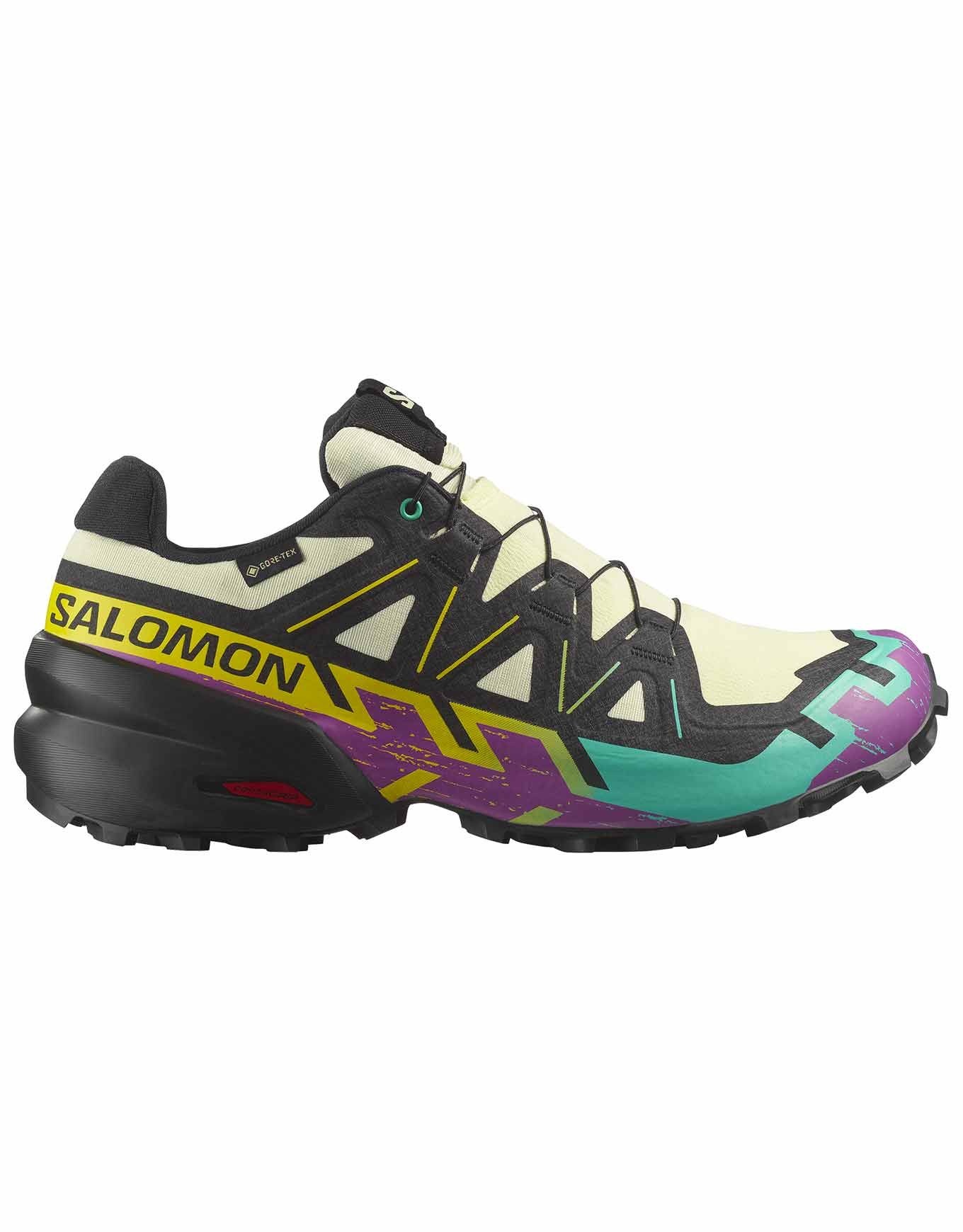Salomon Speedcross 6 GTX Transparent, chaussure de trail-running homme, allège la légende pour une accroche Mud Contagrip® maximale sur sols gras et pentes humides. SensiFit™ + talon enveloppant assure stabilité et maintien, EnergyCell™+ et tige sans couture garantissent amorti et confort sans frottement, tandis que la membrane GORE-TEX garde le pied au sec.