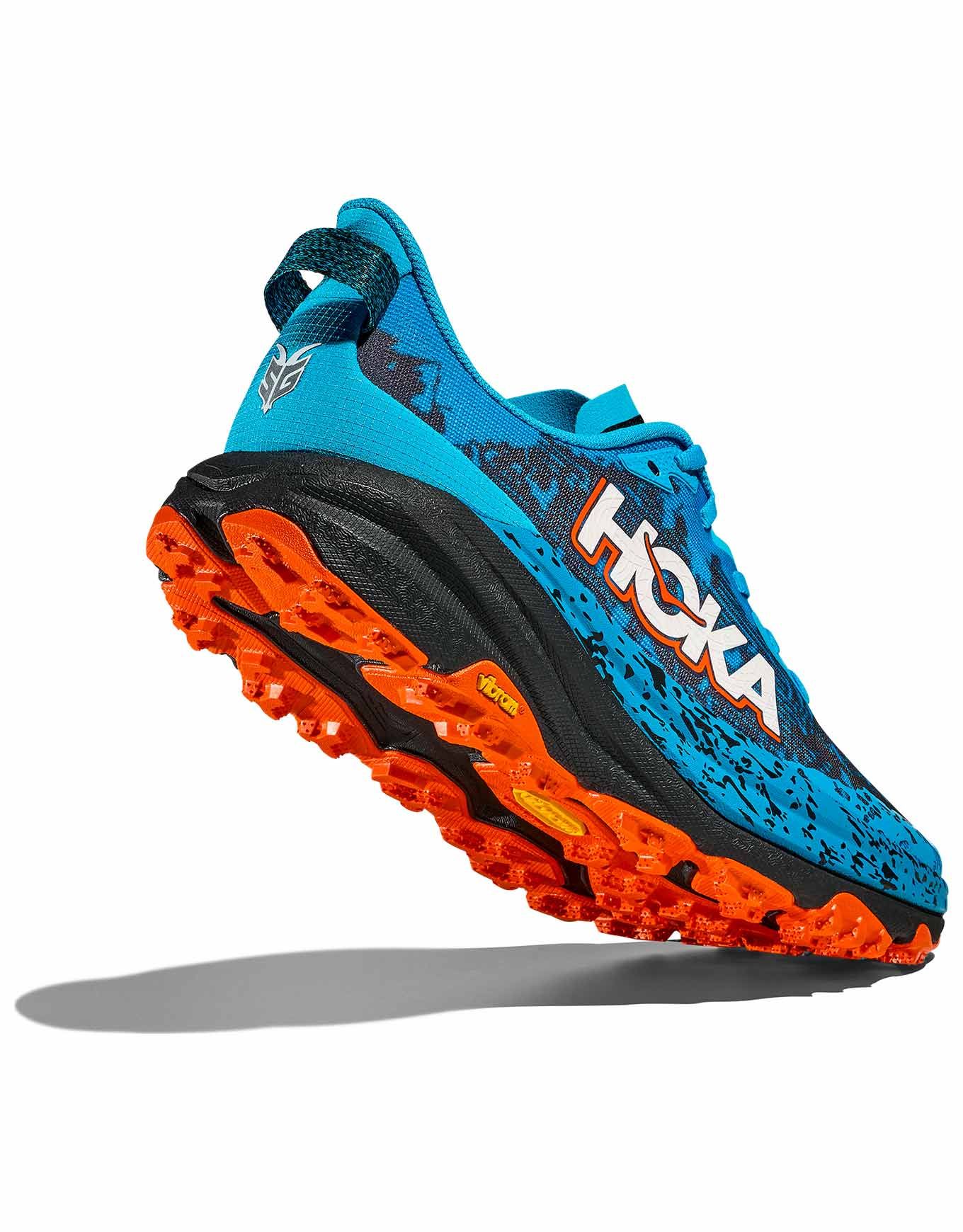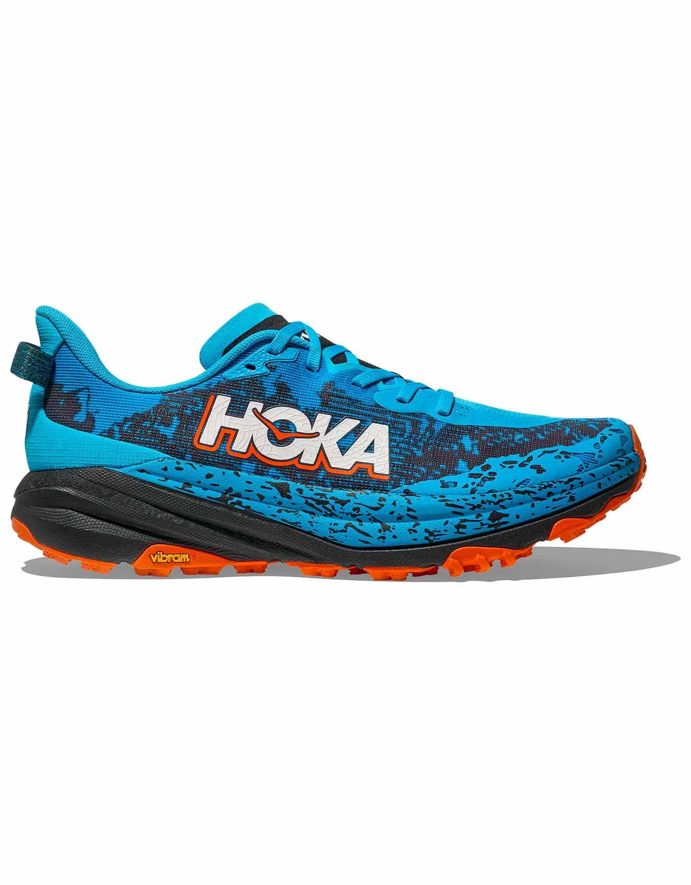 Hoka Speedgoat 6 Skyward Blue/Black, chaussure de trail homme conçue avec Karl Meltzer, allie stabilité, protection et confort sur longues distances. Sa semelle Vibram Megagrip à crampons 5 mm et sa tige mesh double couche offrent adhérence, amorti et maintien sur tous terrains.
