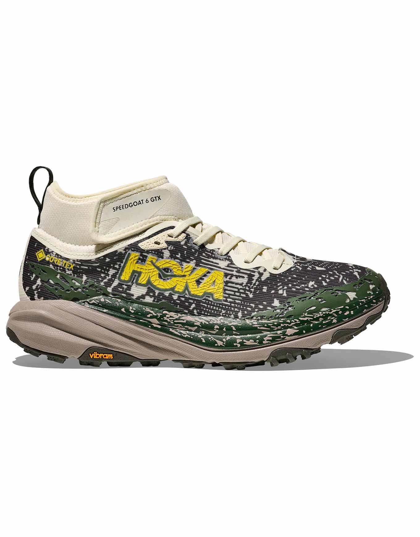 La Speedgoat 6 Mid GTX de Hoka est une chaussure de trail homme conçue pour les longues distances, offrant stabilité, protection et confort grâce à sa membrane GORE-TEX imperméable, sa semelle Vibram® Megagrip à crampons de 5 mm et sa tige mi-haute.