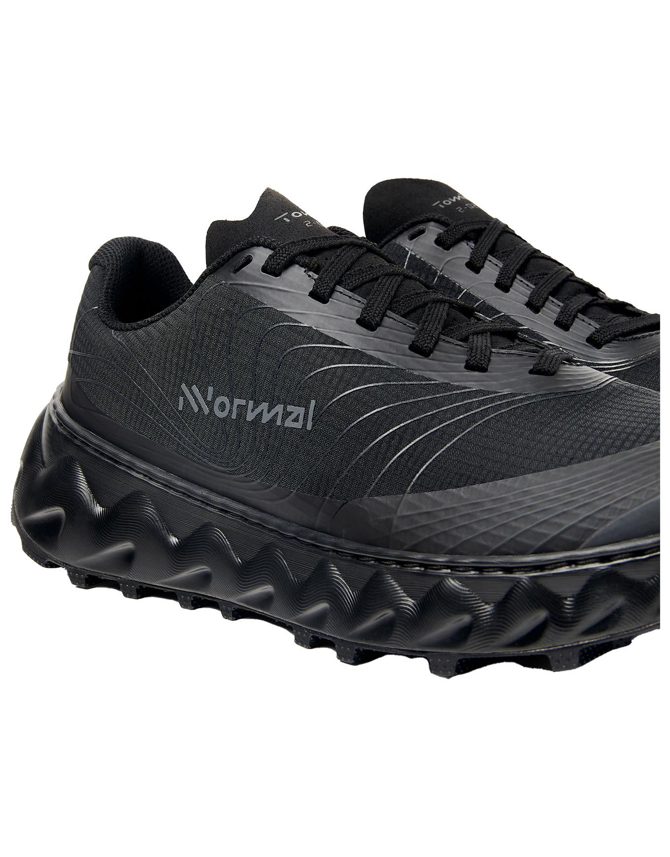 Chaussure de trail running NNormal Tomir 2.0 Black, conçue pour terrains techniques : tige polyester/TPE respirante, crampons 5 mm Traction Lug, semelle Vibram Megagrip + Litebase, pare-pierre et amorti EExpure.