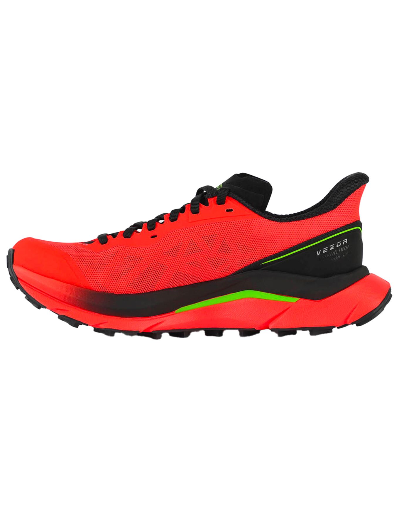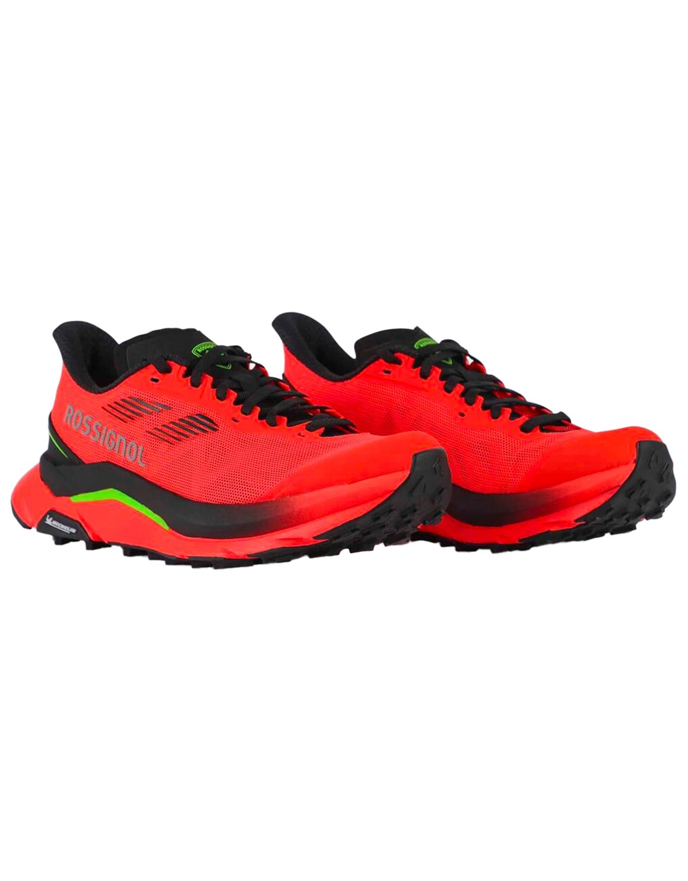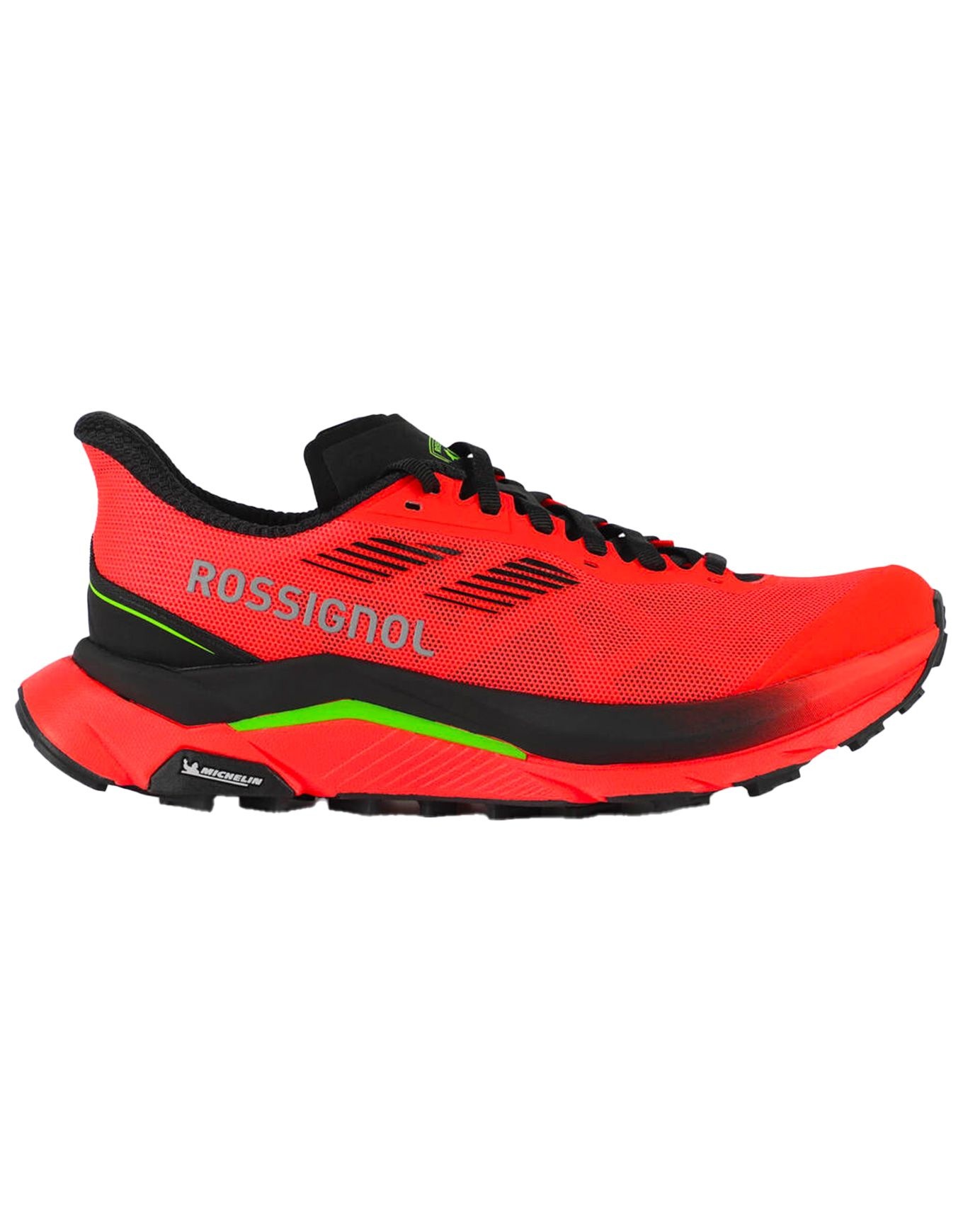 Rossignol Vezor Neon Red, chaussure de trail homme, allie mesh respirant partiellement recyclé, laçage précis et semelle Michelin OCX3 pour adhérence et dynamisme sur sentiers techniques moyenne distance.