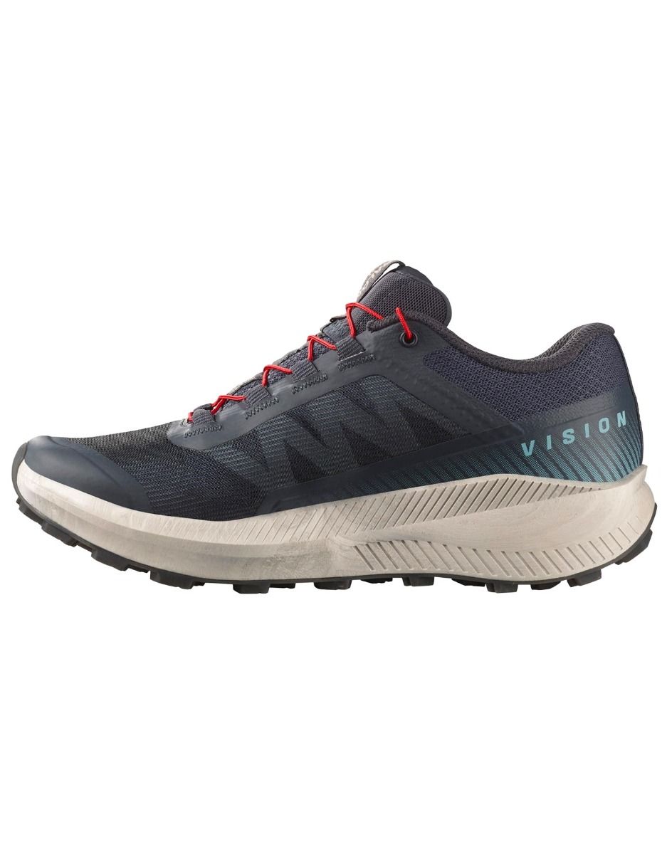 Salomon Vision India Ink/Cameo Blue/Almond Milk est une chaussure de trail-running unisexe entièrement recyclable, offrant adhérence, amorti, stabilité et dynamisme sur sentirs secs ou gras grâce à son tissu Matryx® durable.