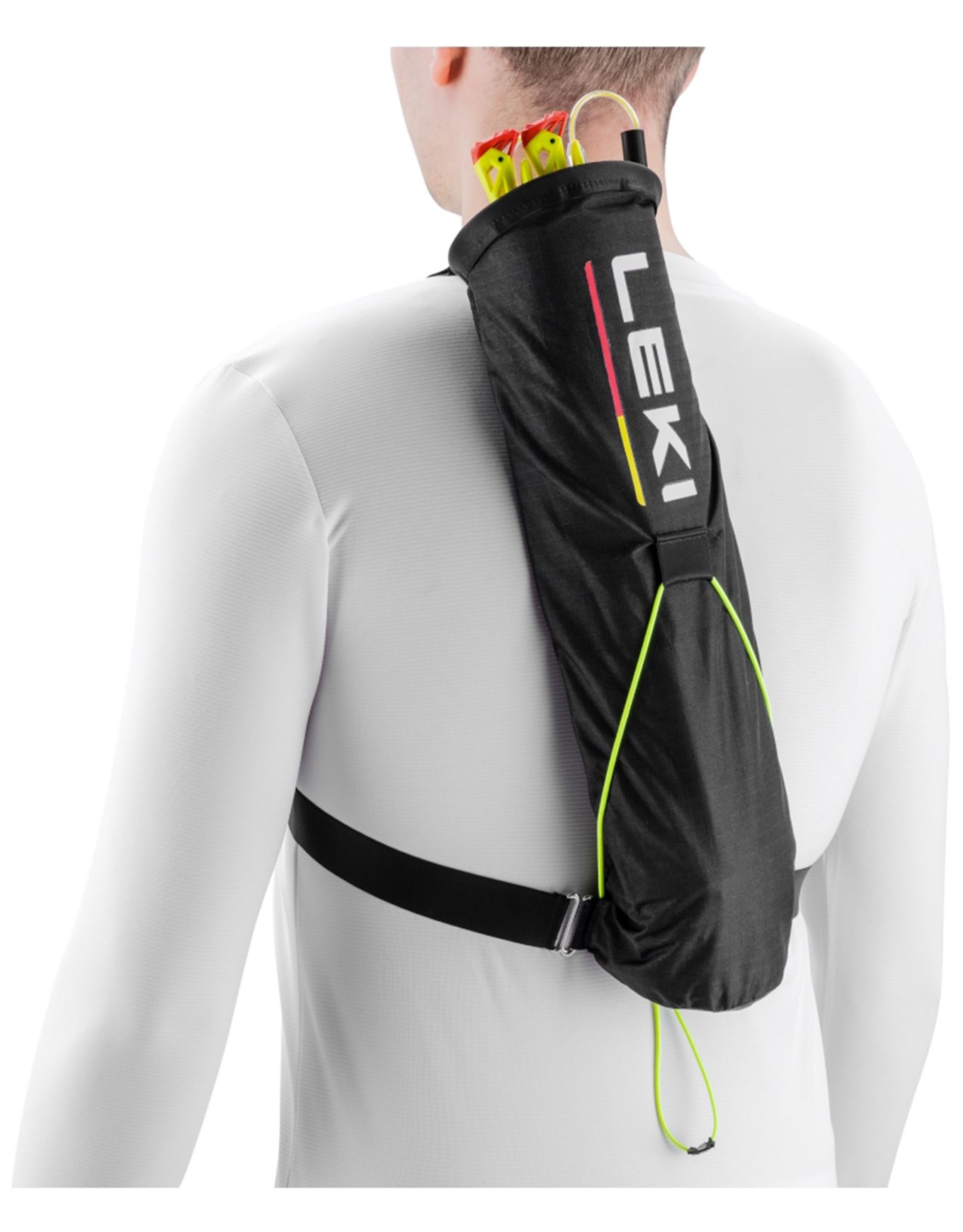 Carquois LEKI Quiver Trail : fixation rapide sur tubes 14/16 mm, transporte une paire de bâtons, port sans veste confortable par sangles épaules-torse.