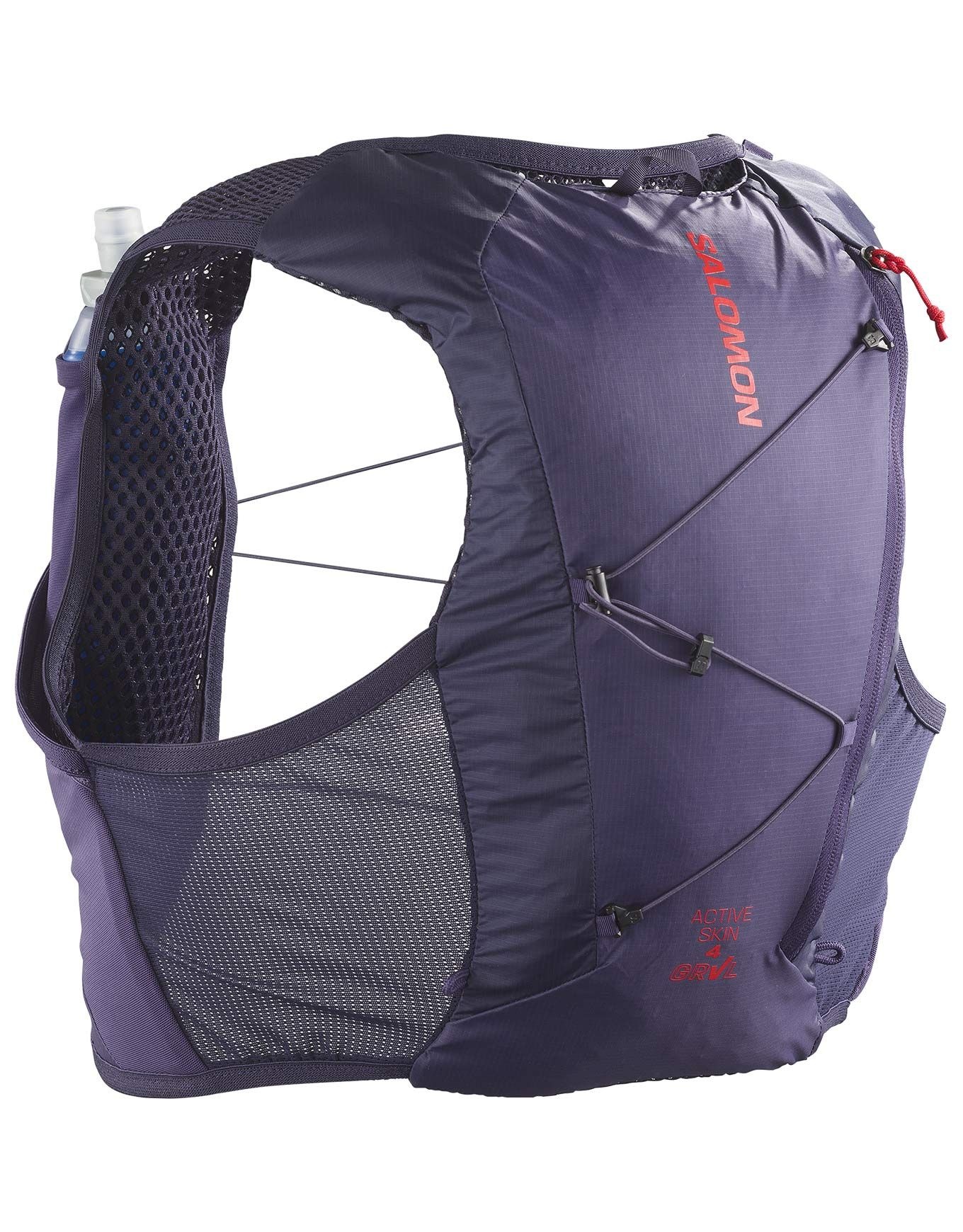 Salomon Active Skin 4 Grvl Set Maritime Blue/Astral Aura est un sac à dos de trail running ultra-léger 195 g, 4 L, Sensifit™ pour un maintien proche du corps, accès frontal aux flasques, poche à eau et porte-bâtons Custom Quiver.