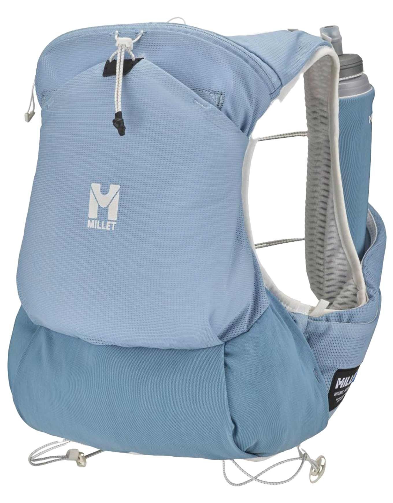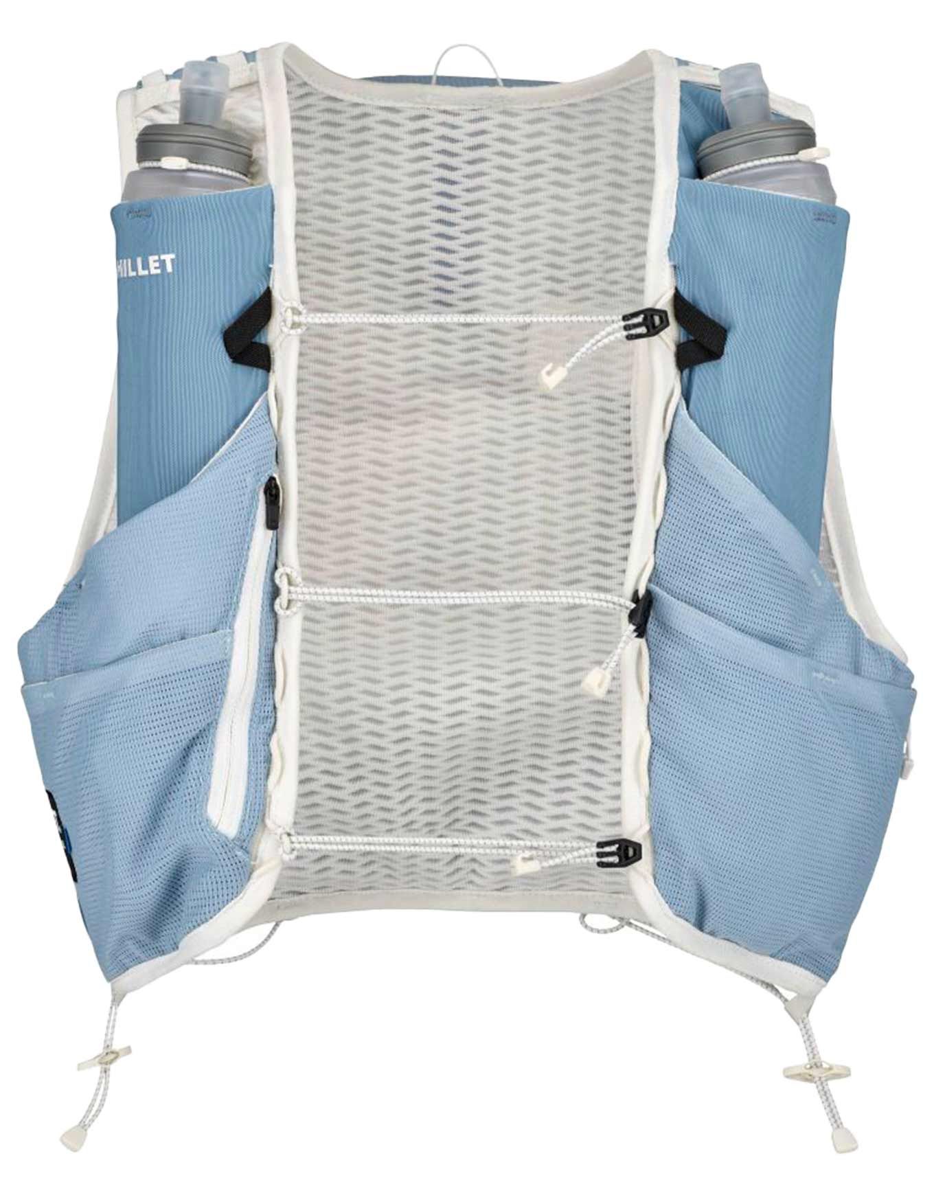 Gilet de trail running Millet Intense Ultra 15 Iceberg/Coronet Blue, 15 L en mesh 2D respirant et matières recyclées, 11 poches, 2 flasques 500 ml inclus, ajustement rapide par 3 cordons.