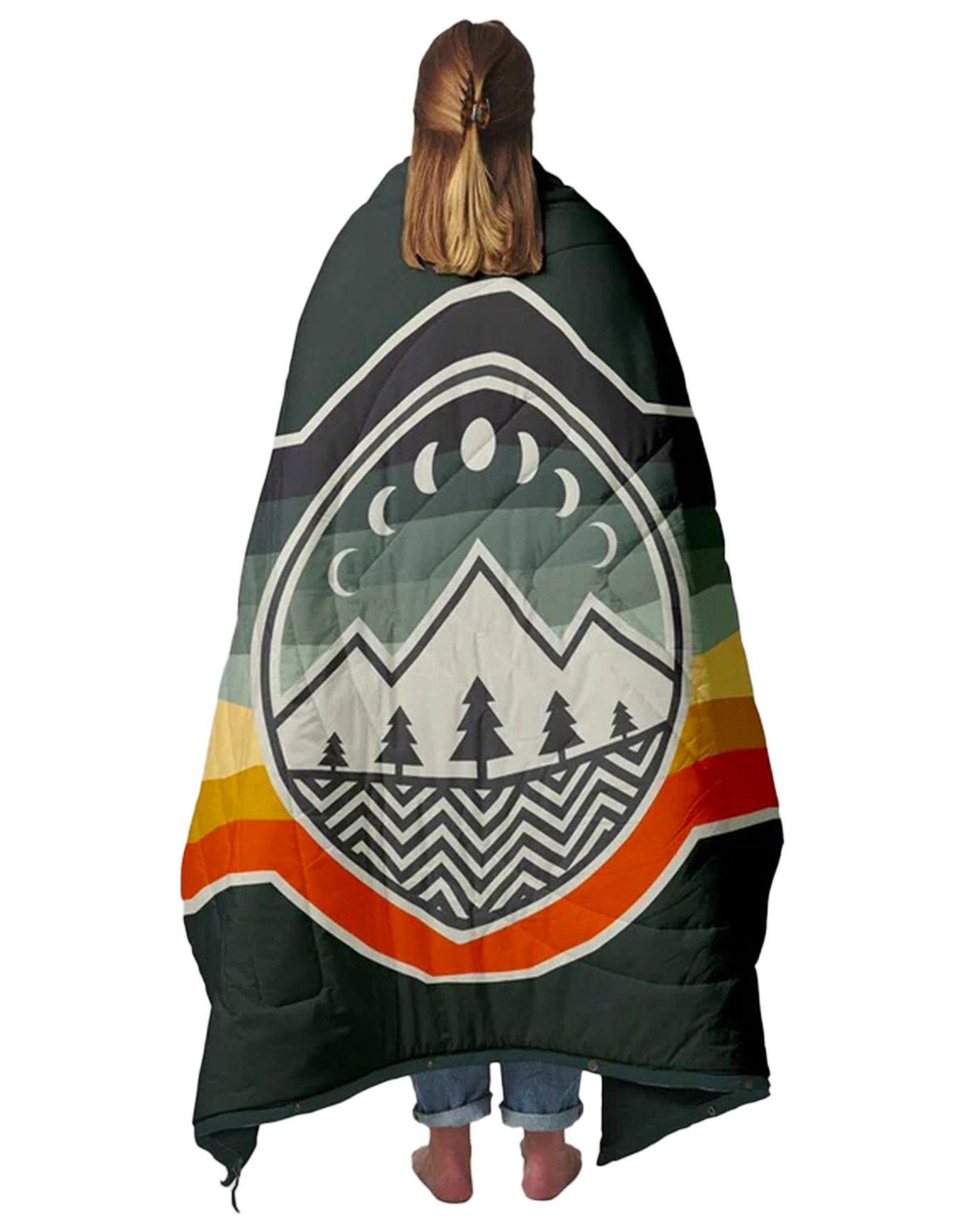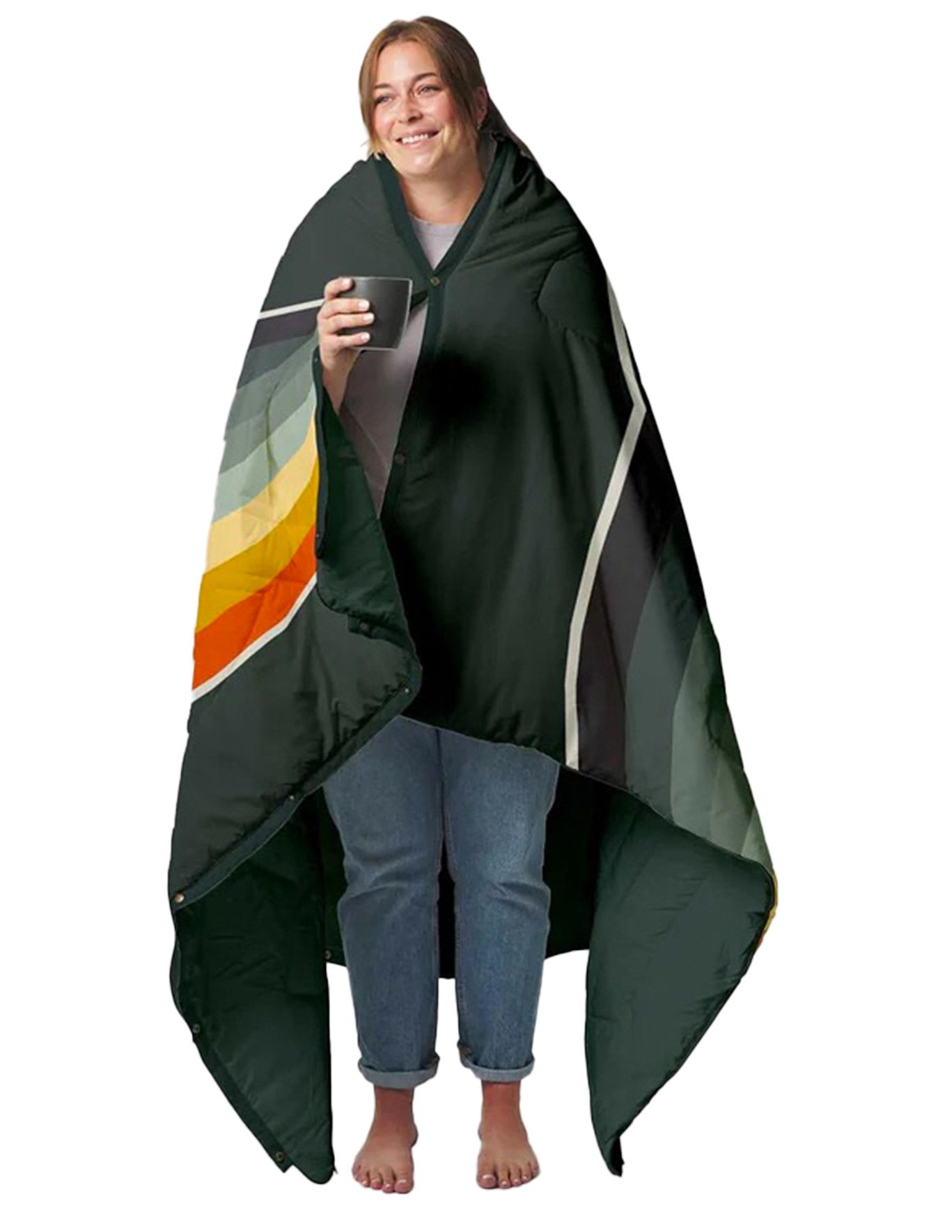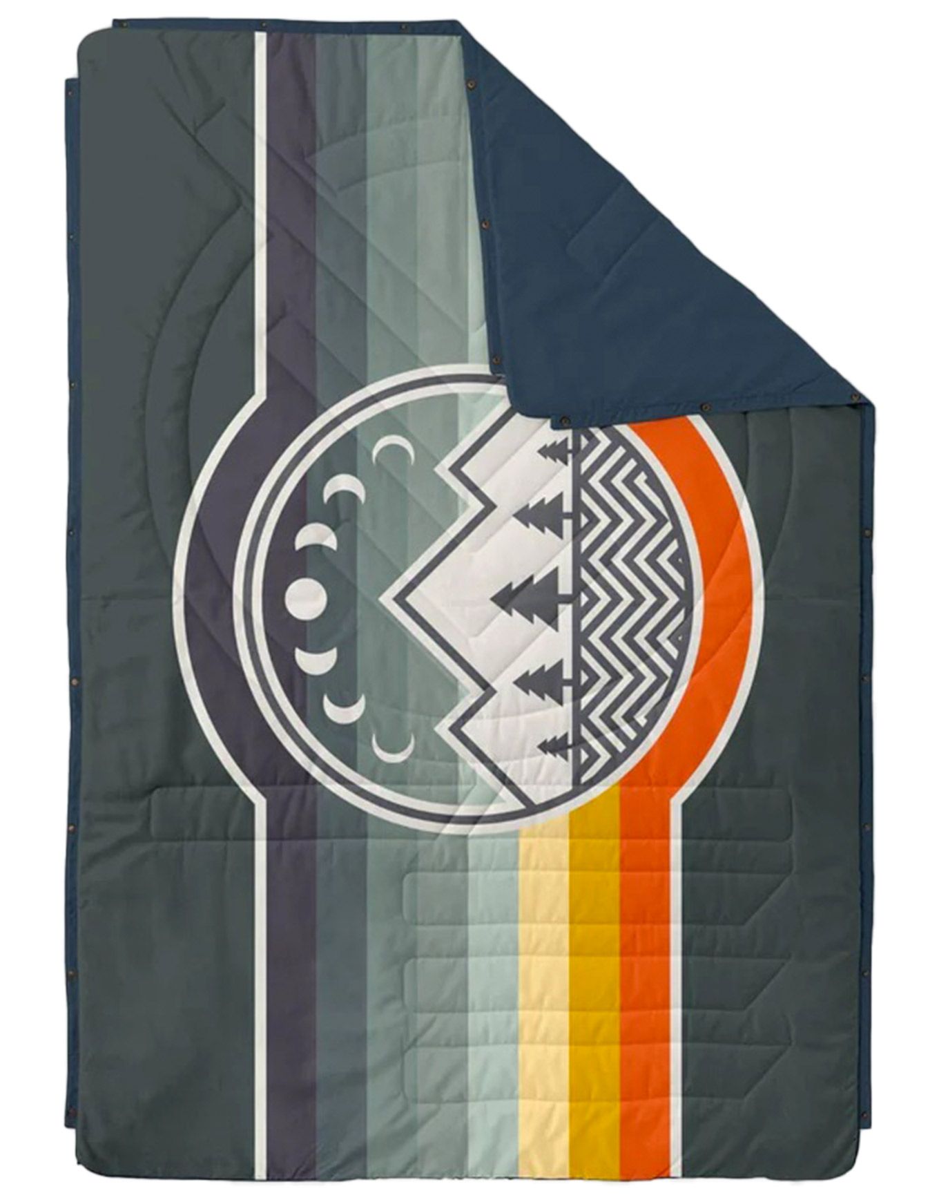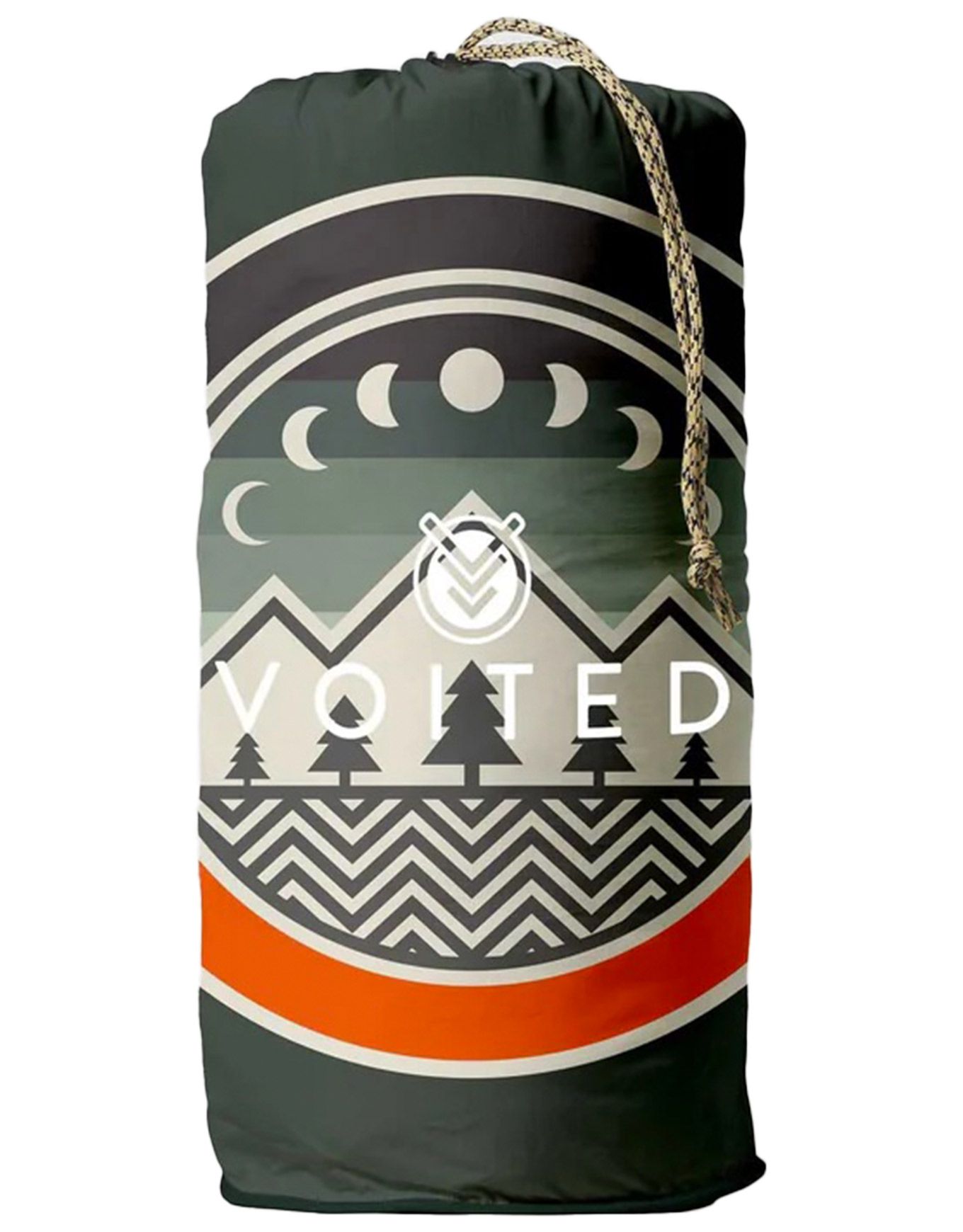 La couverture de camping 4 en 1 Voited Ripstop Blanket Camp Vibes Greengabel, en ripstop polyester recyclé REPREVE® avec isolation 3D Featherlight, assure chaleur jusqu’à 13 °C, respirabilité et imperméabilité DWR sans PFC; repliable en oreiller, poncho, sac de couchage simple ou double.