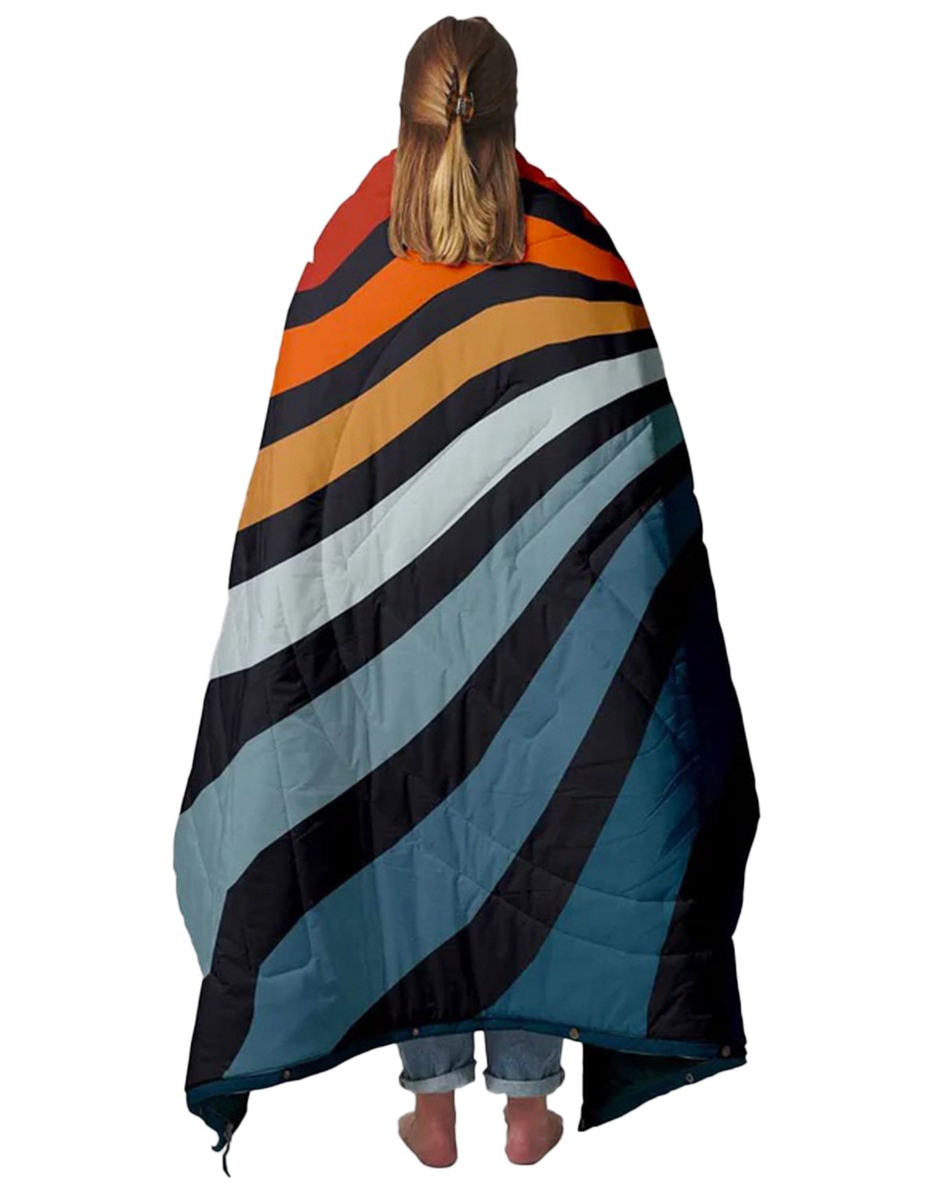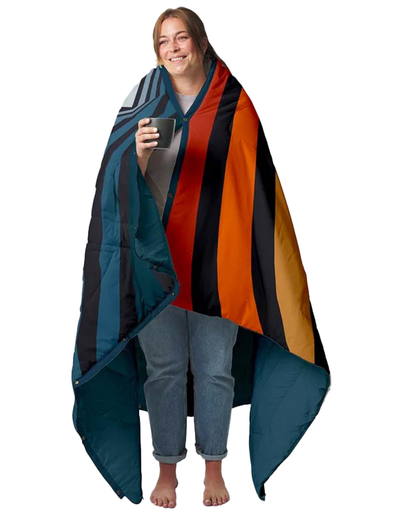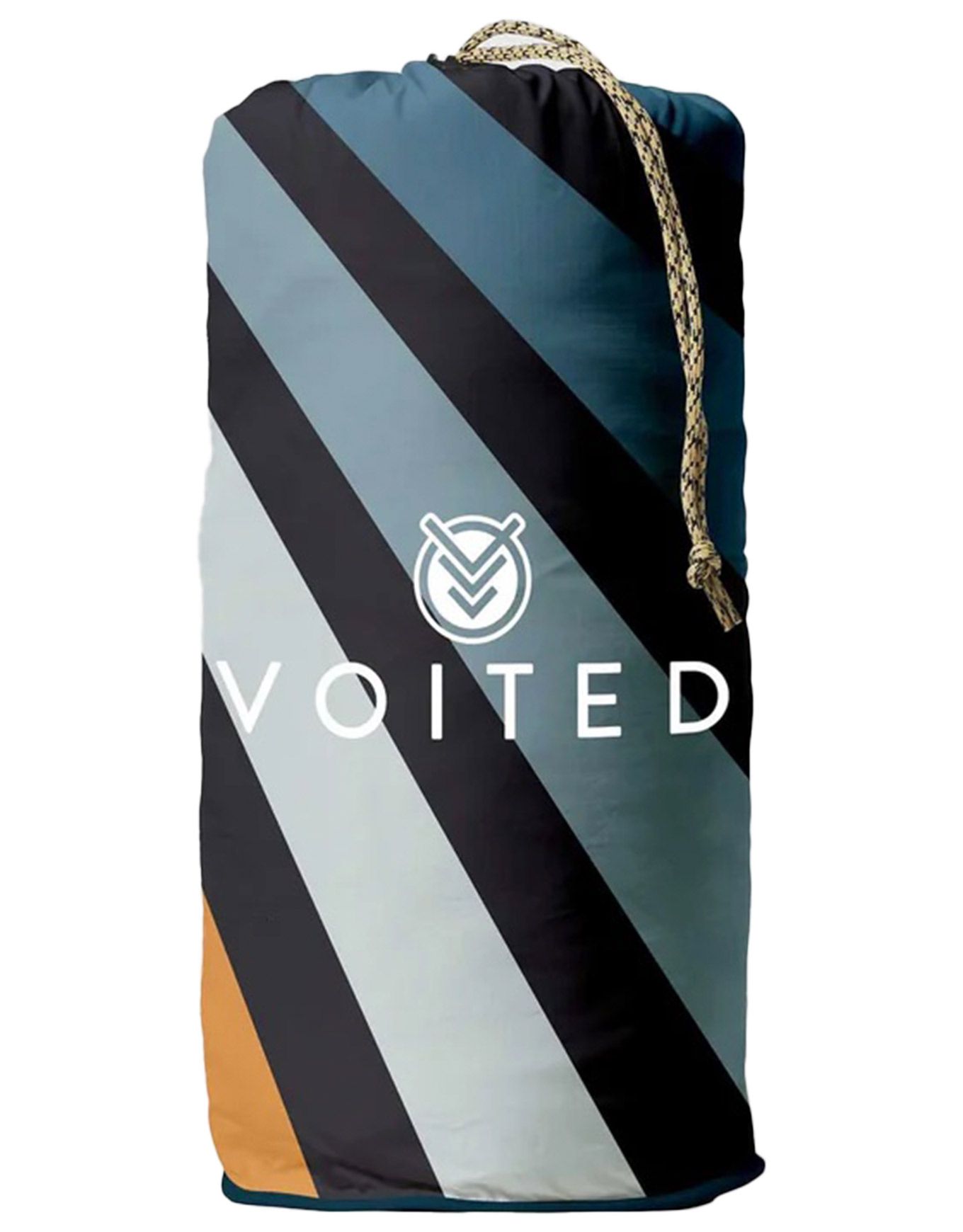 La couverture de camping Voited Ripstop Blanket Vibes 4 en 1, en ripstop polyester recyclé REPREVE® avec isolation 3D Featherlight, offre chaleur jusqu’à 13 °C, imperméabilité DWR et se transforme en oreiller, poncho ou sac de couchage simple/double.