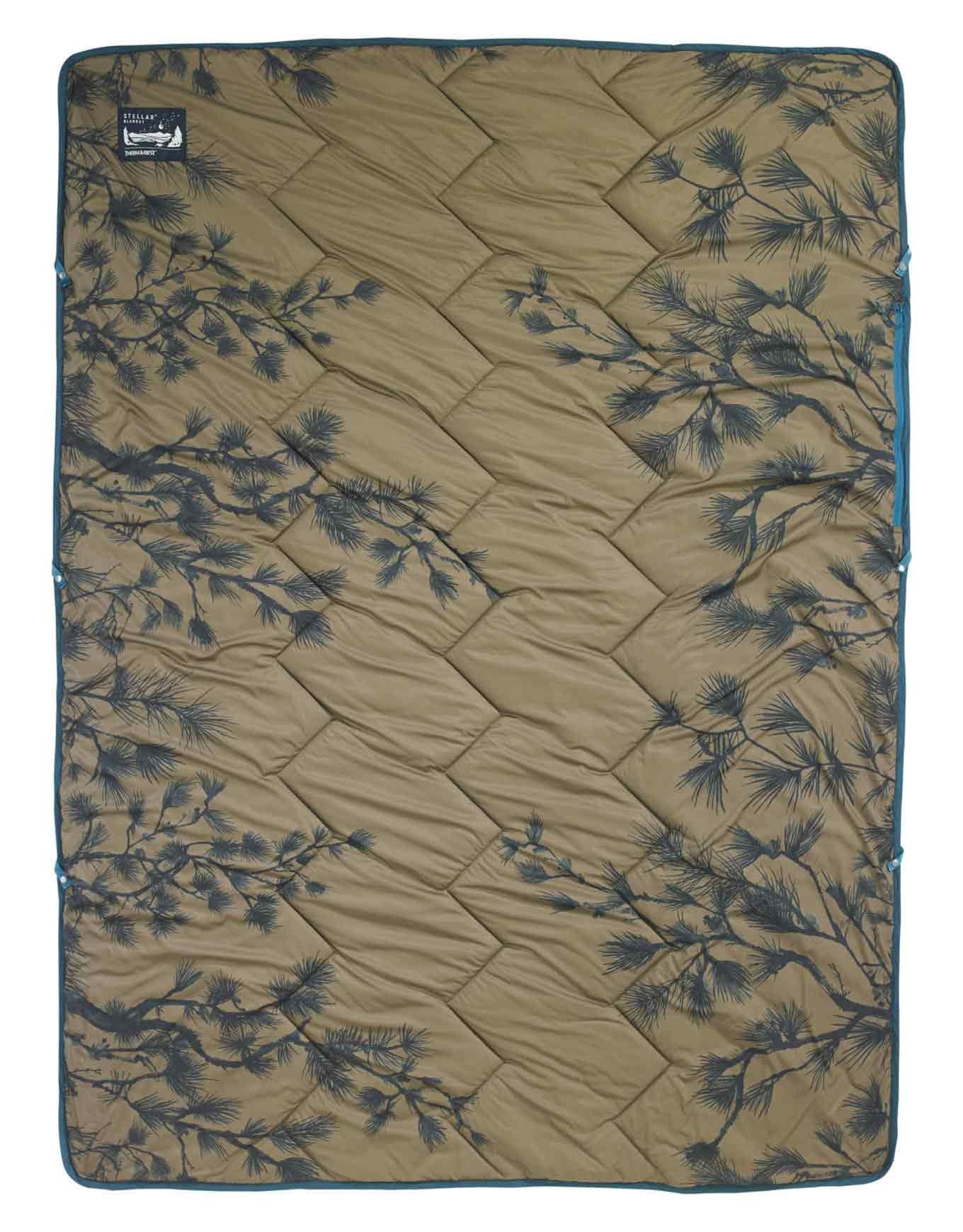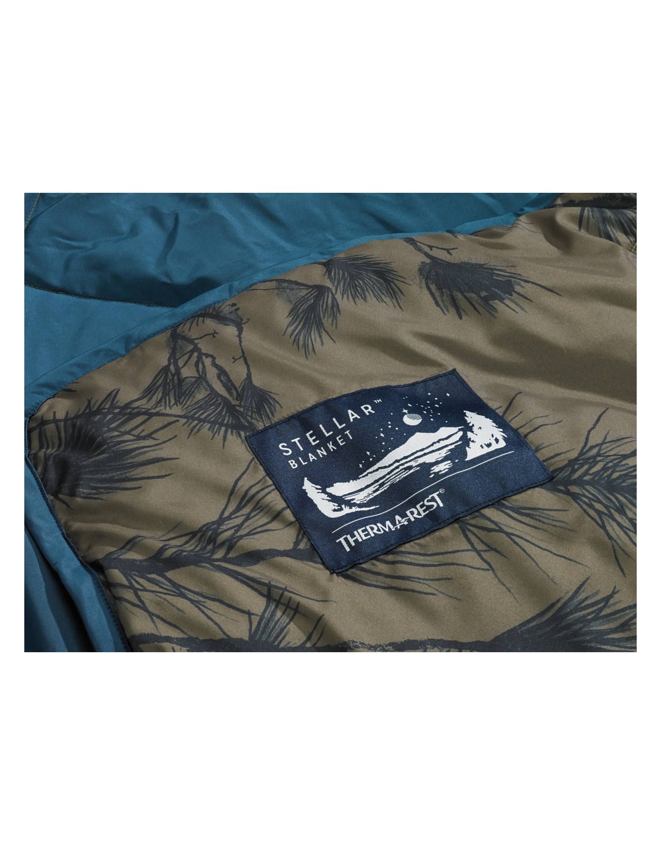 Therm-A-Rest Stellar Blnkt Peeking Pine Print est une couverture de camping légère et compressible, isolée en eraLoft™ synthétique résistant à l’humidité, doublée polyester douce, avec cordon de serrage et boutons-pression compatibles pour combinaison.