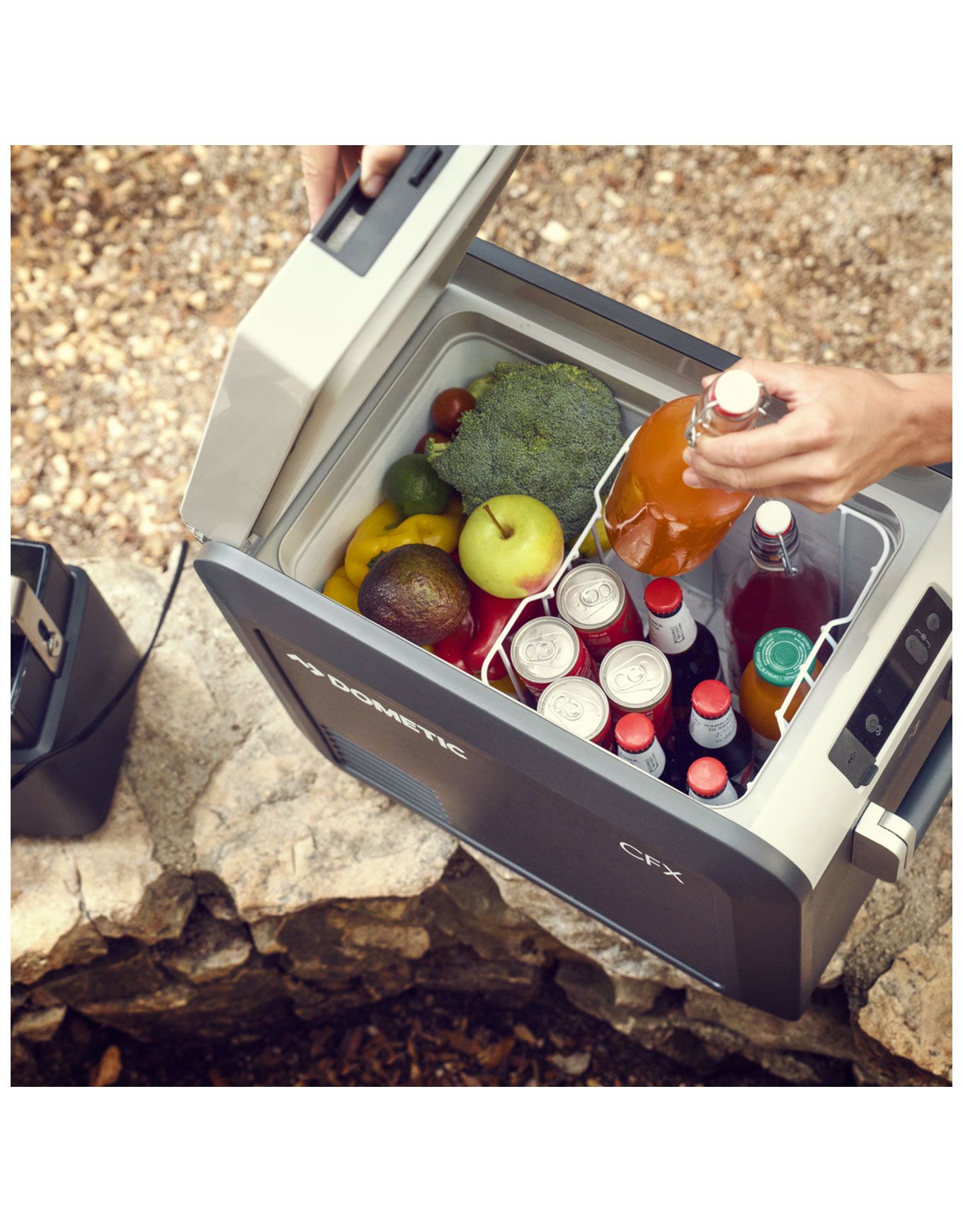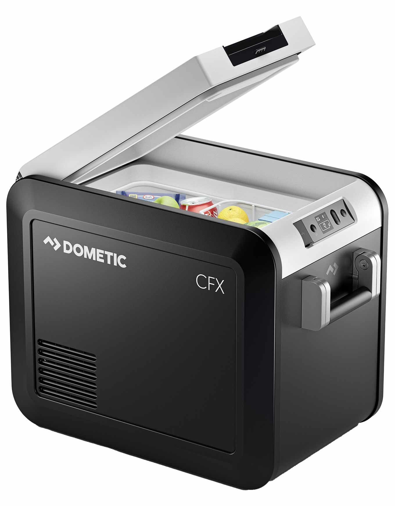 Dometic CFX3 25 : glacière électrique portable 25 L au refroidissement VMSO3 de 20 °C à –22 °C, pilotable par application ou écran tactile, accueillant 40 canettes ou 5 bouteilles 1,5 L debout pour les sorties groupe.