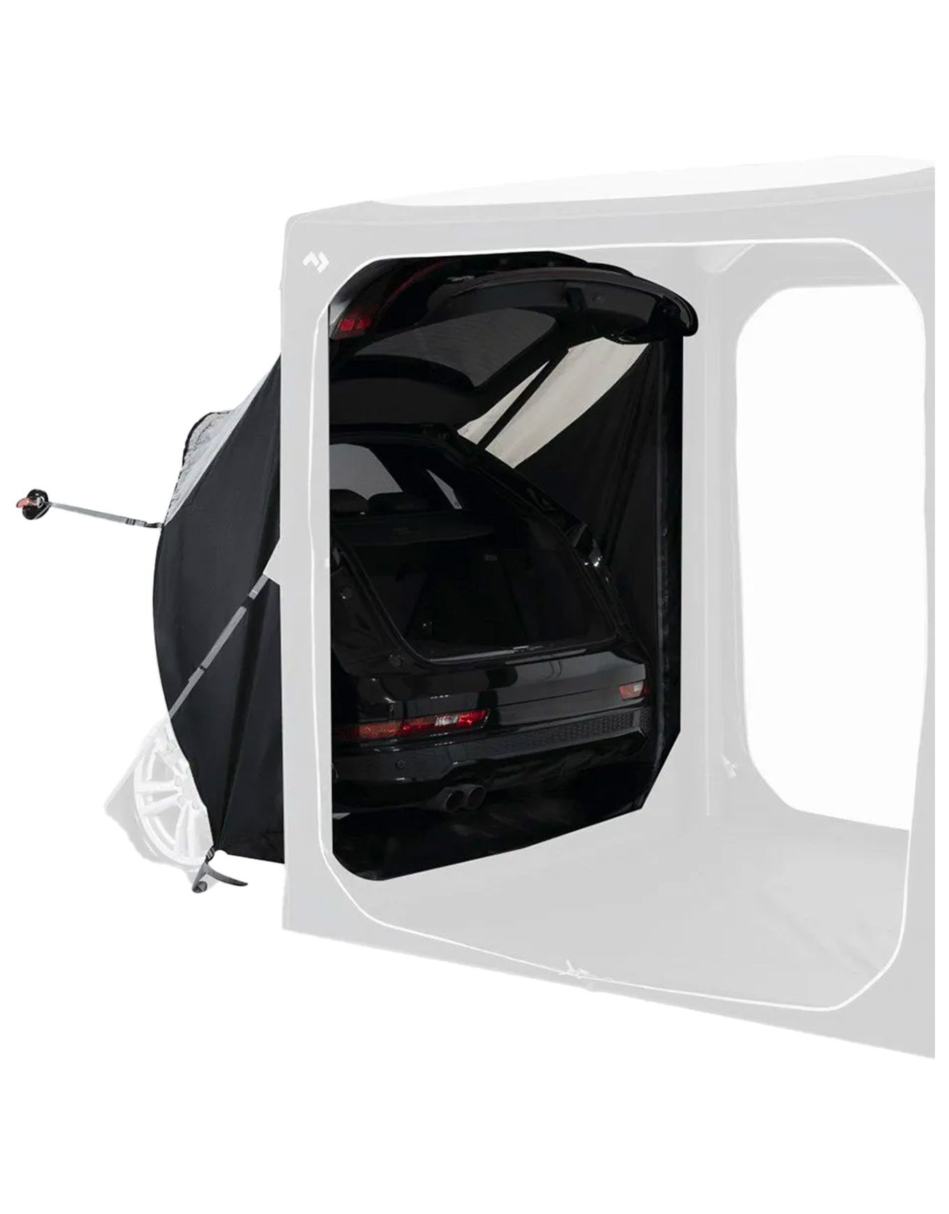 Tunnel de raccordement Dometic Hub 1.0 Suv pour connecter l’abri modulaire gonflable Hub 1.0 au coffre du véhicule par fermeture éclair, créant un sas protégé des intempéries et facilitant le passage entre espaces de vie.