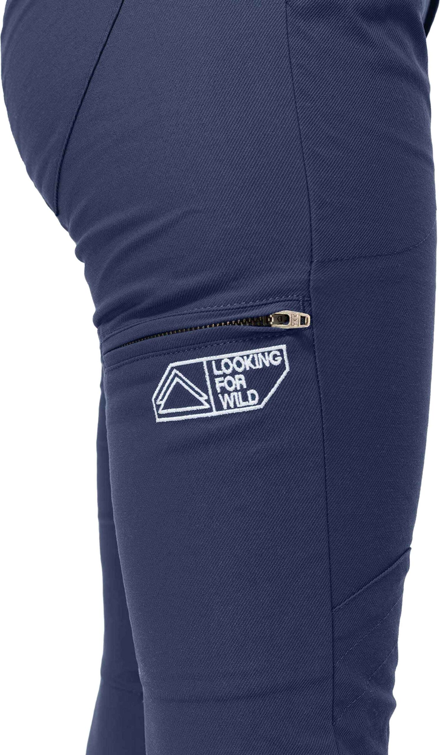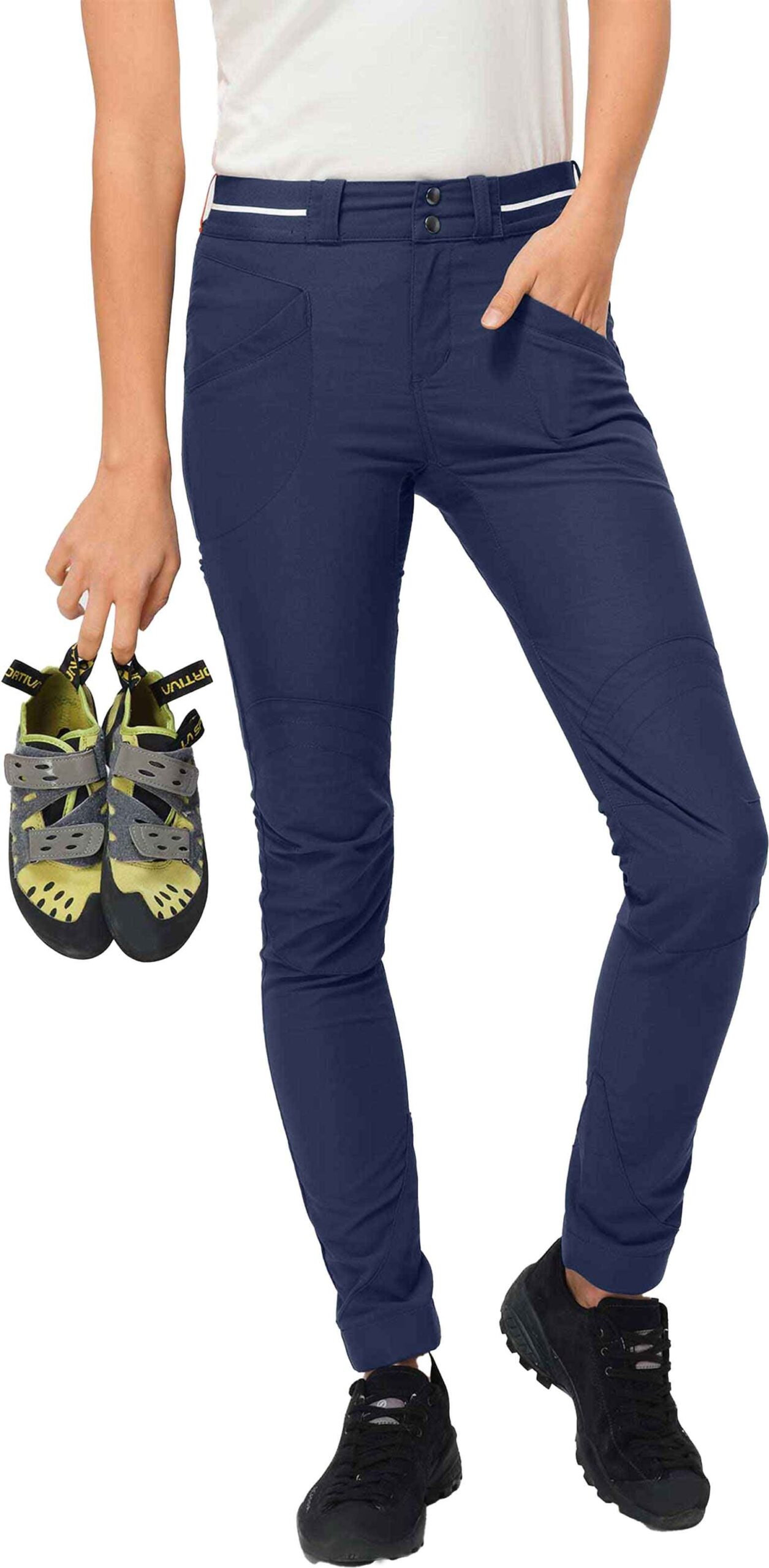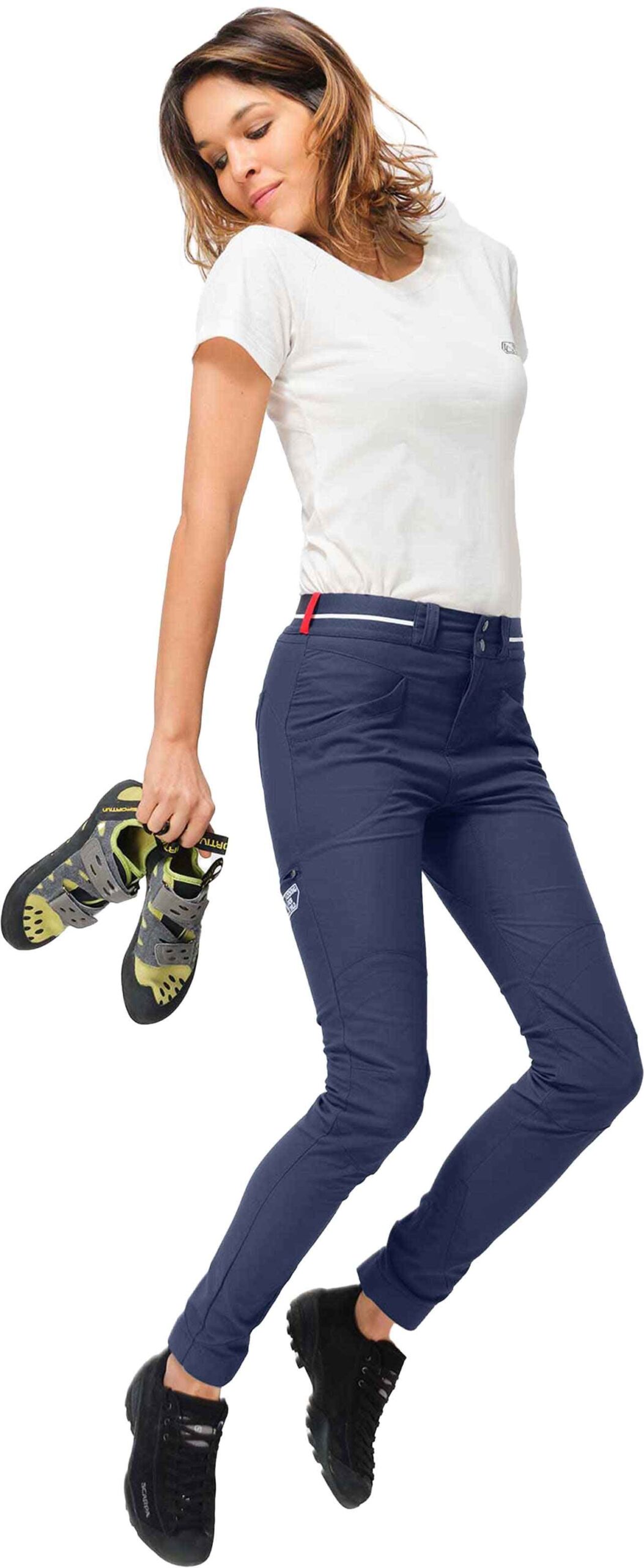 Pantalon d’escalade femme Pro Model Medieval Blue de Looking For Wild, ultra-résistant, déperlant et coupe-vent avec matière stretch pour une liberté de mouvement maximale. Renforts aux genoux et bas de jambe, taille ajustée et poches baudrier compatibles.