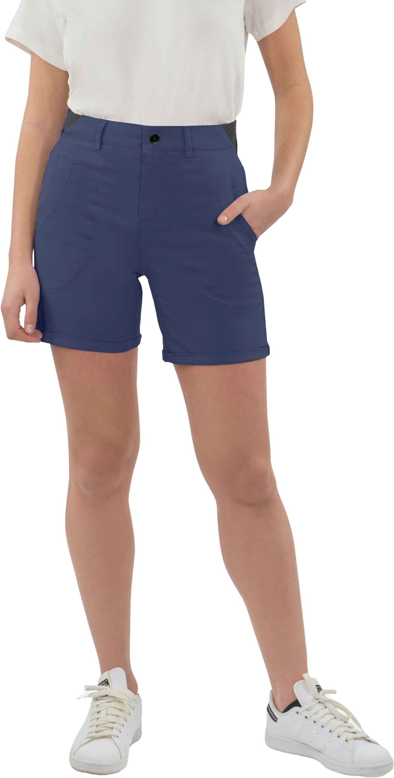 Short Bavella Medieval Blue pour femme de Looking For Wild en tissu ultra-stretch, gousset d’aisance et taille élastiquée pour liberté de mouvement et confort en escalade, voyage ou ville.