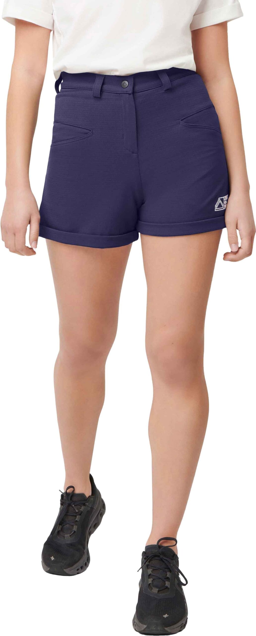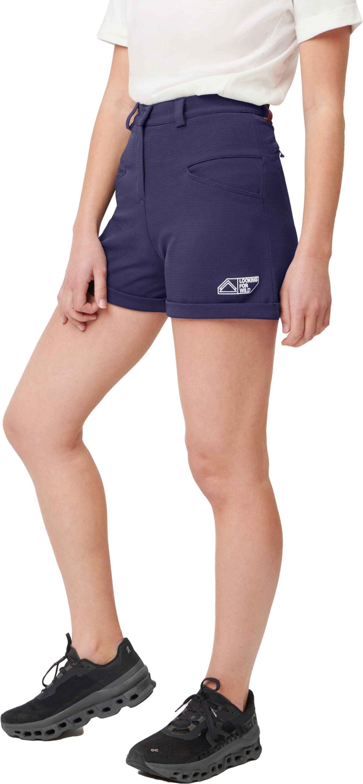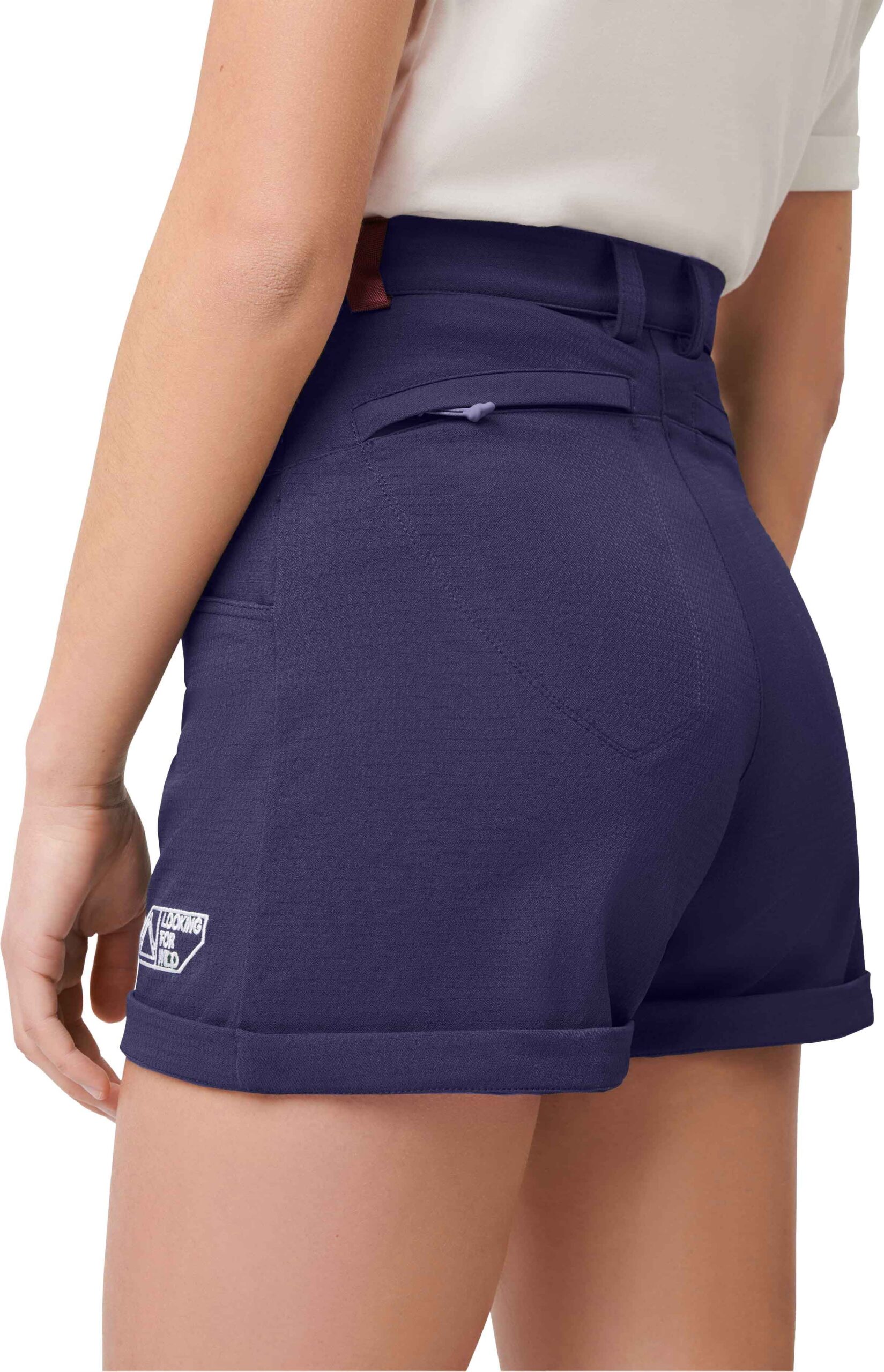 Short de trekking femme F208 Medieval Blue Looking For Wild, robuste, respirant et déperlant, avec ceinture élastique et poches fonctionnelles. Coupe ajustée stretch pour confort et liberté de mouvement sur tout terrain.