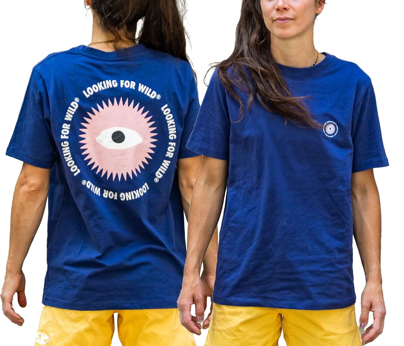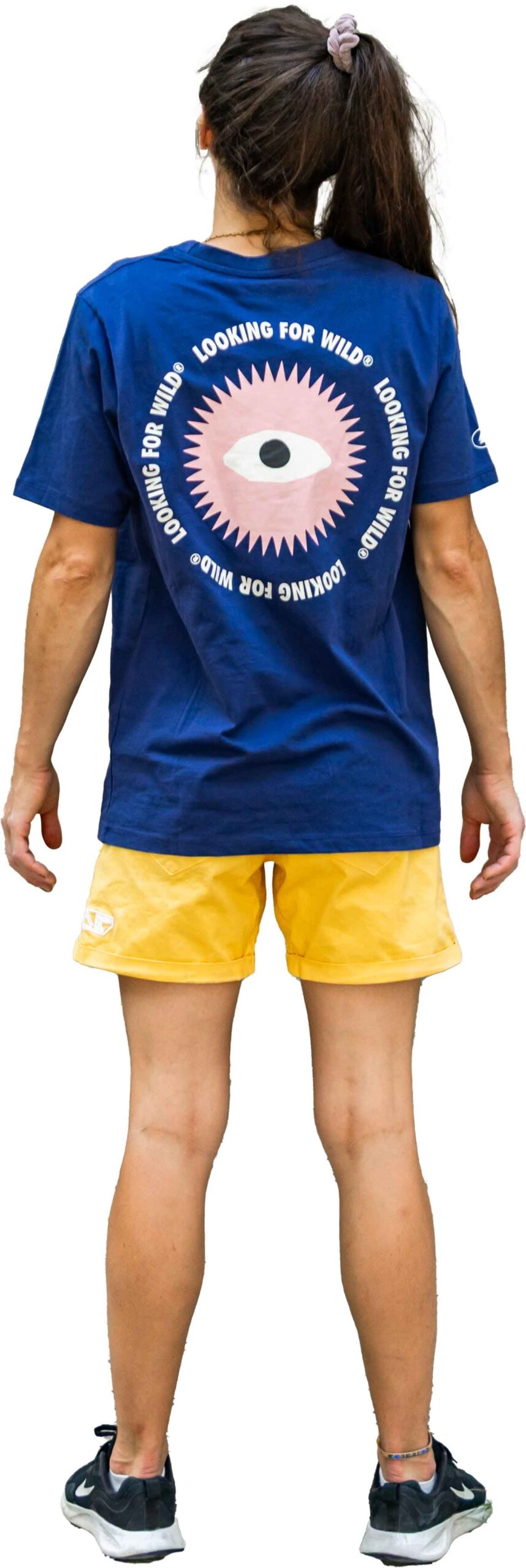 T-shirt Eye Sun Deep Cobalt femme Looking For Wild en coton biologique 100 %, respirant et doux pour l’escalade en salle ou en falaise. Sa coupe ajustée et sa sérigraphie originale au dos affichent votre passion avec style et confort.