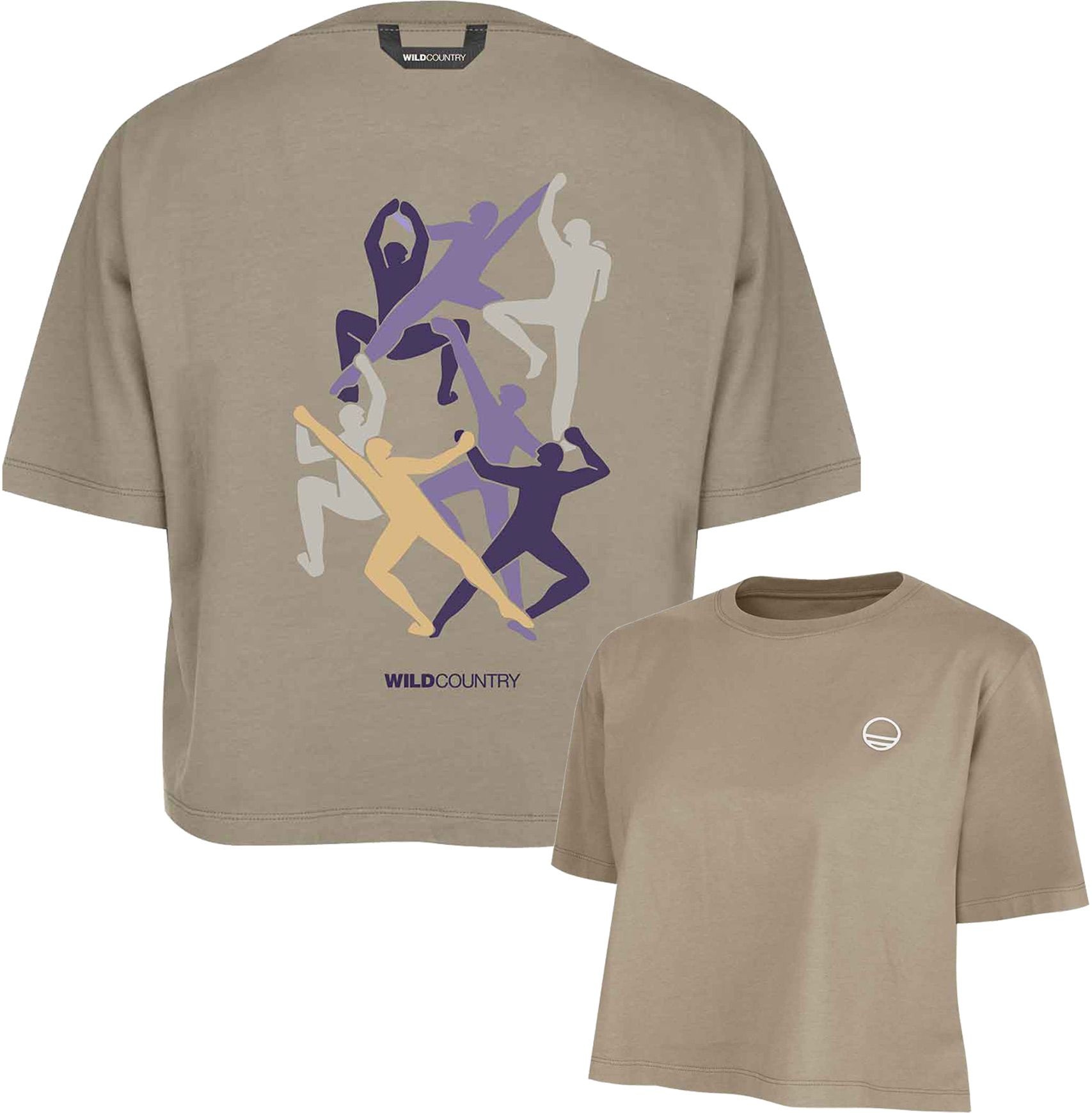 Tee-shirt d’escalade femme Wild Country Sequence Brindle, créé avec l’artiste grimpeuse Maria Nagni : coton biologique, coupe courte tendance, grande liberté de mouvement et grand imprimé inspiré de l’art de l’escalade.