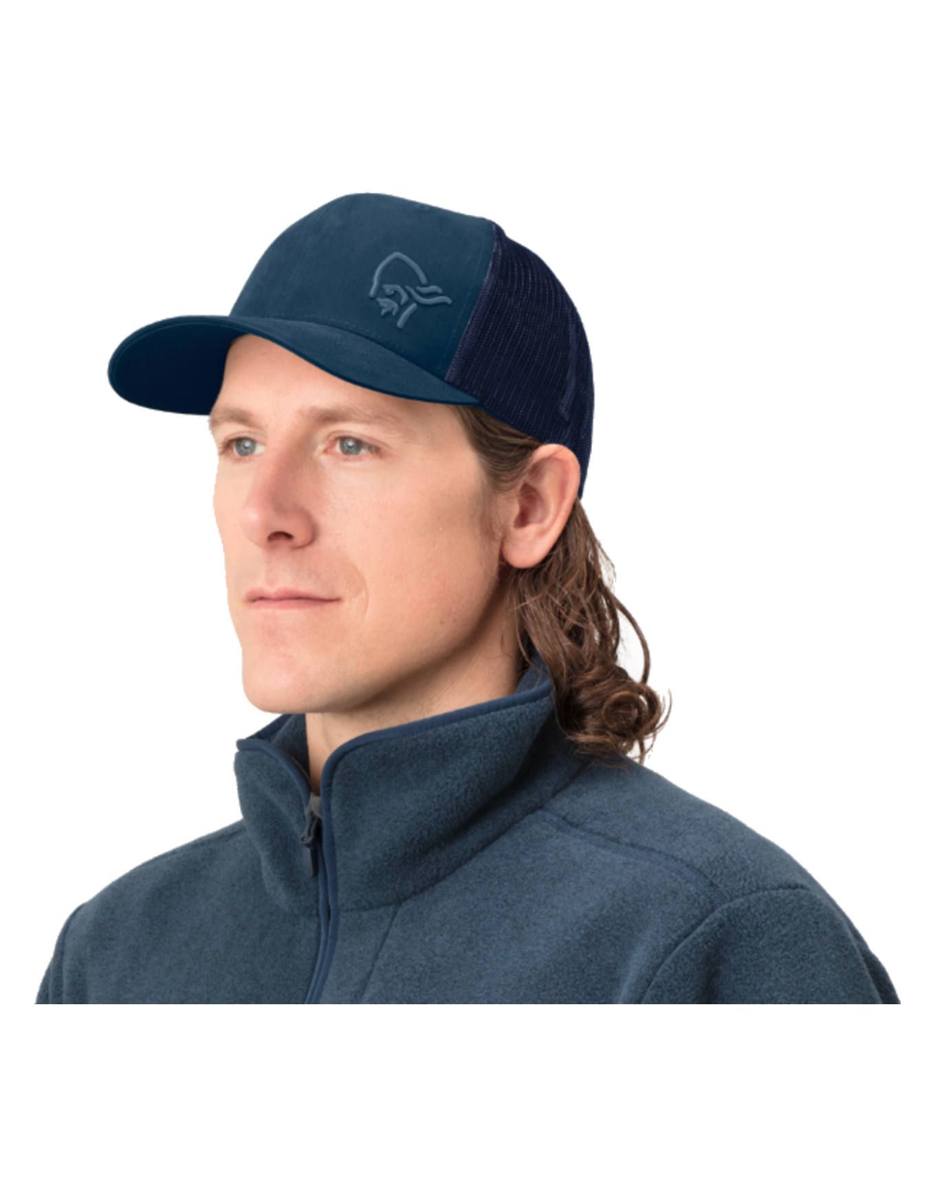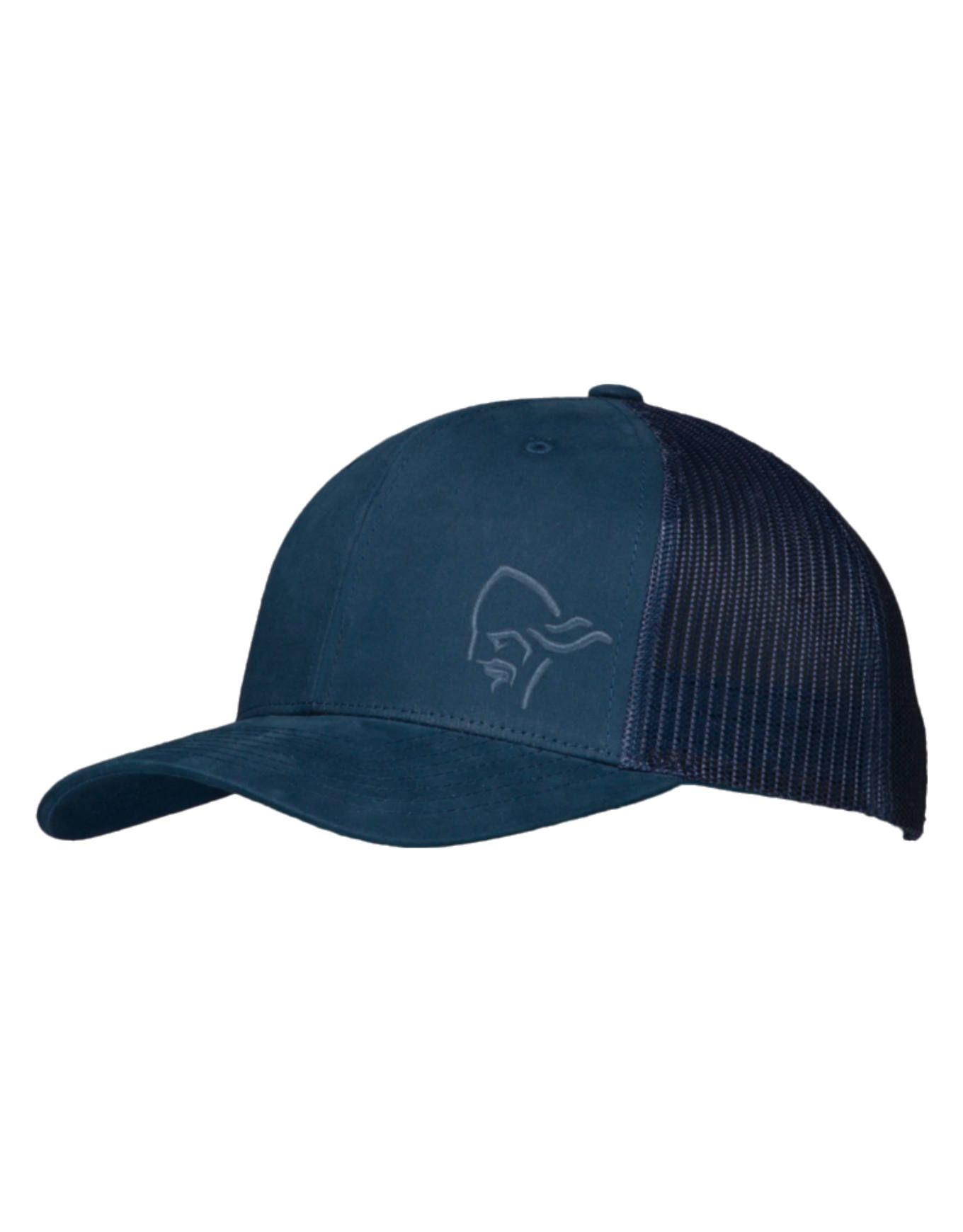 Casquette unisexe Norrona 29 Trucker Mesh Snap Back Cap Indigo Night, visière courbée et panneaux mesh pour une protection solaire et une aération optimales en ville ou sur les sentiers.