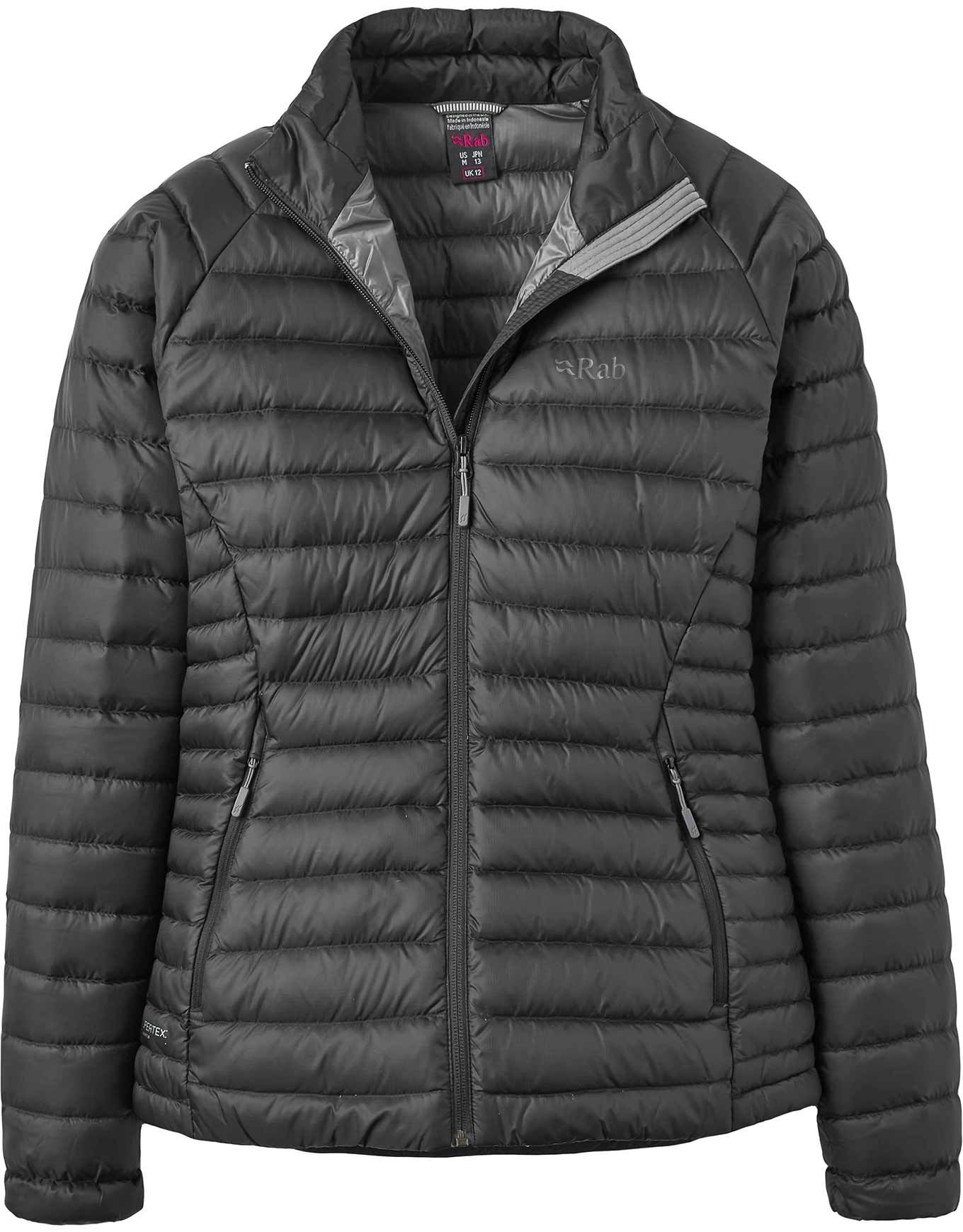 Doudoune Rab Microlight Black femme en Pertex Quantum® avec duvet hydrophobe, offrant chaleur légère, protection coupe-vent et matières recyclées pour l’alpinisme et la randonnée.